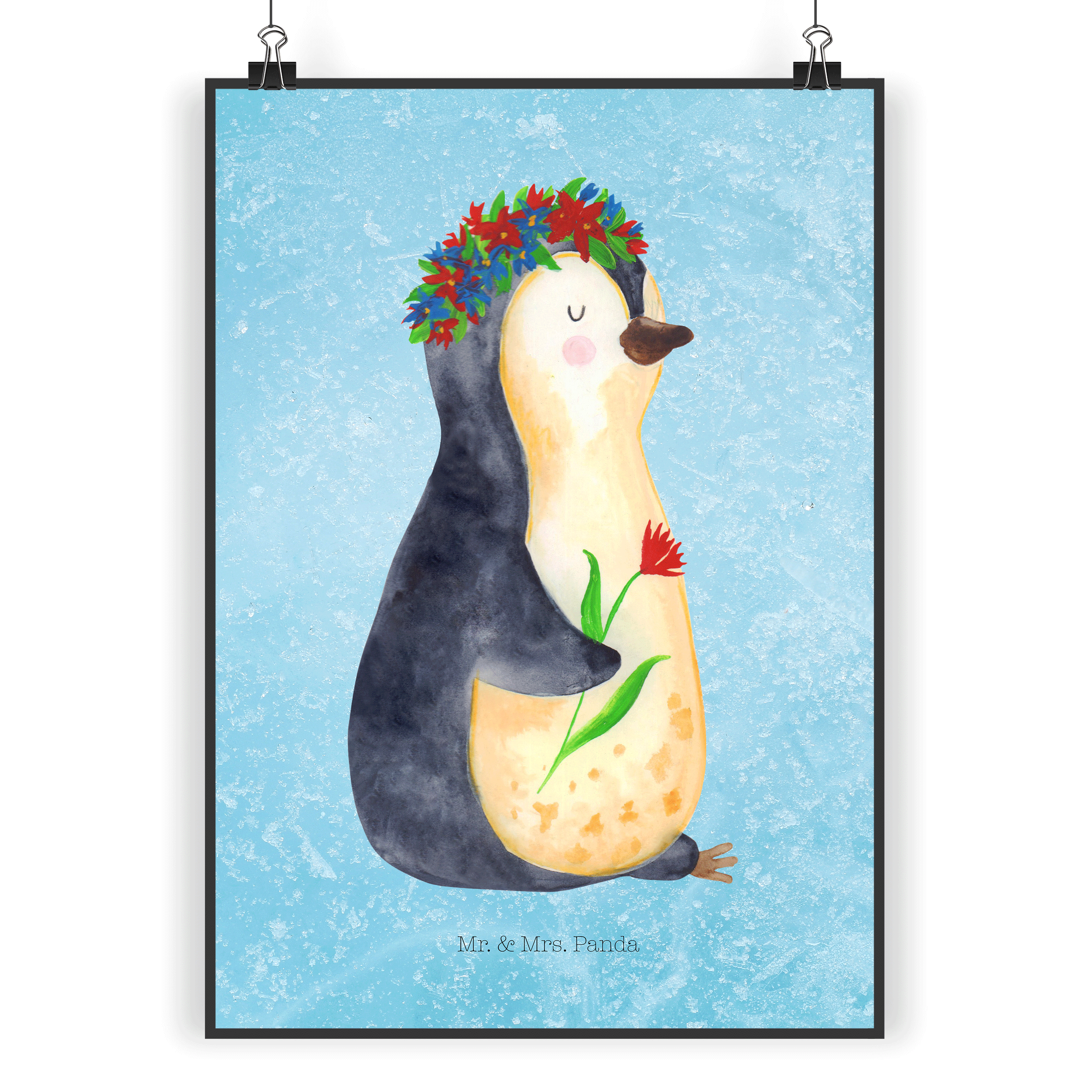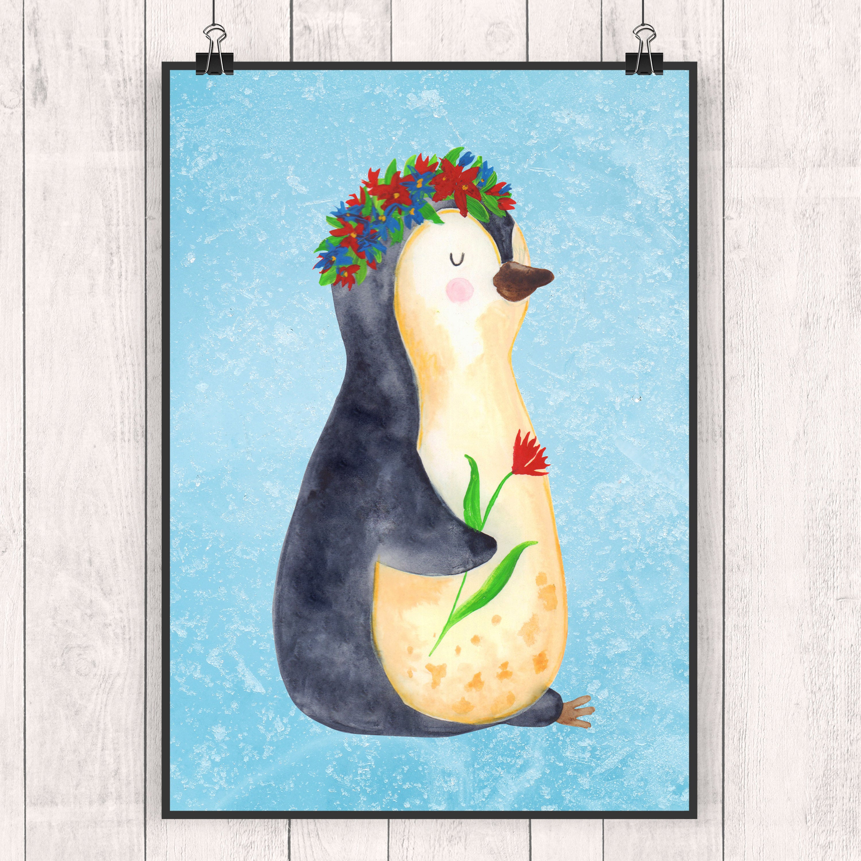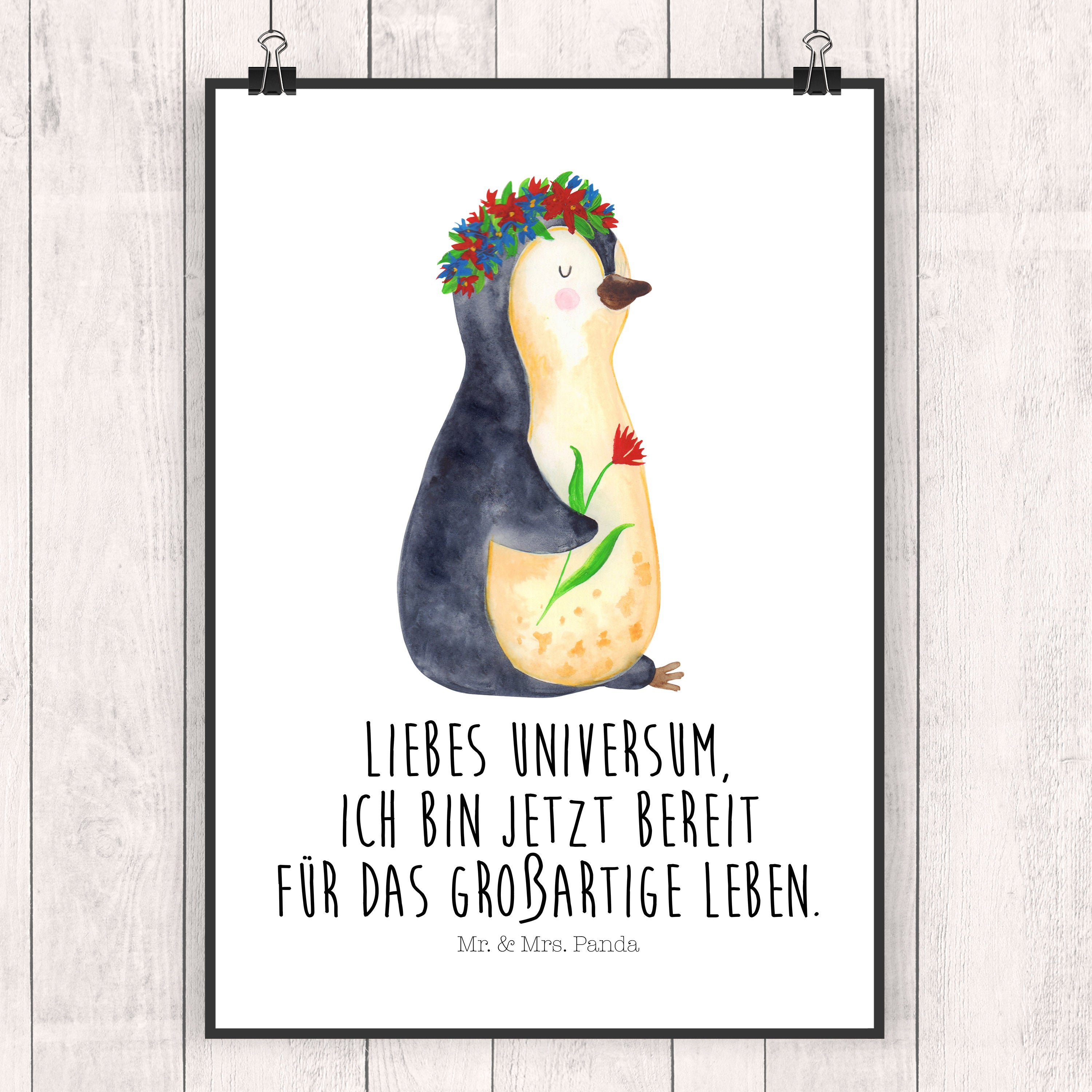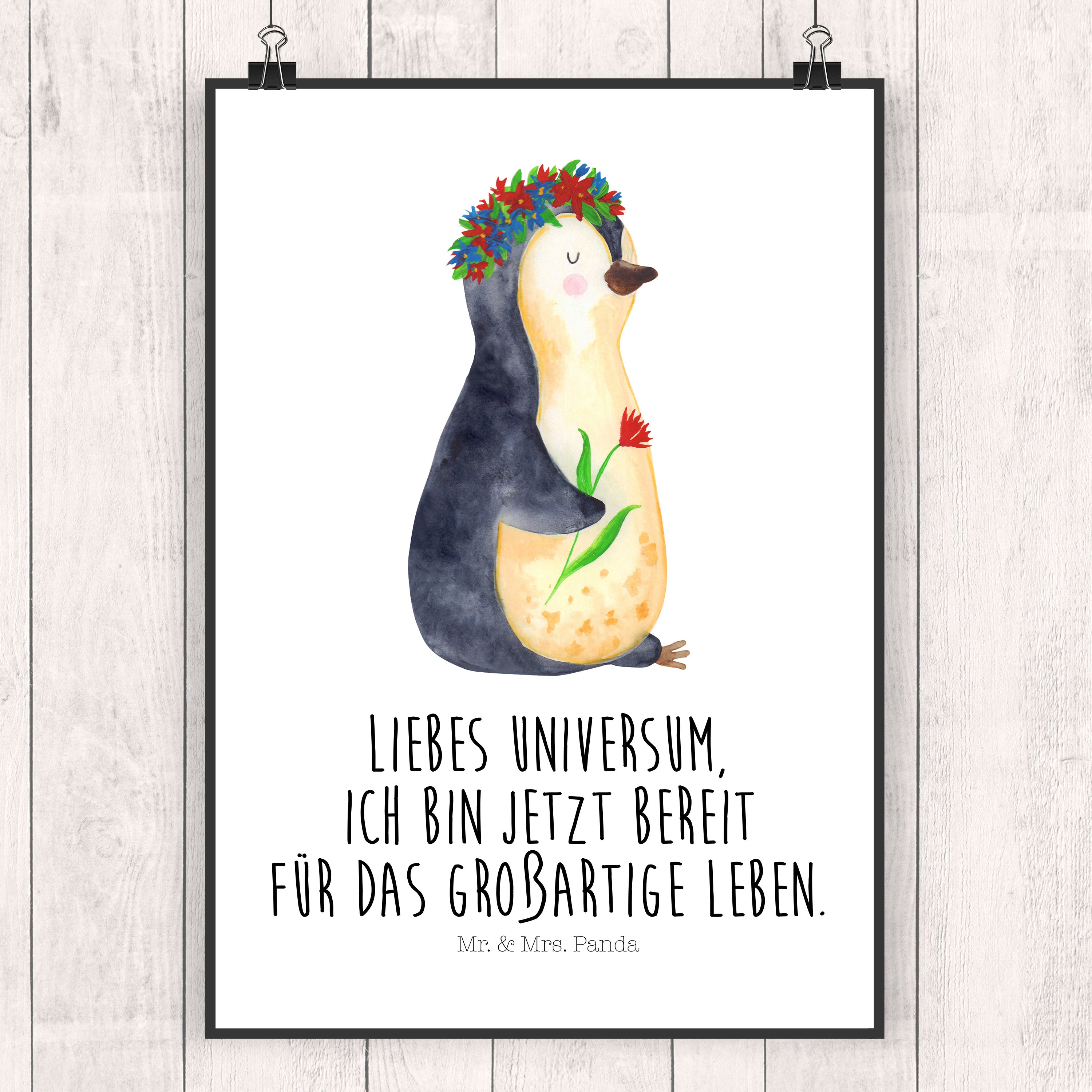 Poster Pinguin Blumenkranz Poster, Wandposter, Bild, Wanddeko, Küchenposter, Kinderposter, Wanddeko Bild, Raumdekoration, Wanddekoration, Handgemaltes Poster, Mr. & Mrs. Panda Poster, Designposter, Kunstdruck, Posterdruck, Pinguin, Pinguine, Blumenkranz, Universum, Leben, Wünsche, Ziele, Lebensziele, Motivation, Lebenslust, Liebeskummer, Geschenkidee