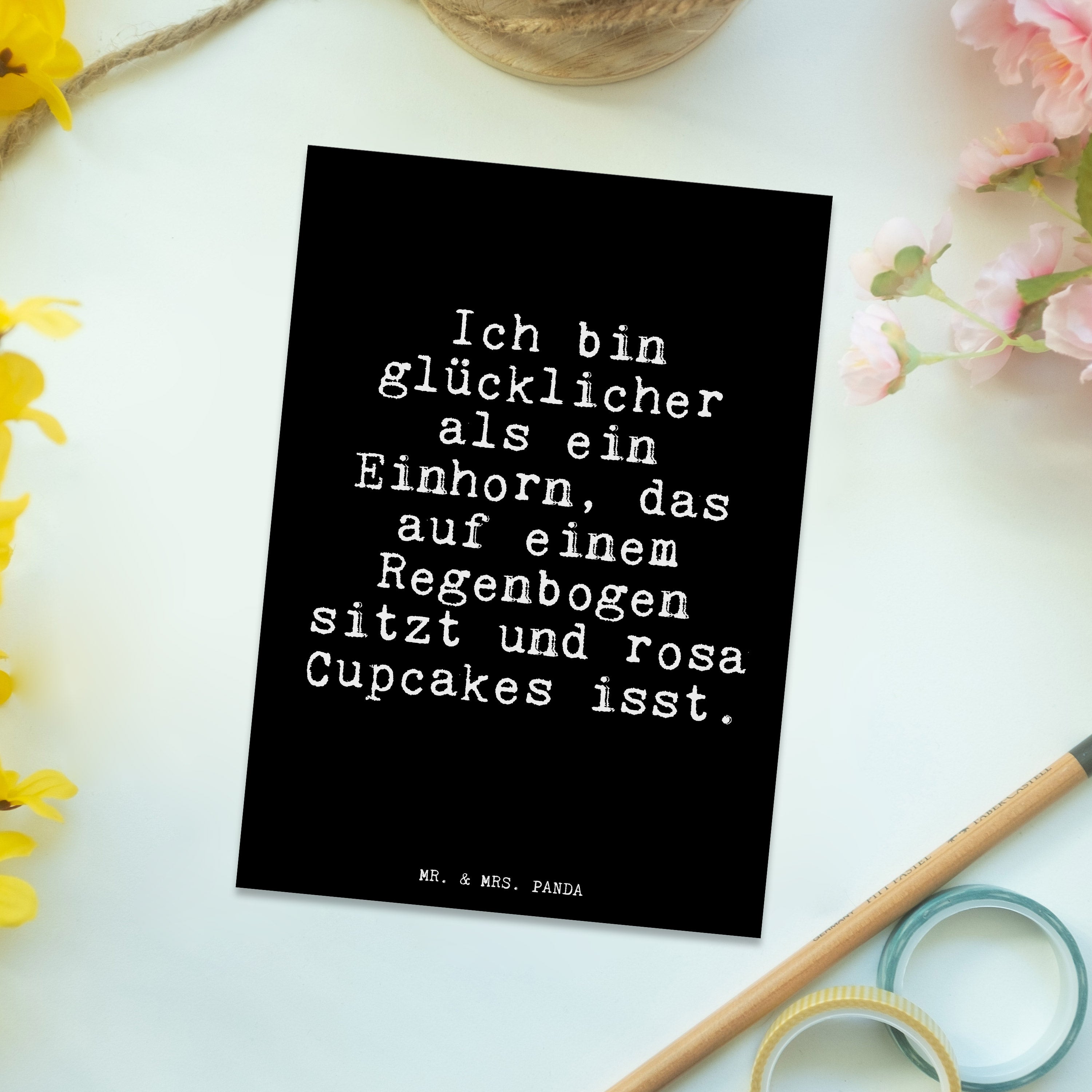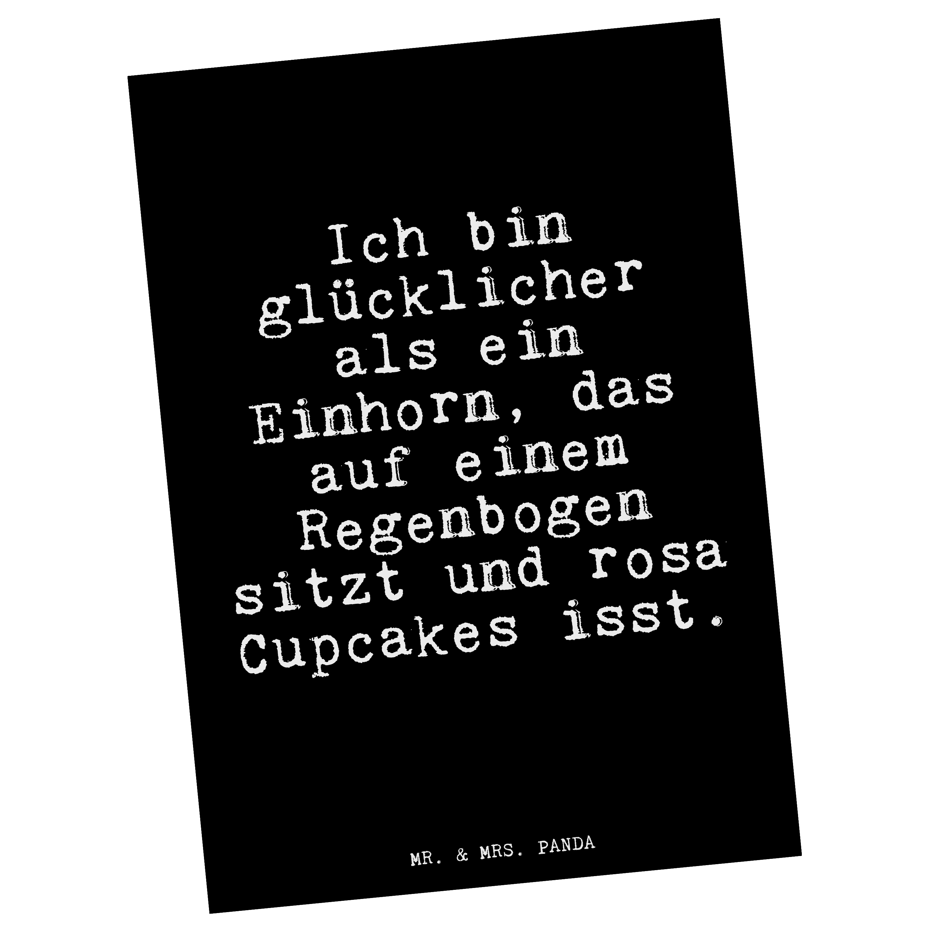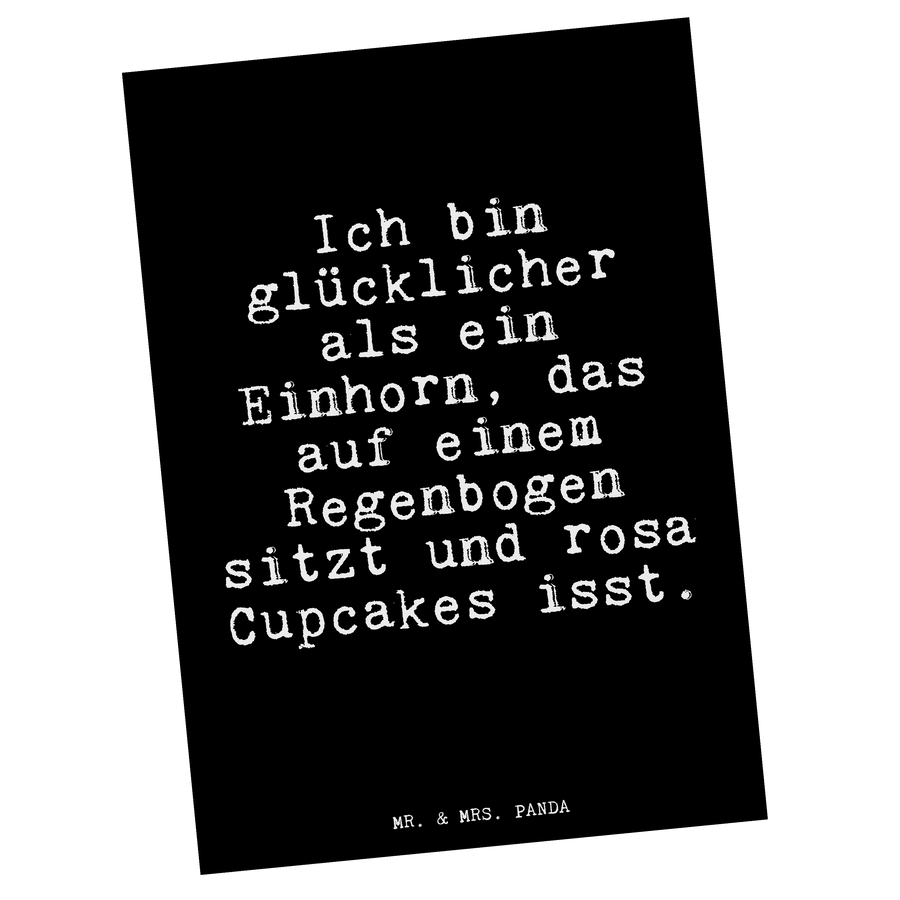 Postkarte Fun Talk Ich bin glücklicher als ein Einhorn, das auf einem Regenbogen sitzt und rosa Cupcakes isst.