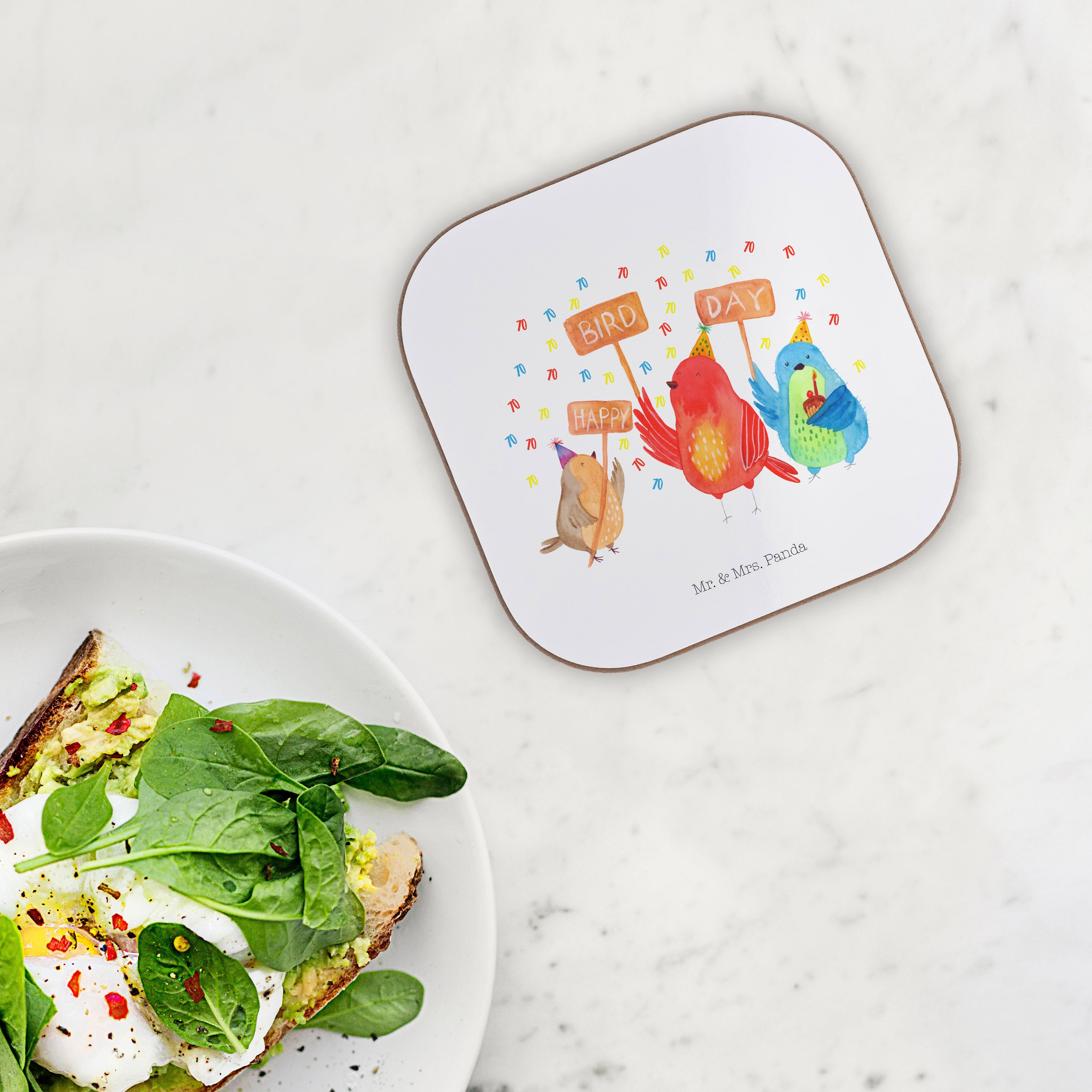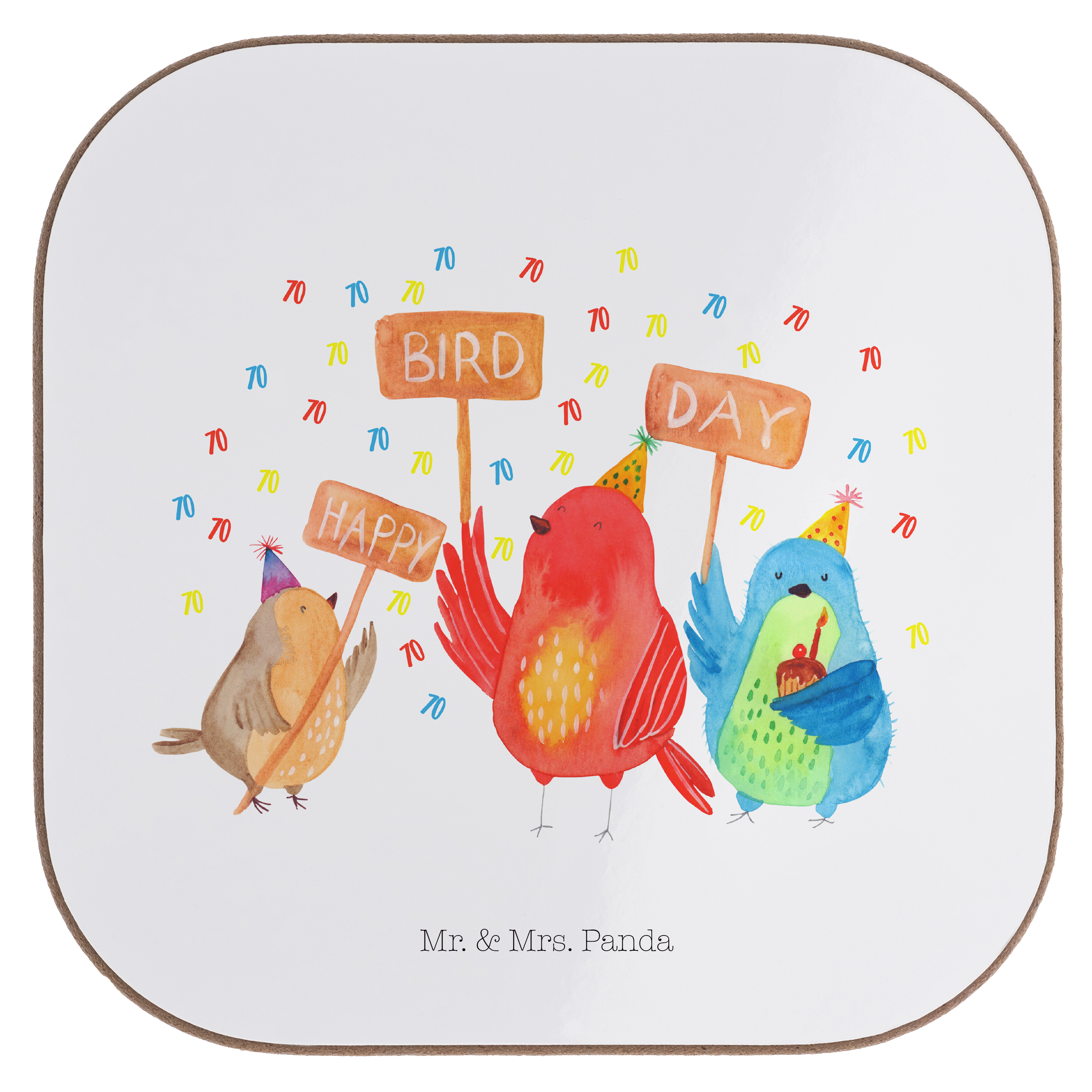 Quadratische Untersetzer 70. Geburtstag Happy Bird Day - mit Spruch