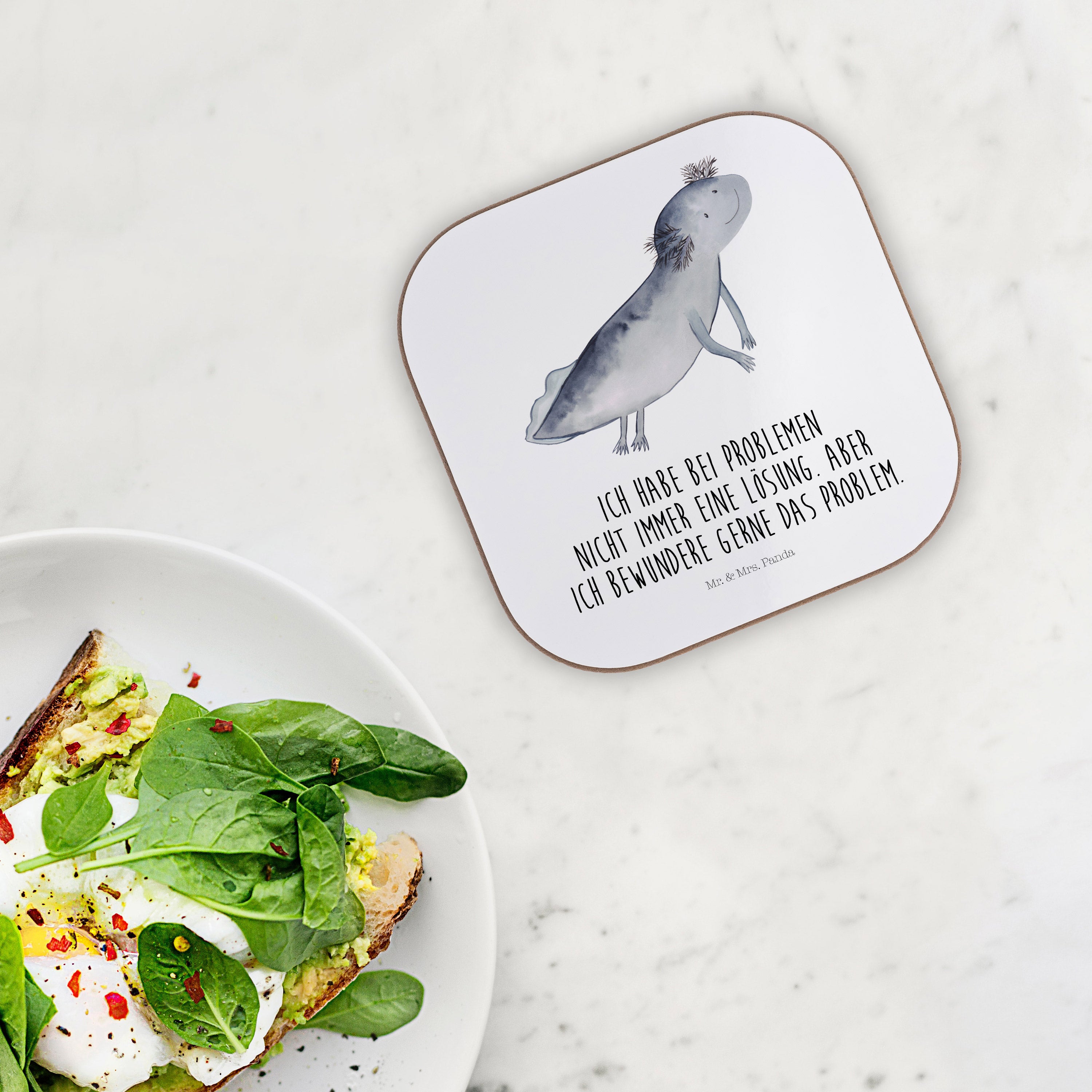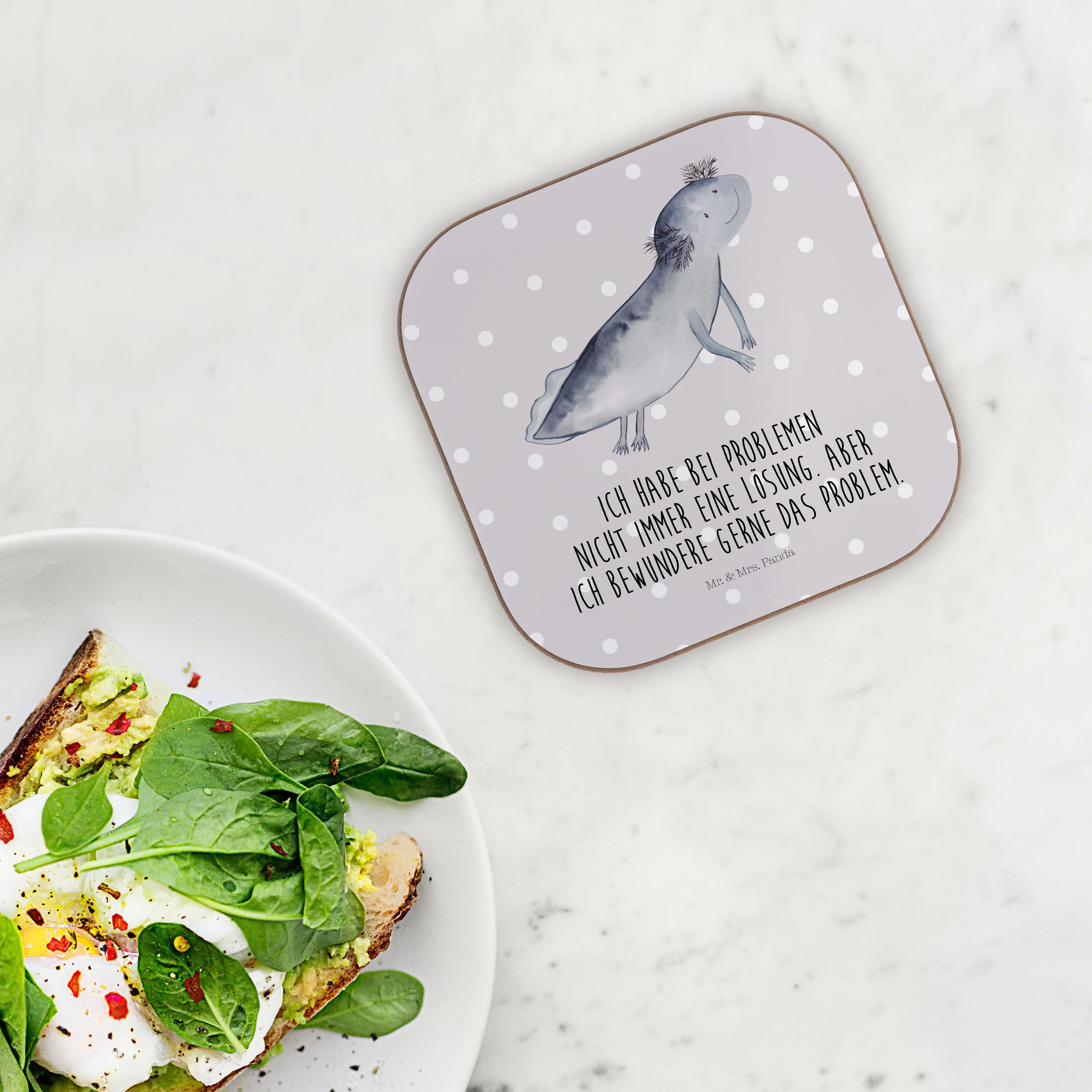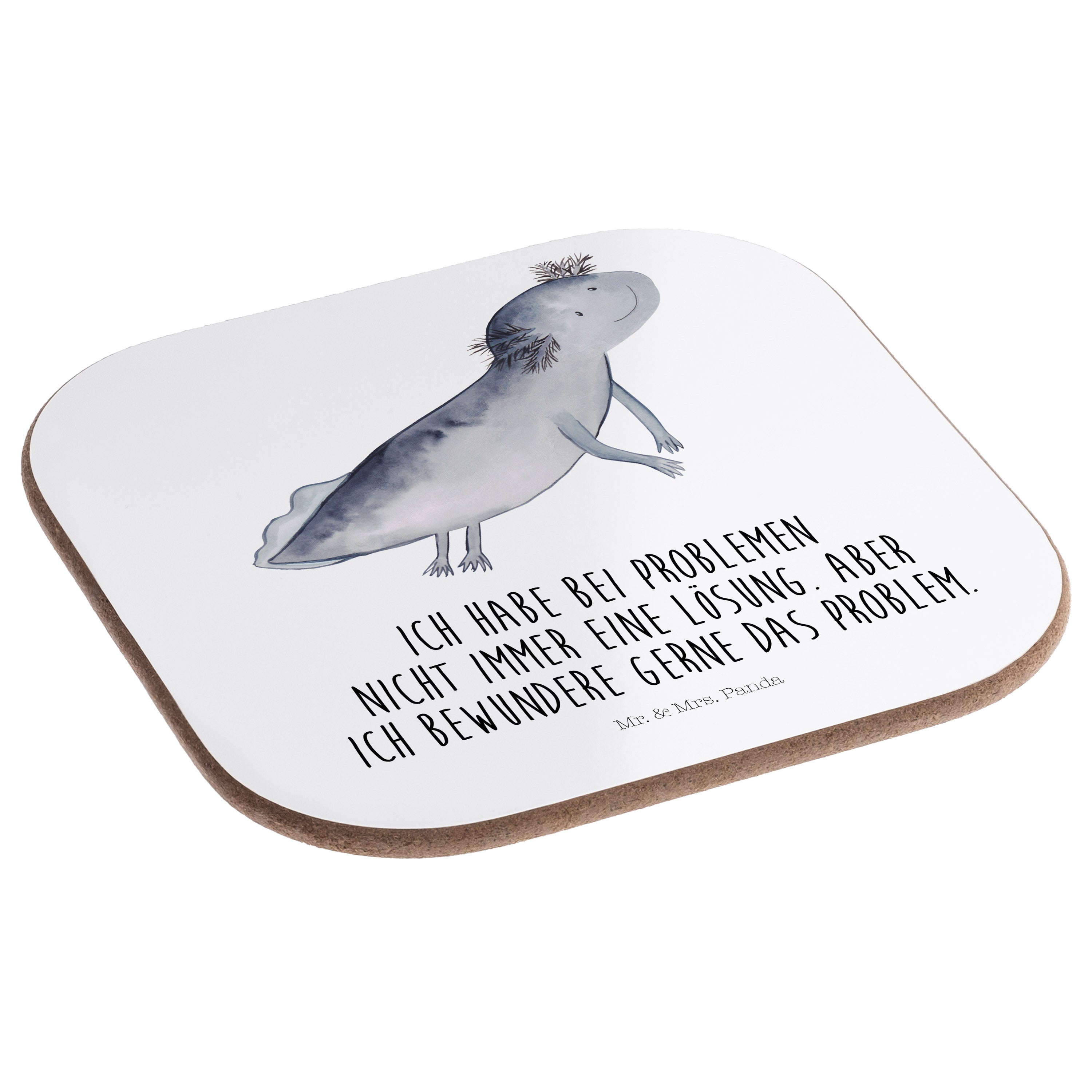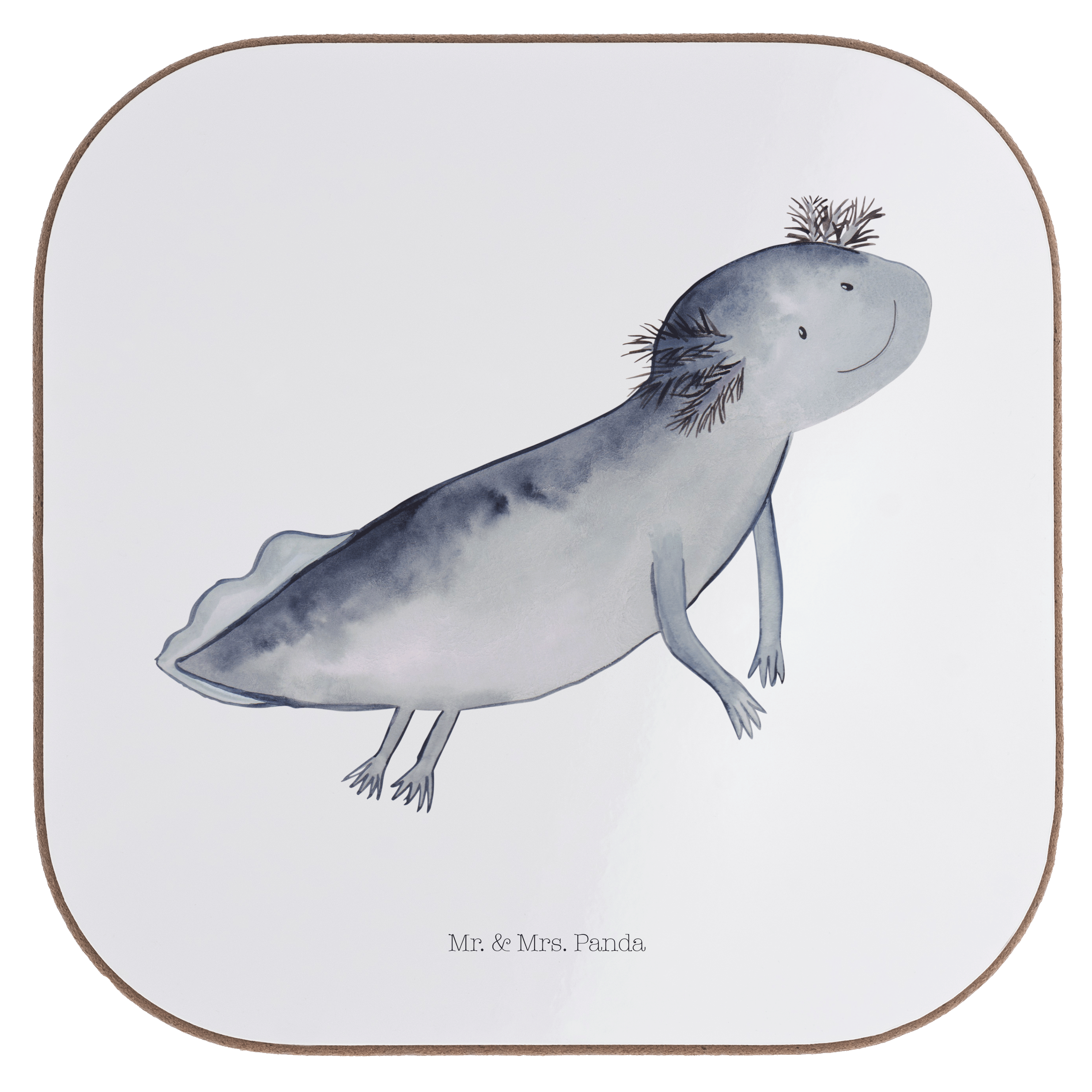 Quadratische Untersetzer Axolotl schwimmt - mit Spruch - Grau Pastell