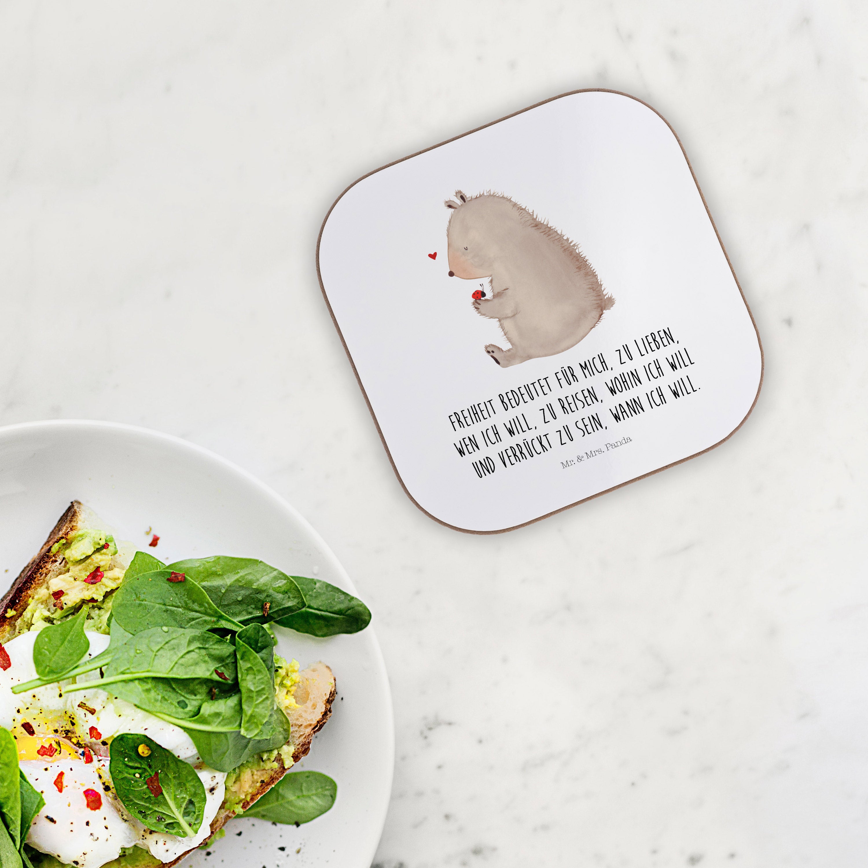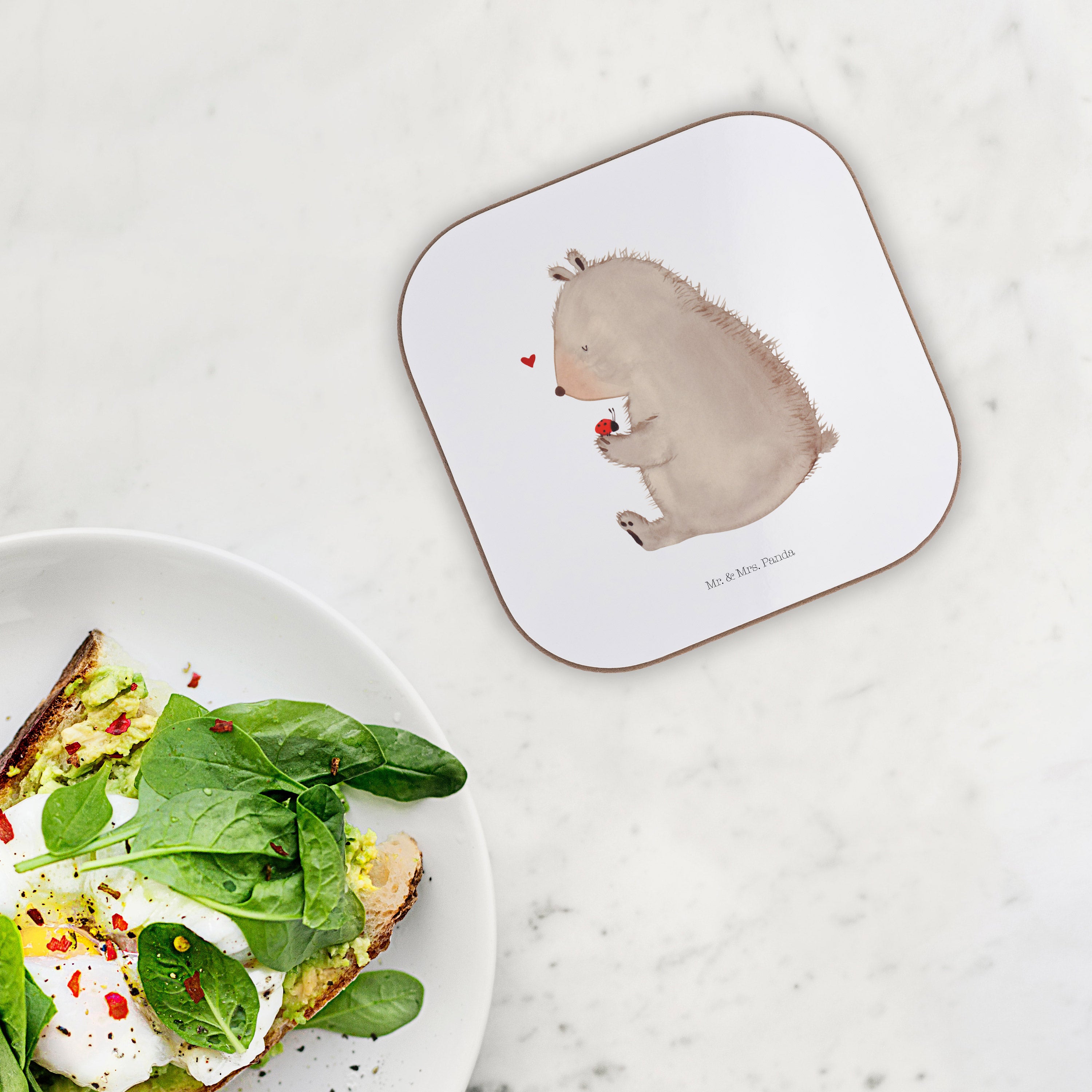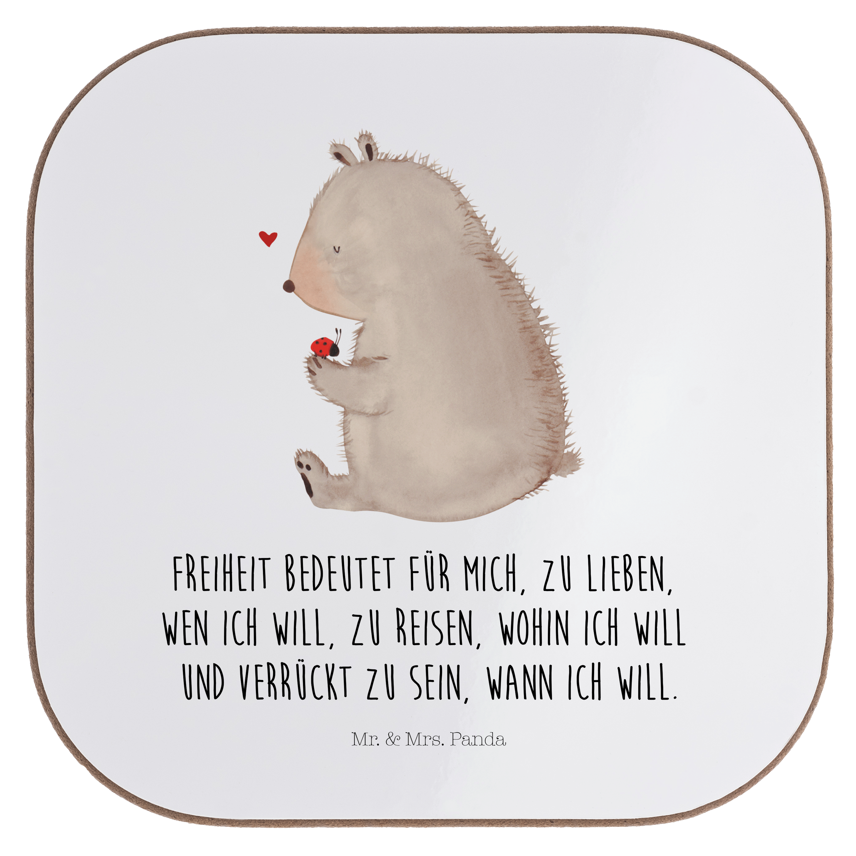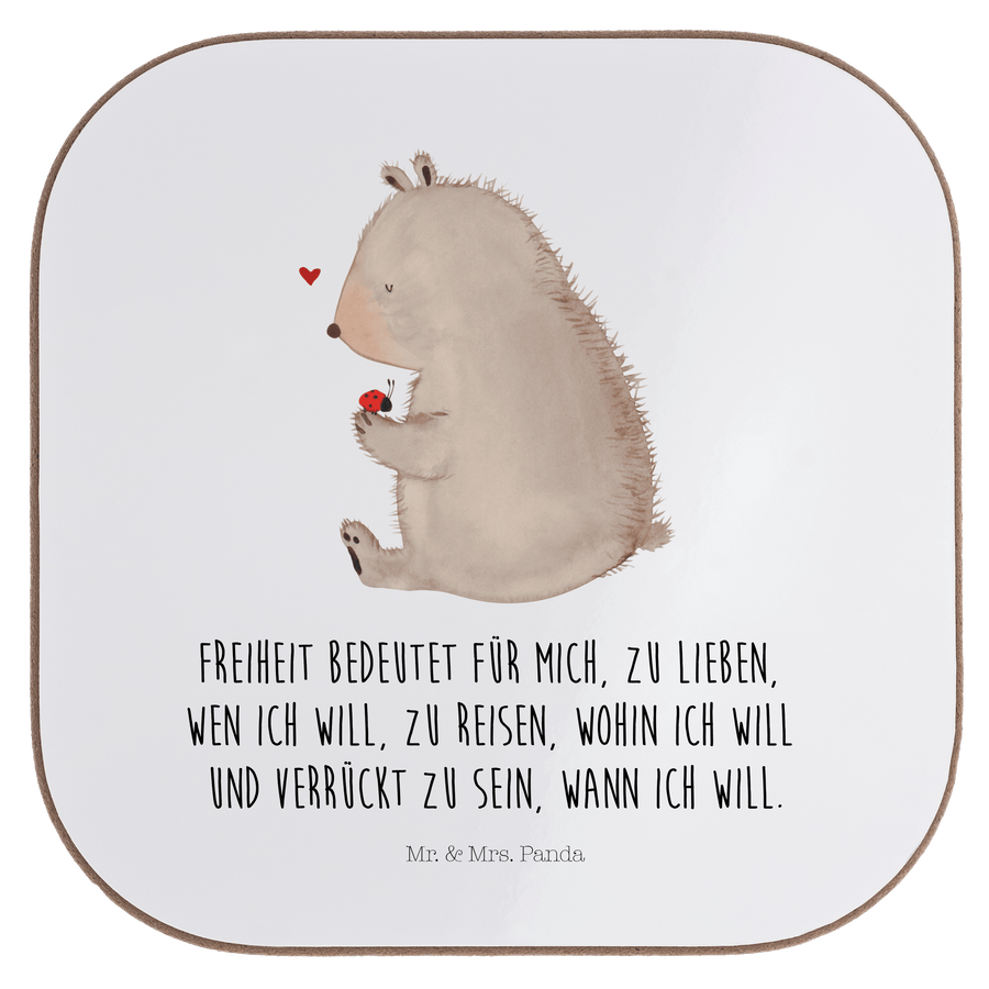Quadratische Untersetzer Bär mit Marienkäfer Bierdeckel, Glasuntersetzer, Untersetzer Gläser, Getränkeuntersetzer, Bär, Teddy, Teddybär, Marienkäfer, Liebe, Freiheit, Motivation, Das Leben ist schön