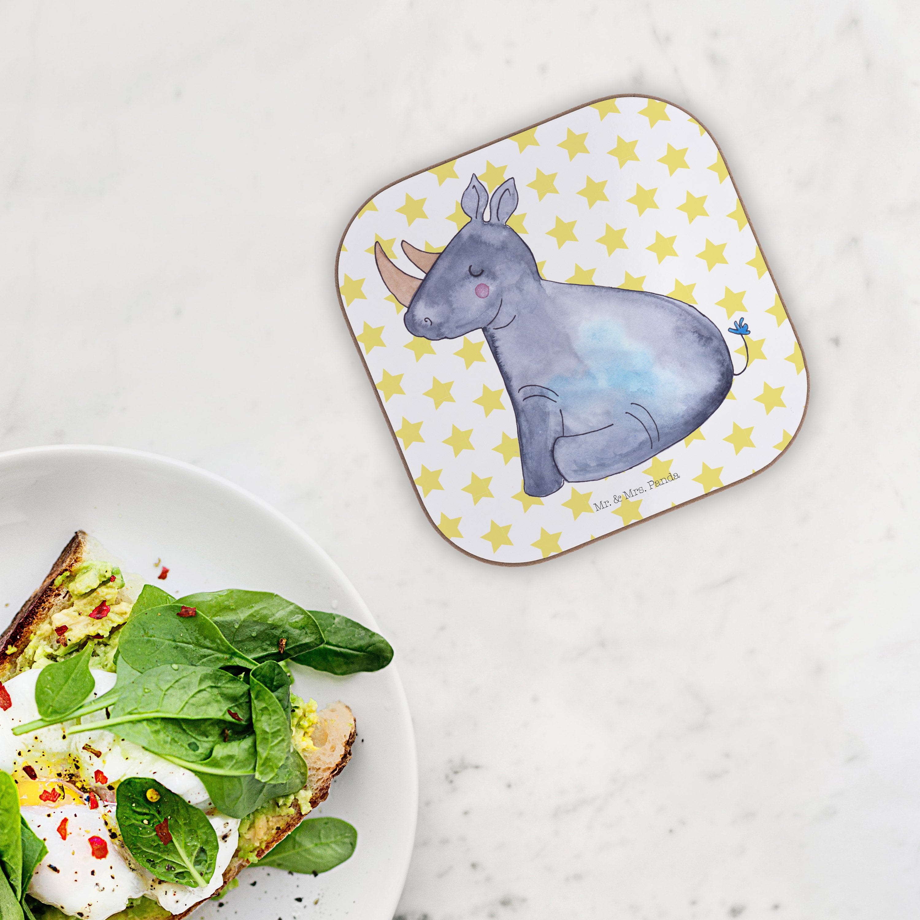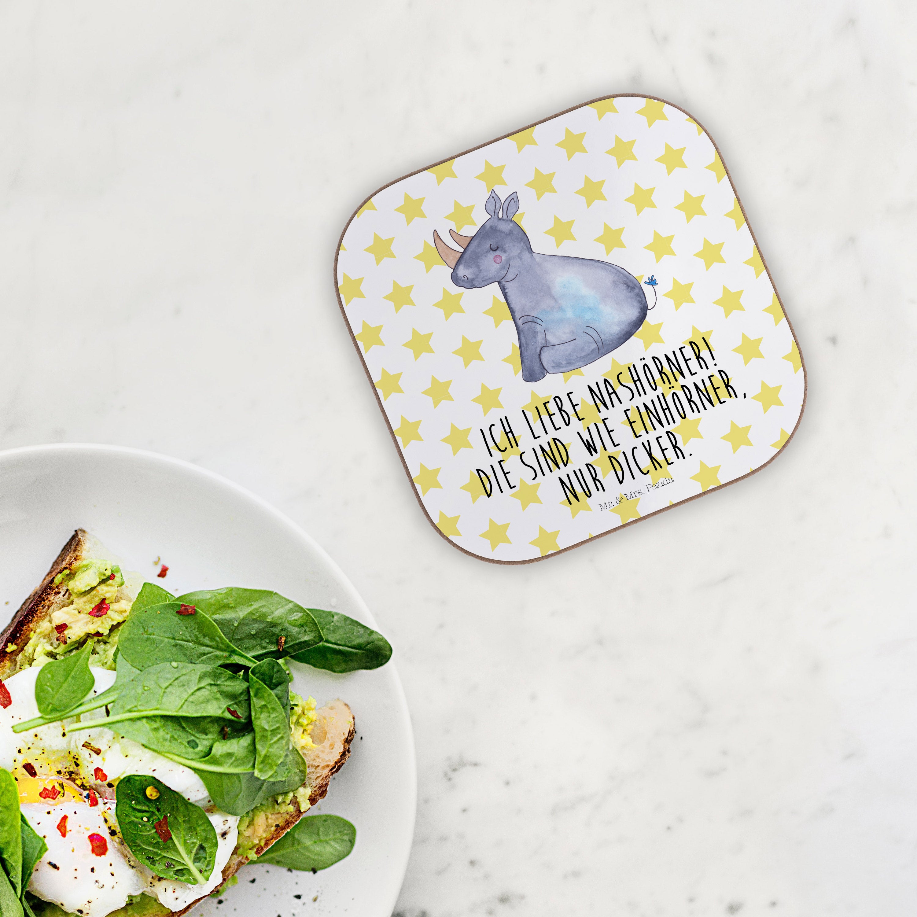 Das glückliche Nashorn zeigt: Einhörner sind gar nicht so selten. Sie sind eben nur ein bisschen dicker. Das perfekte Motiv, um ein Schmunzeln zu erzwingen.