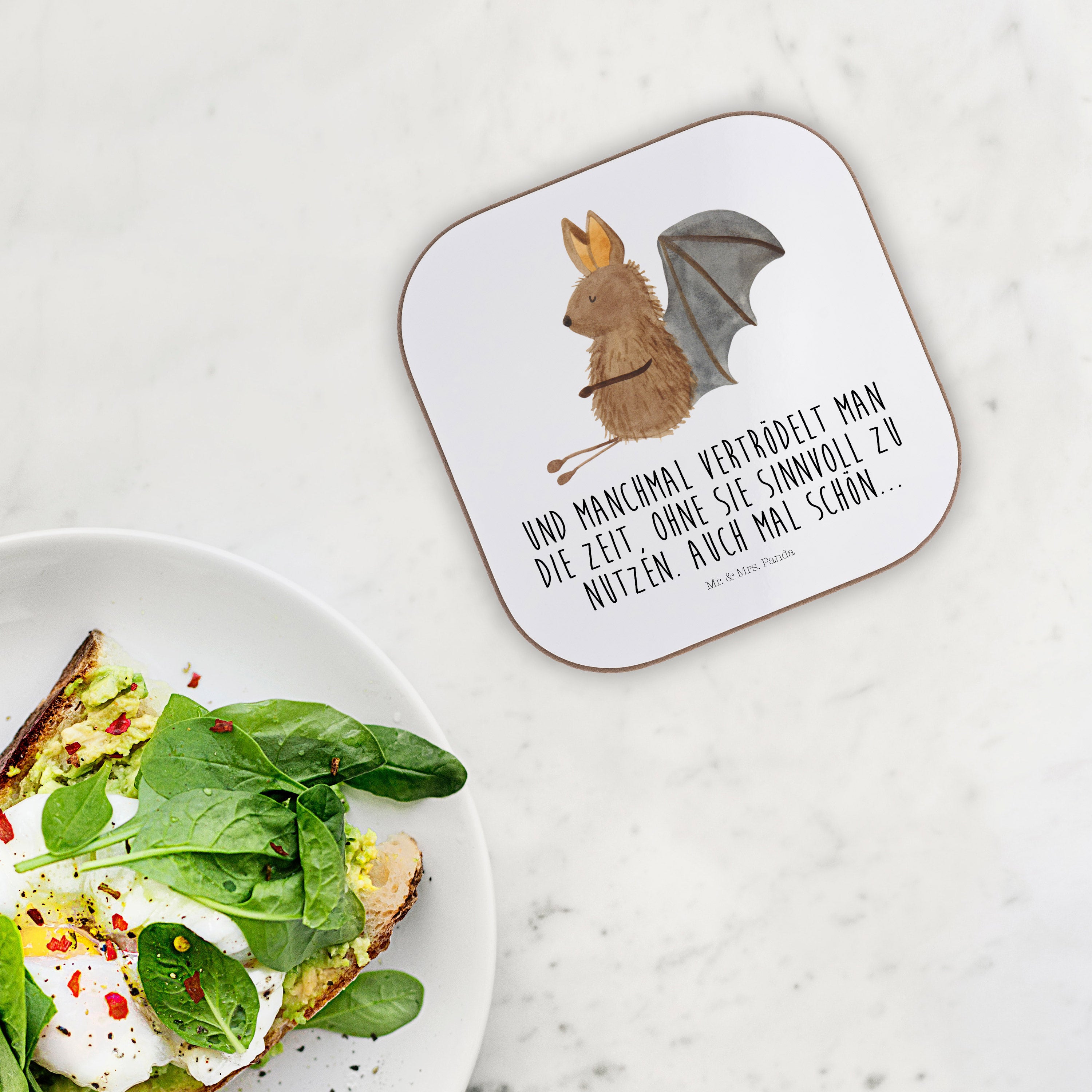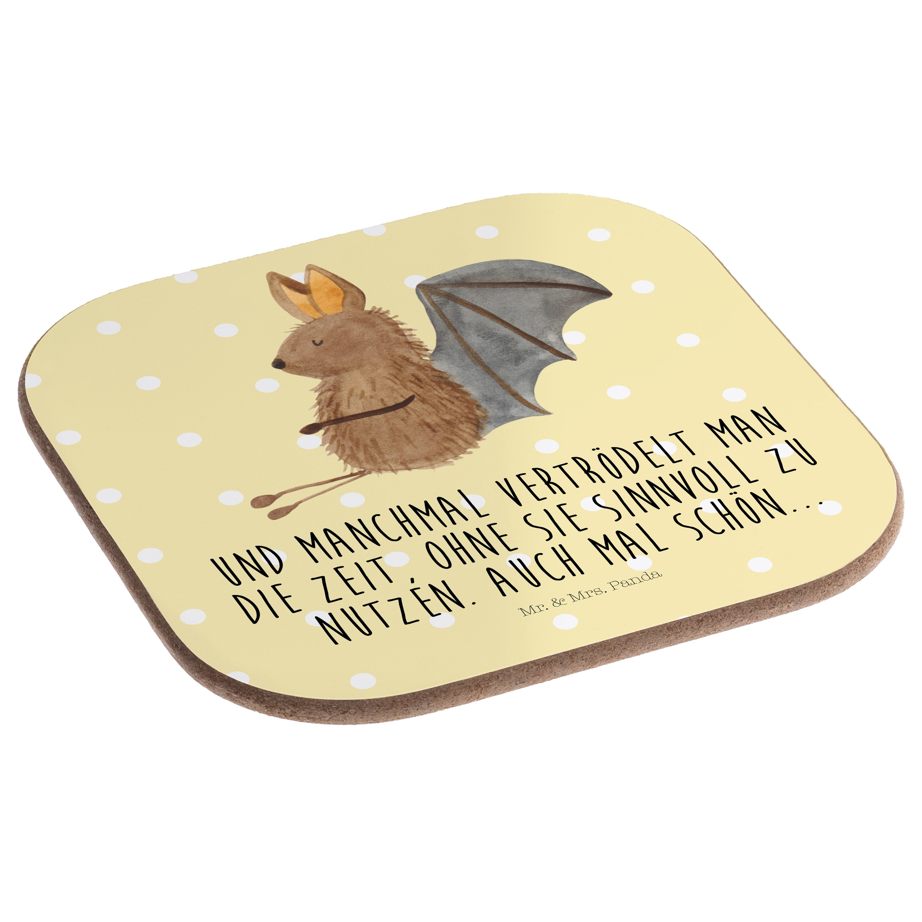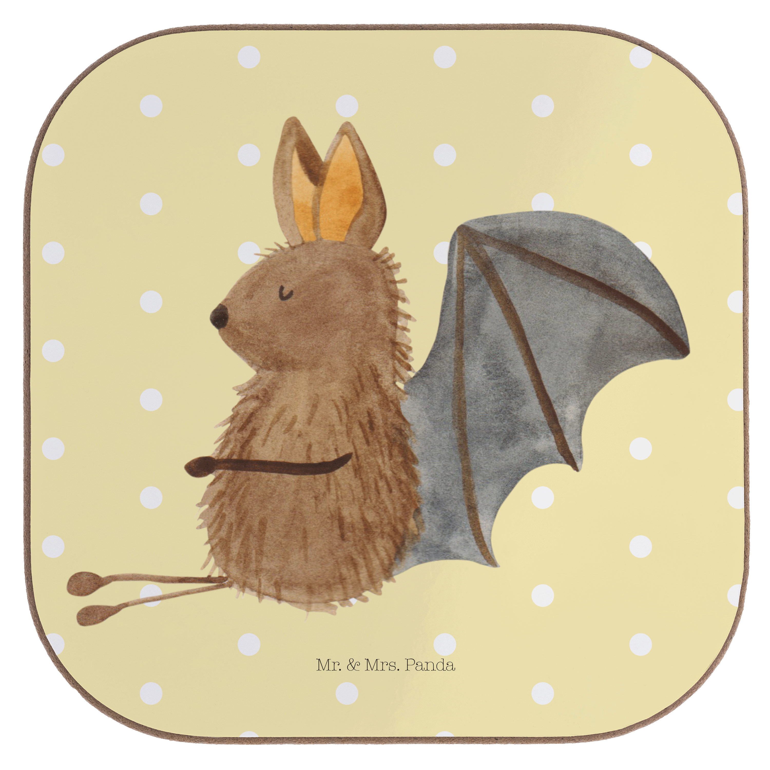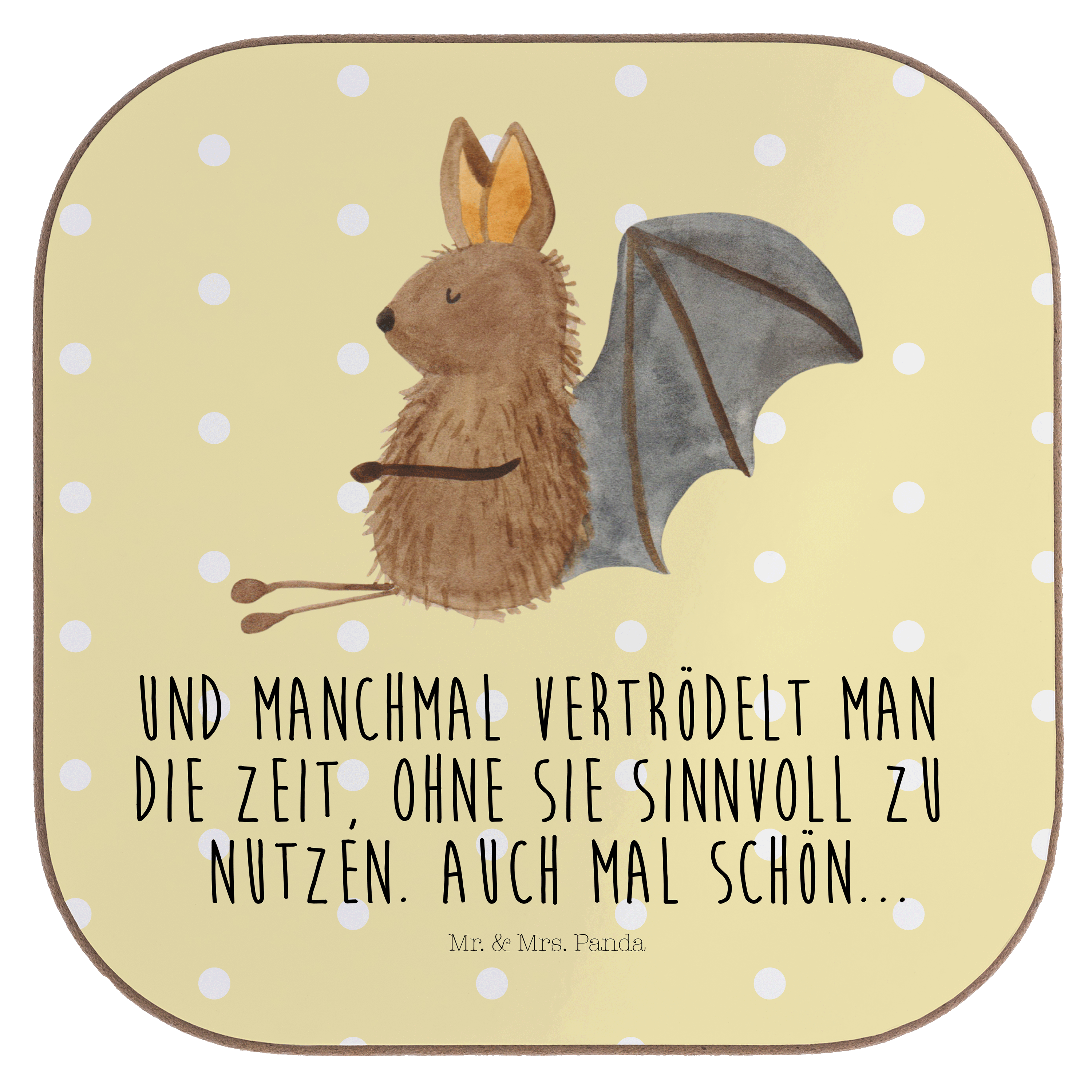 Quadratische Untersetzer Fledermaus sitzend - mit Spruch - Gelb Pastell