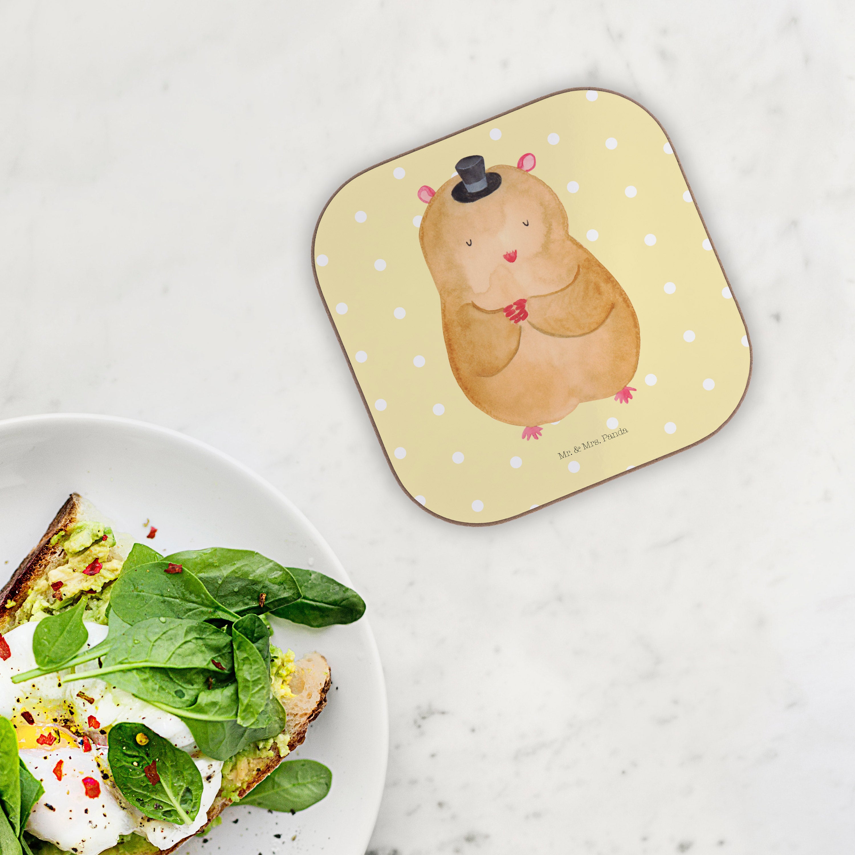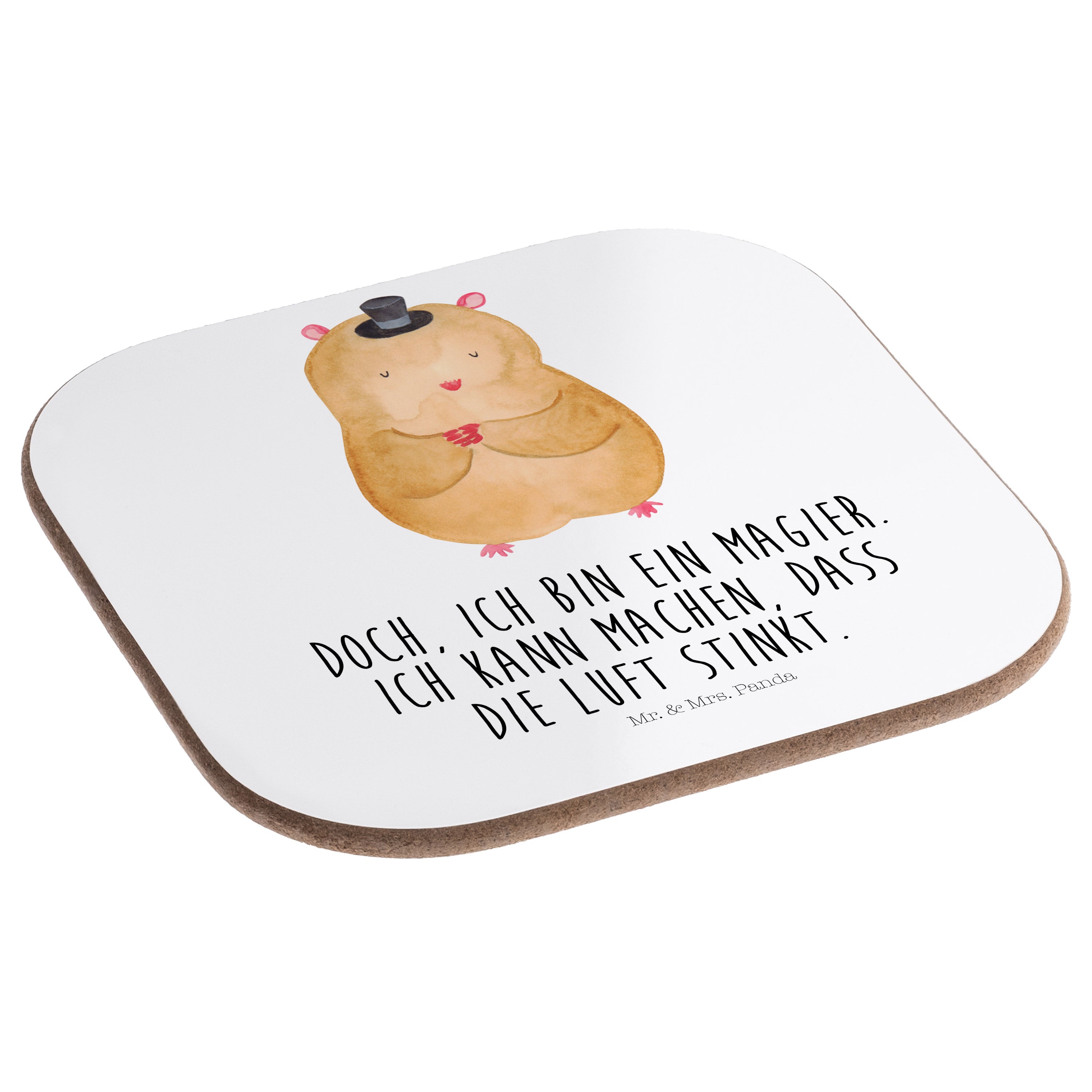 Quadratische Untersetzer Hamster mit Hut - mit Spruch - Gelb Pastell