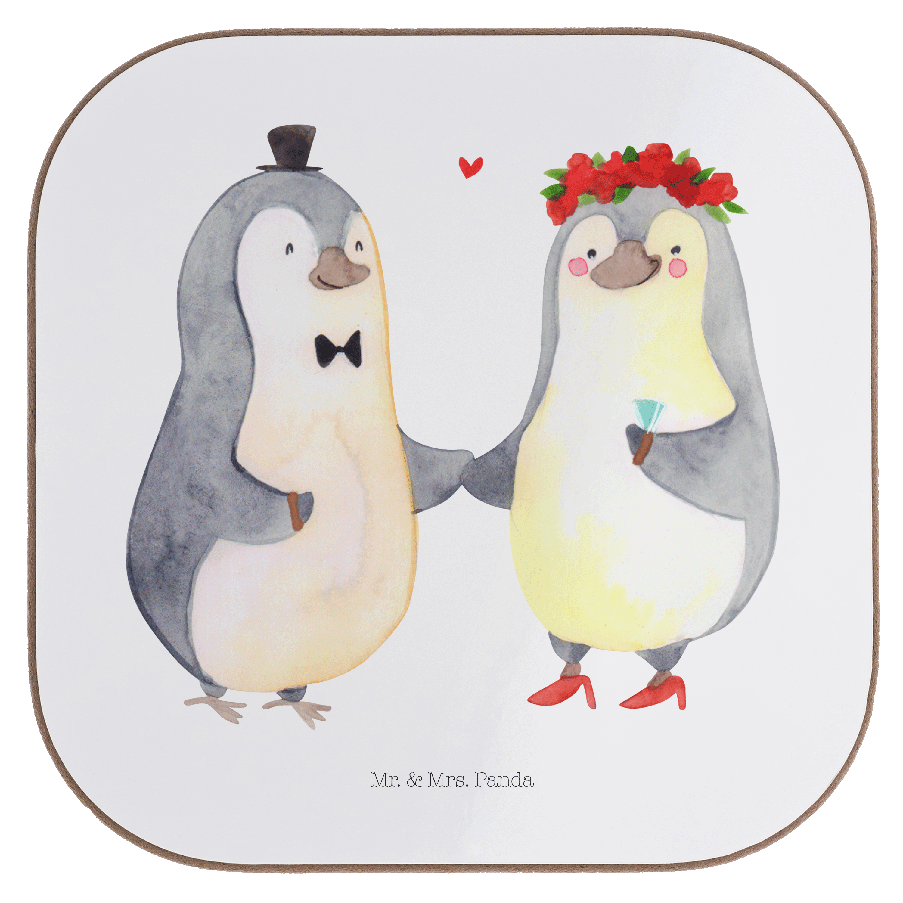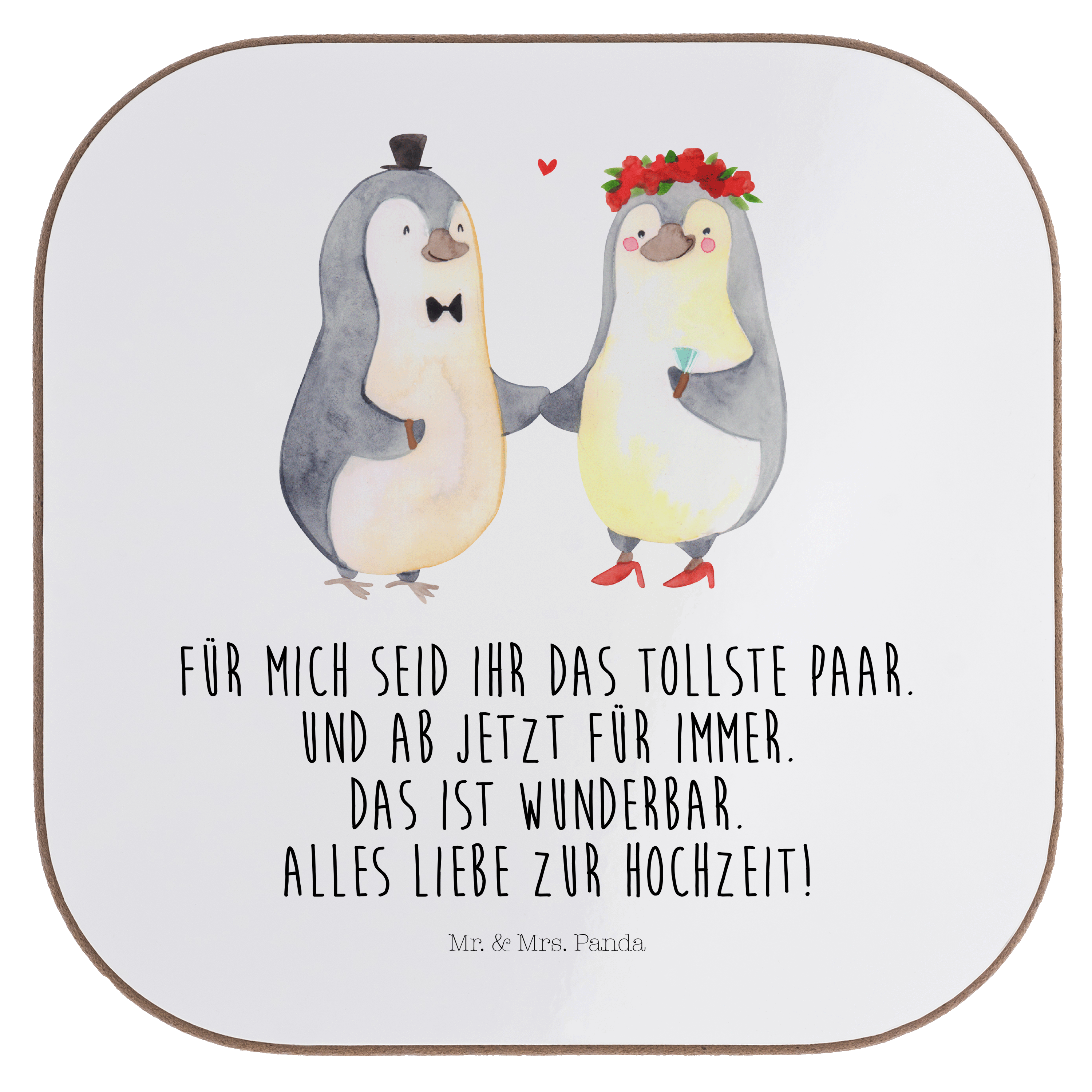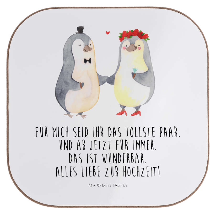 Quadratische Untersetzer Hochzeitspaar Pinguin - mit Spruch