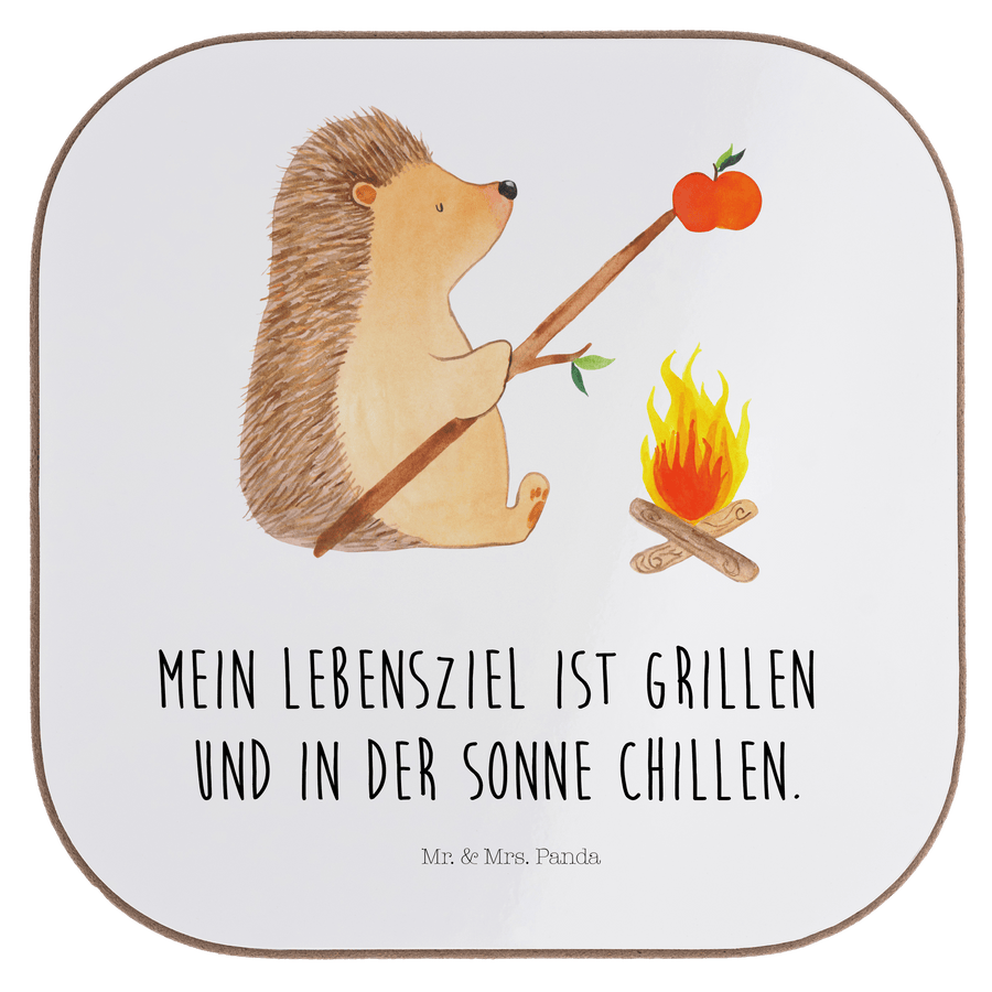 Quadratische Untersetzer Igel grillt - mit Spruch - Weiß