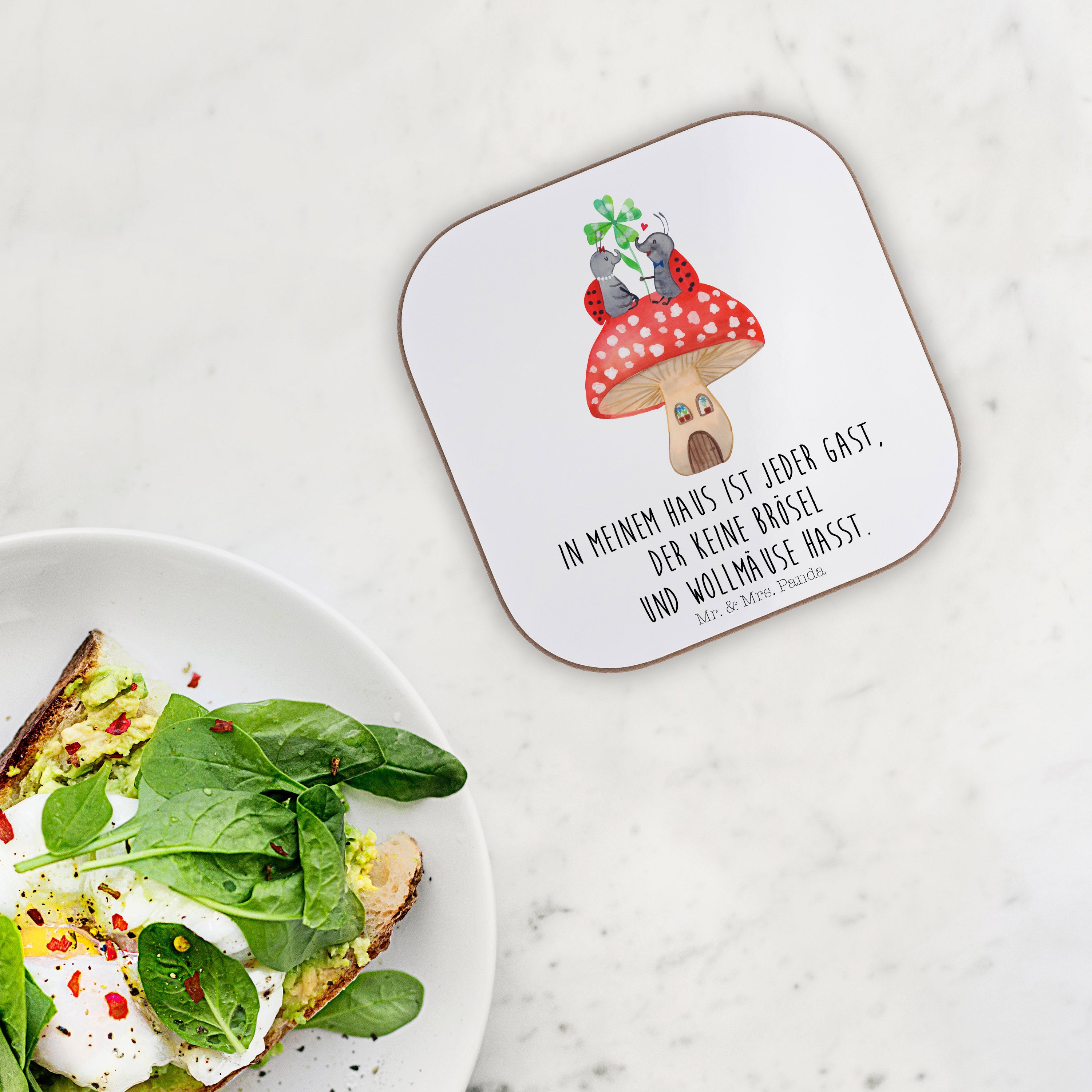 Quadratische Untersetzer Marienkäfer Paar Fliegenpilz - mit Spruch