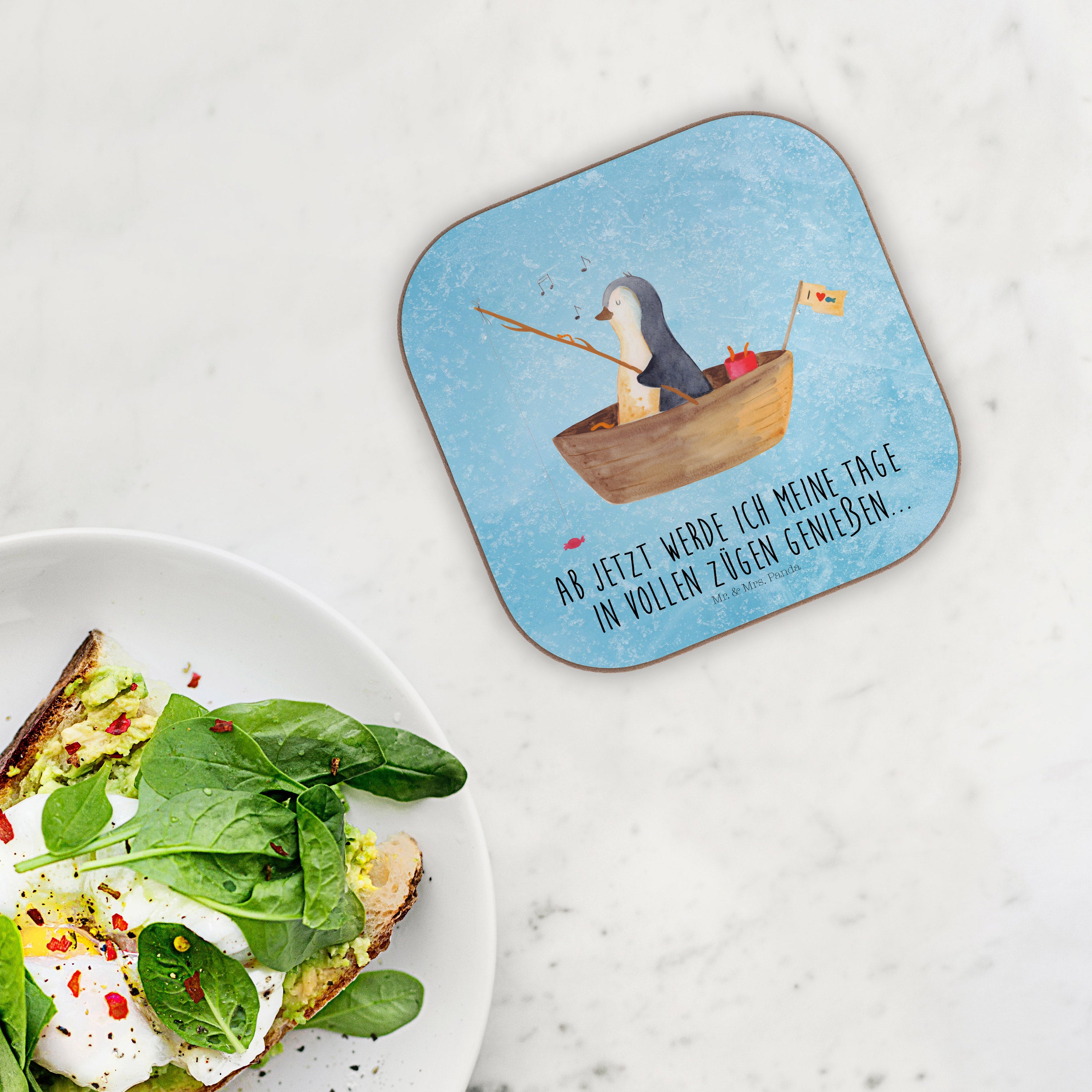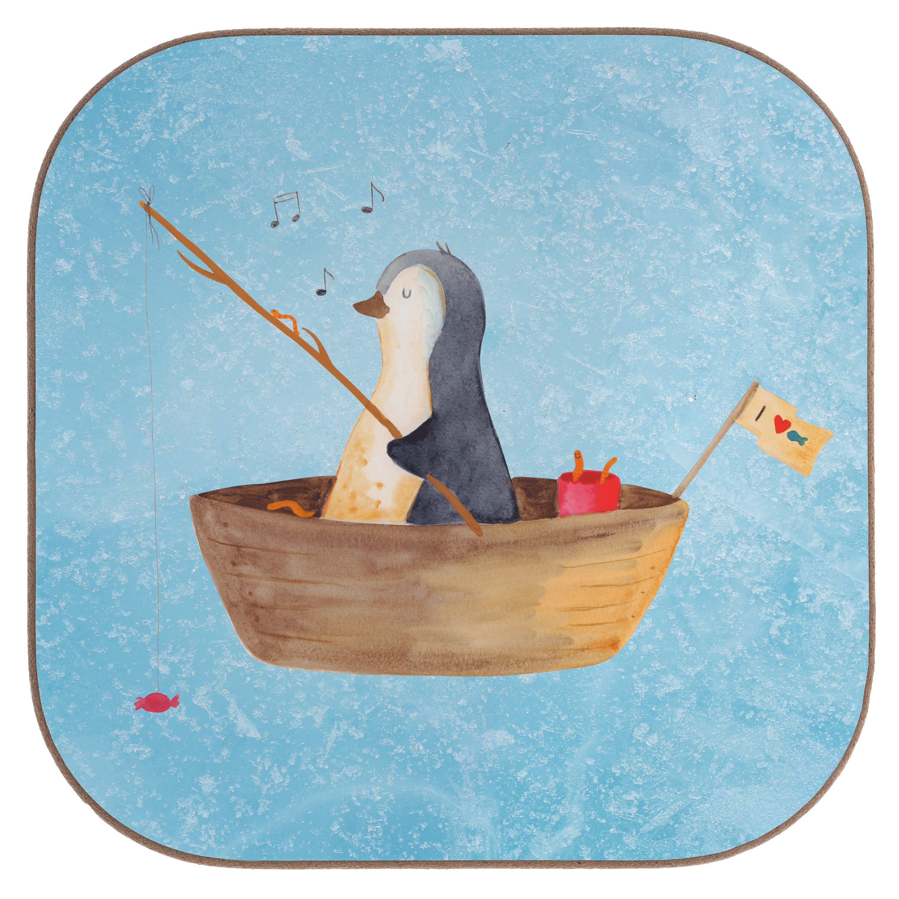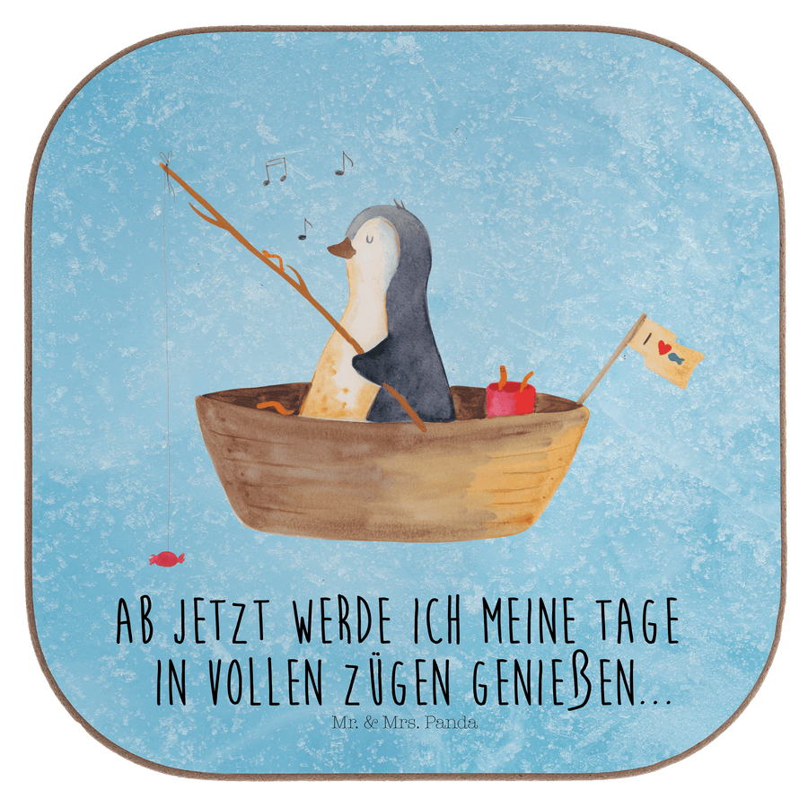 Quadratische Untersetzer Pinguin Angelboot - mit Spruch - Eisblau