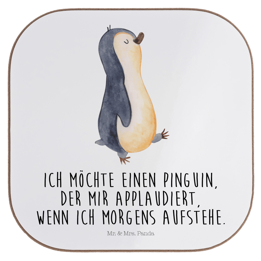Quadratische Untersetzer Pinguin marschierend - mit Spruch - Weiß