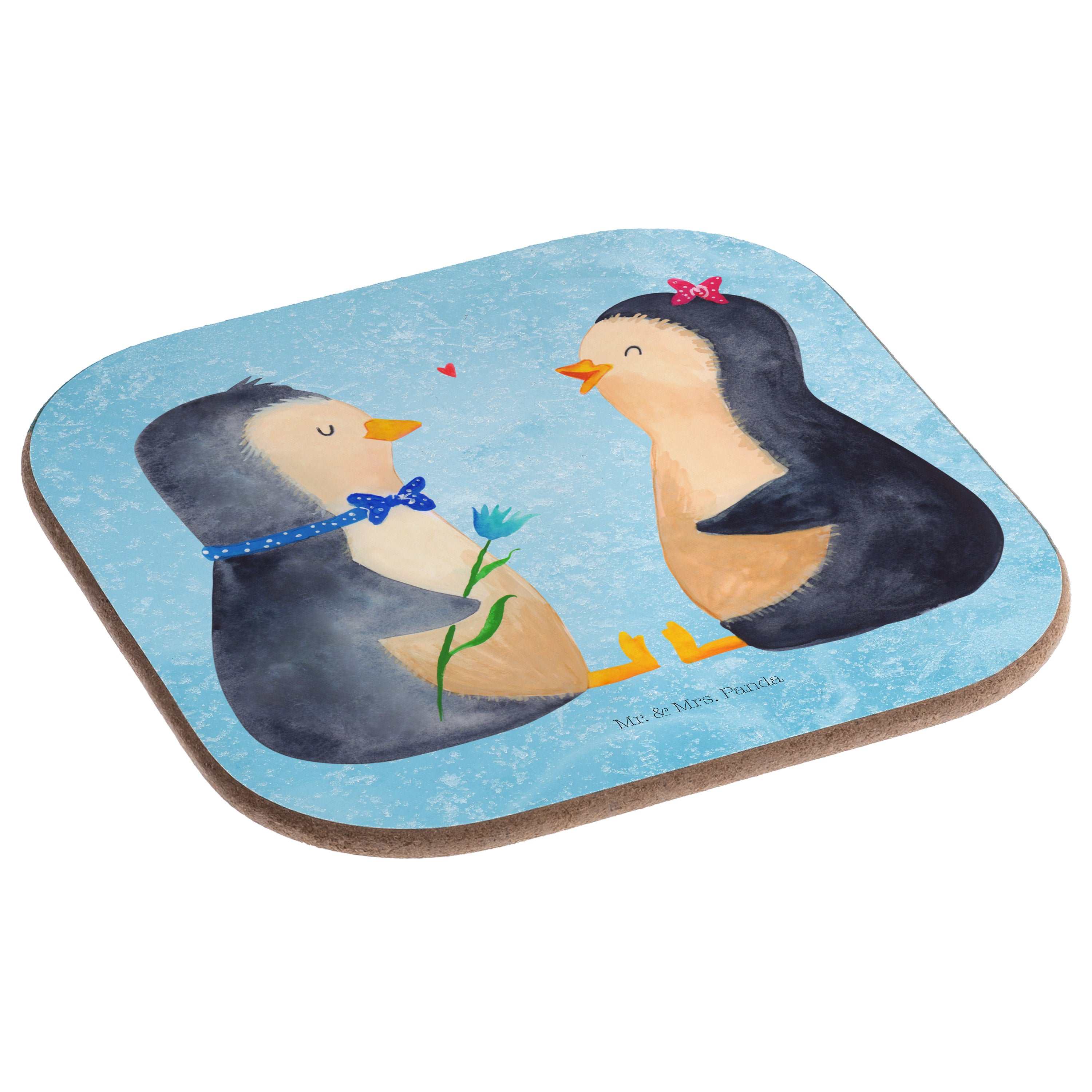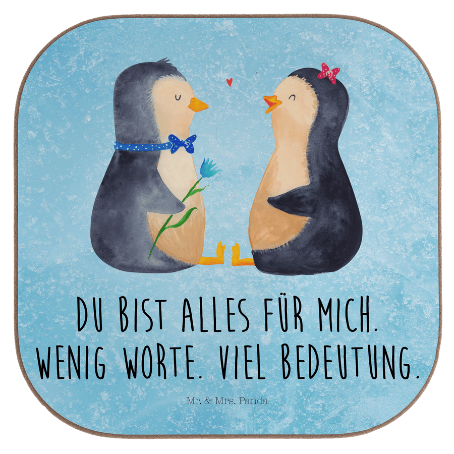 Quadratische Untersetzer Pinguin Pärchen - mit Spruch - Eisblau