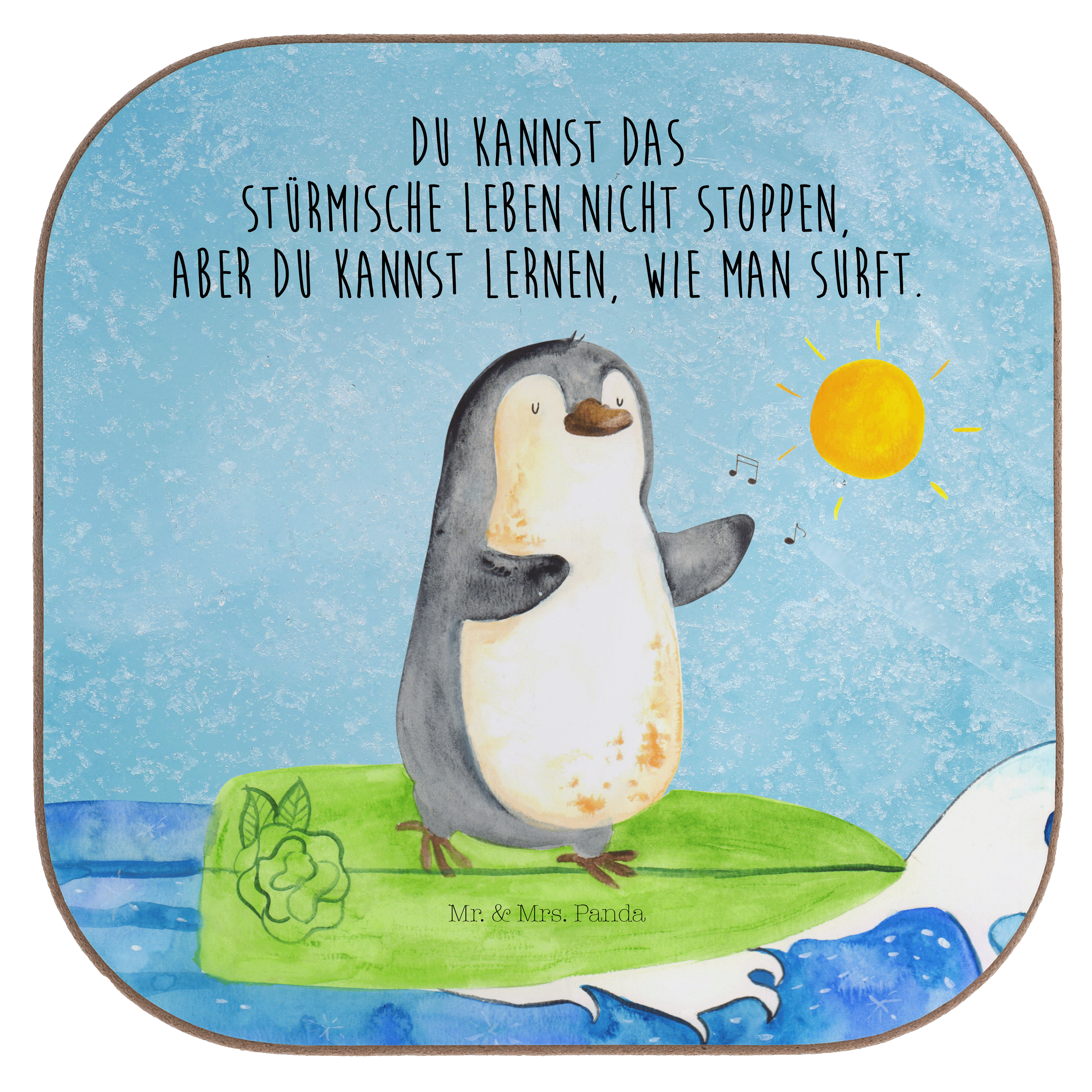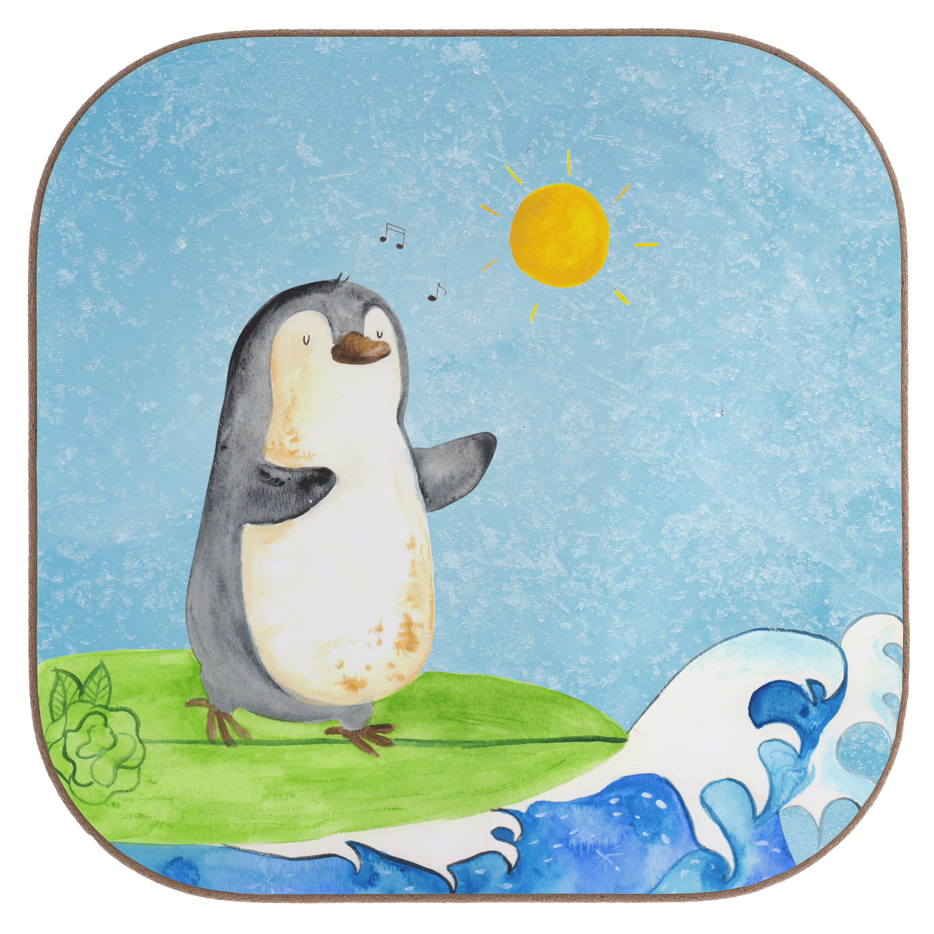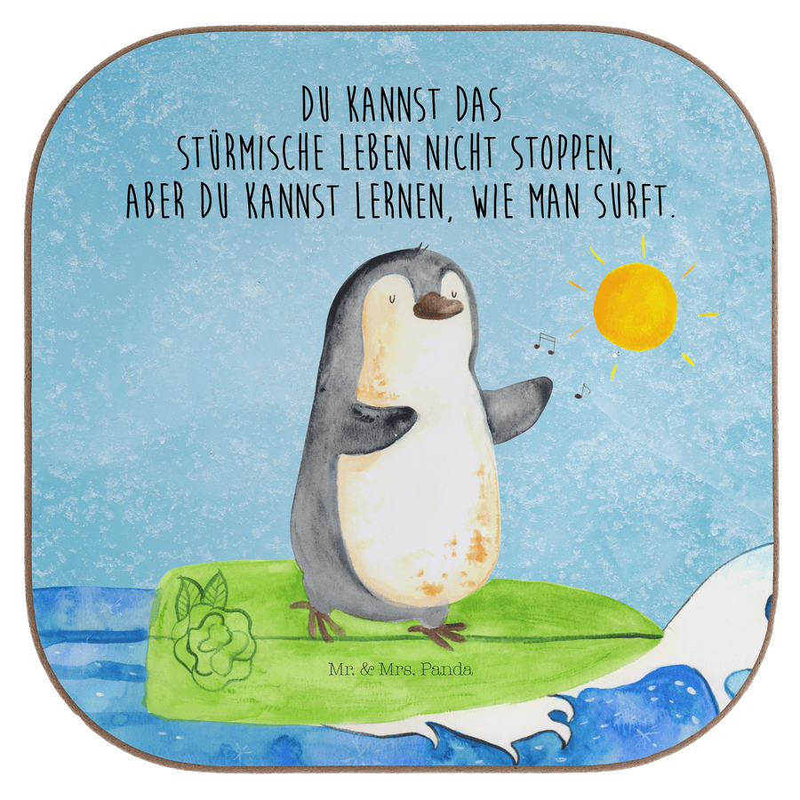 Quadratische Untersetzer Pinguin Surfer - mit Spruch - Eisblau