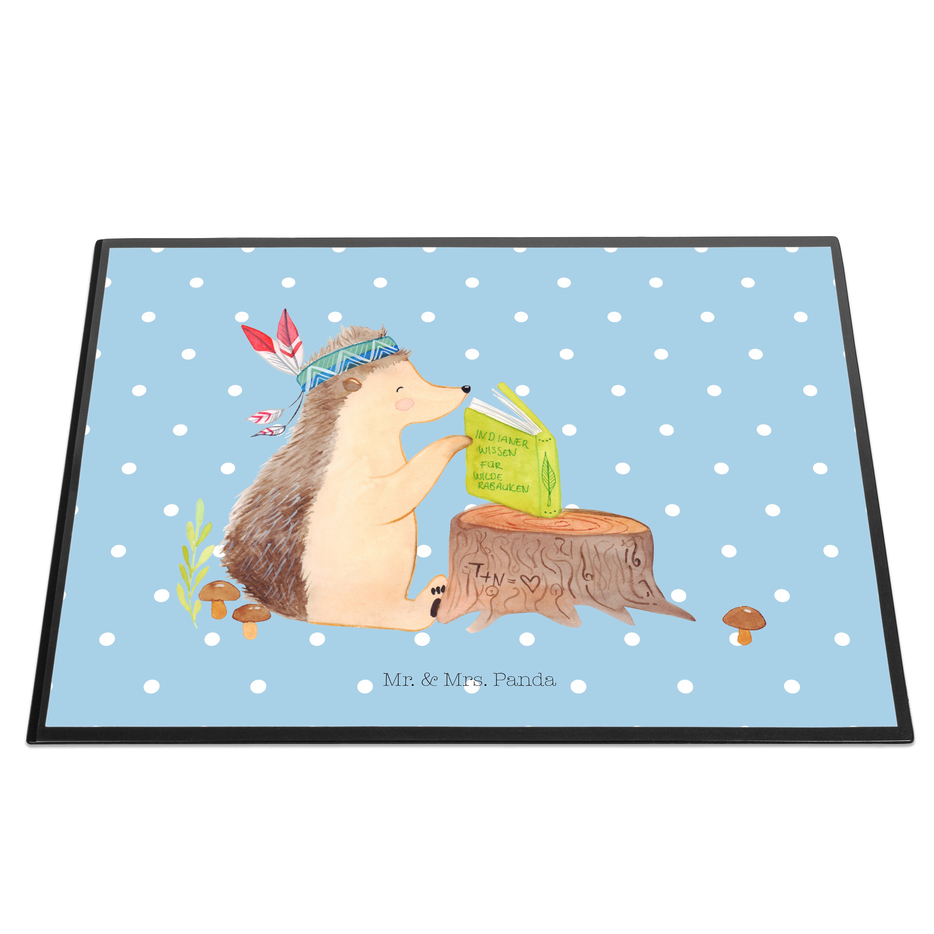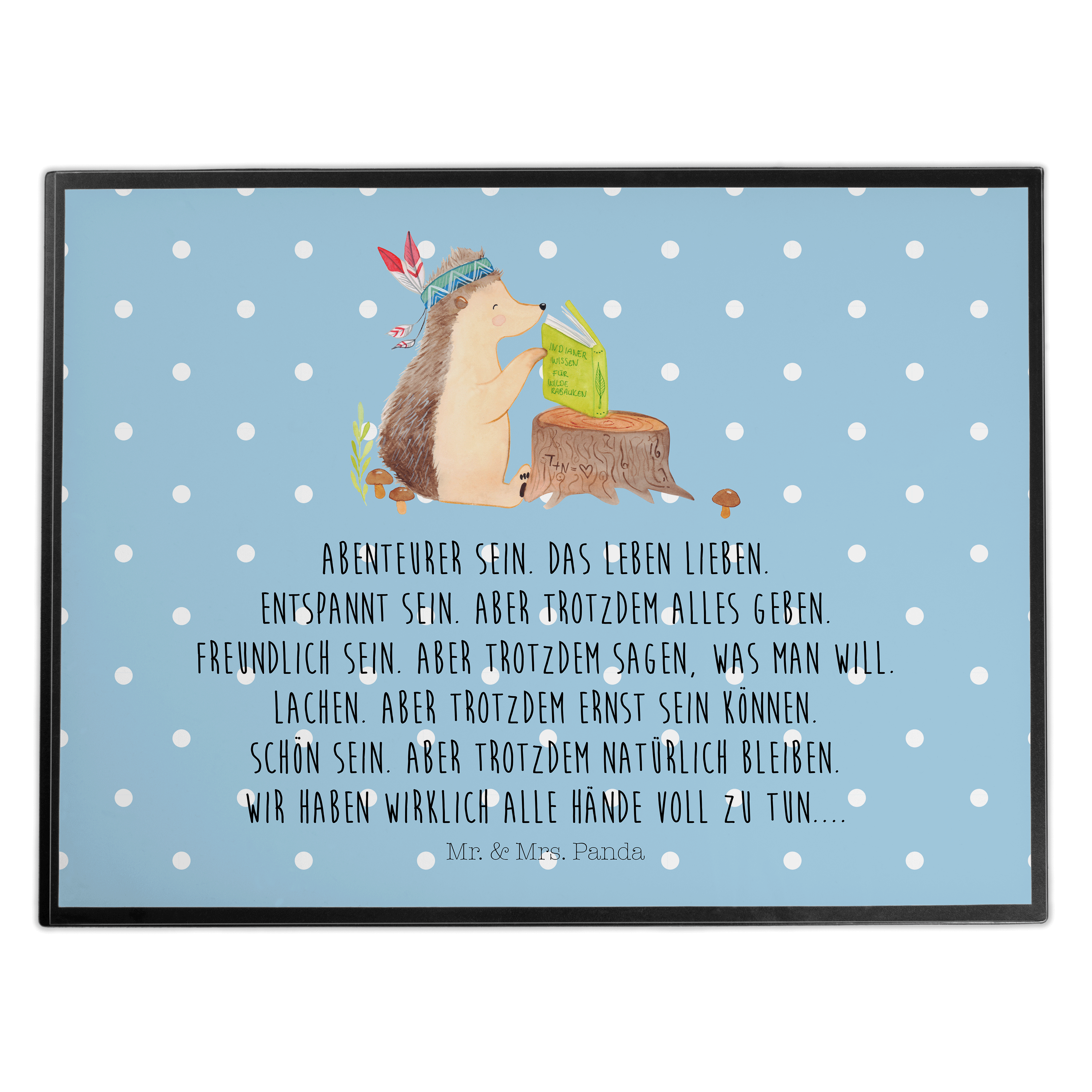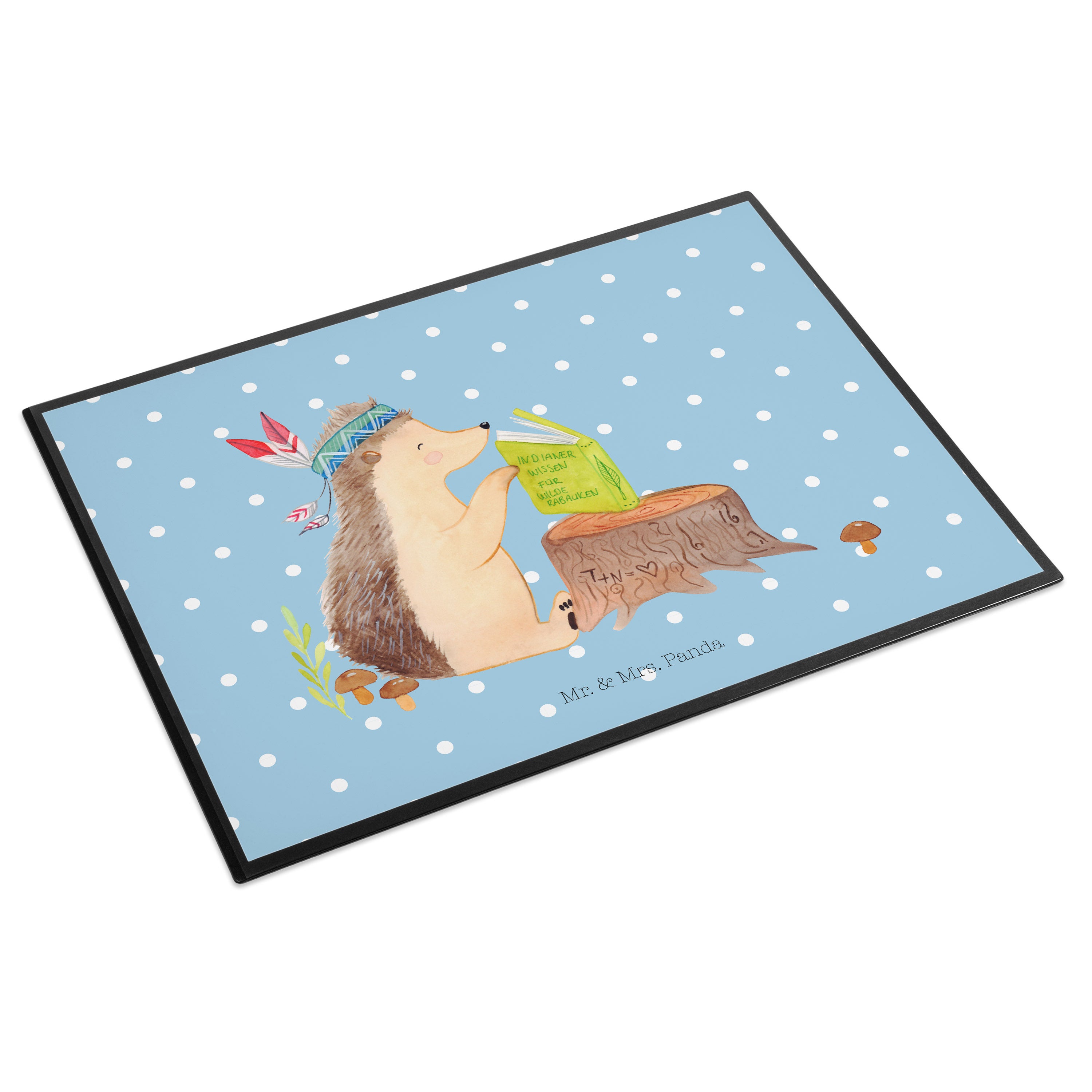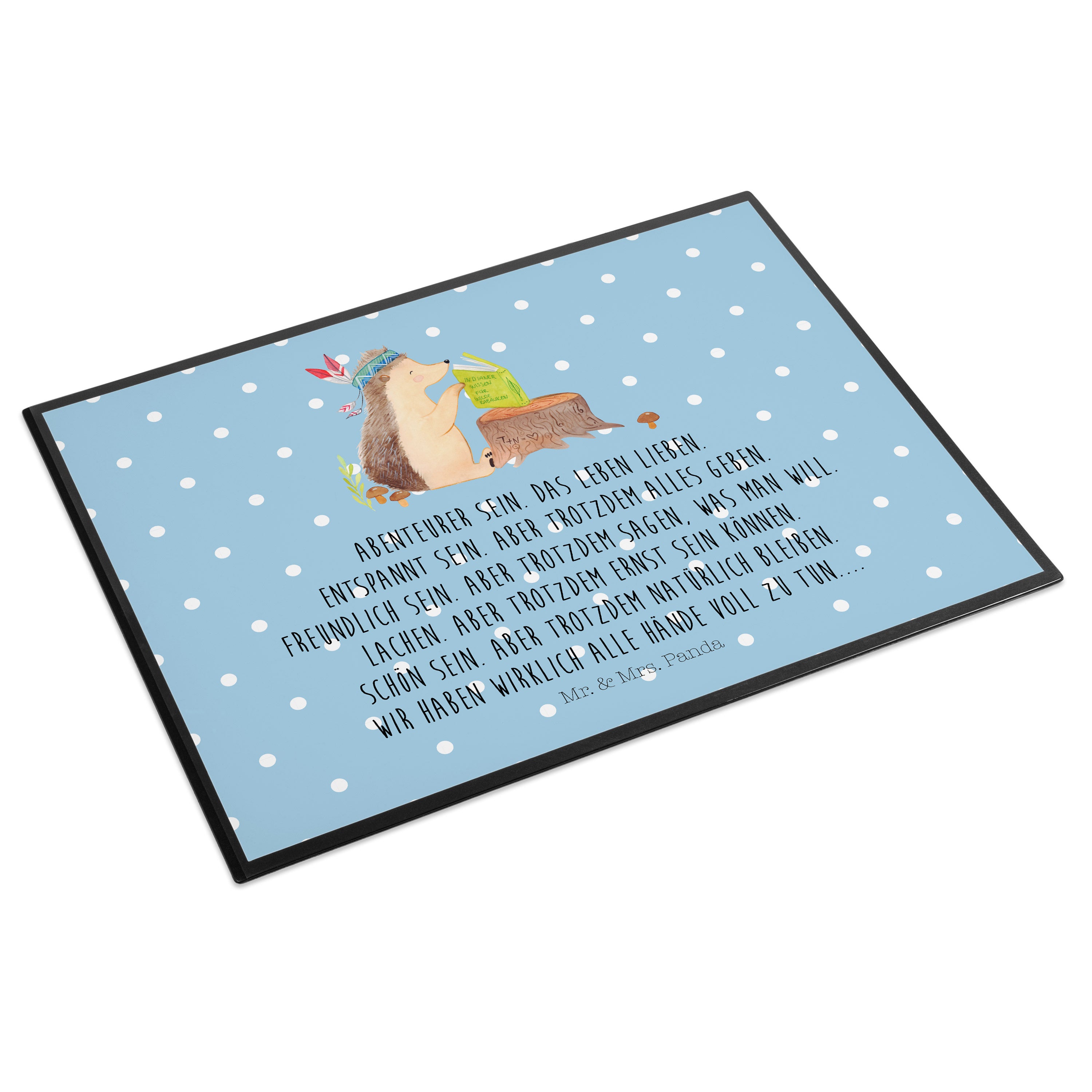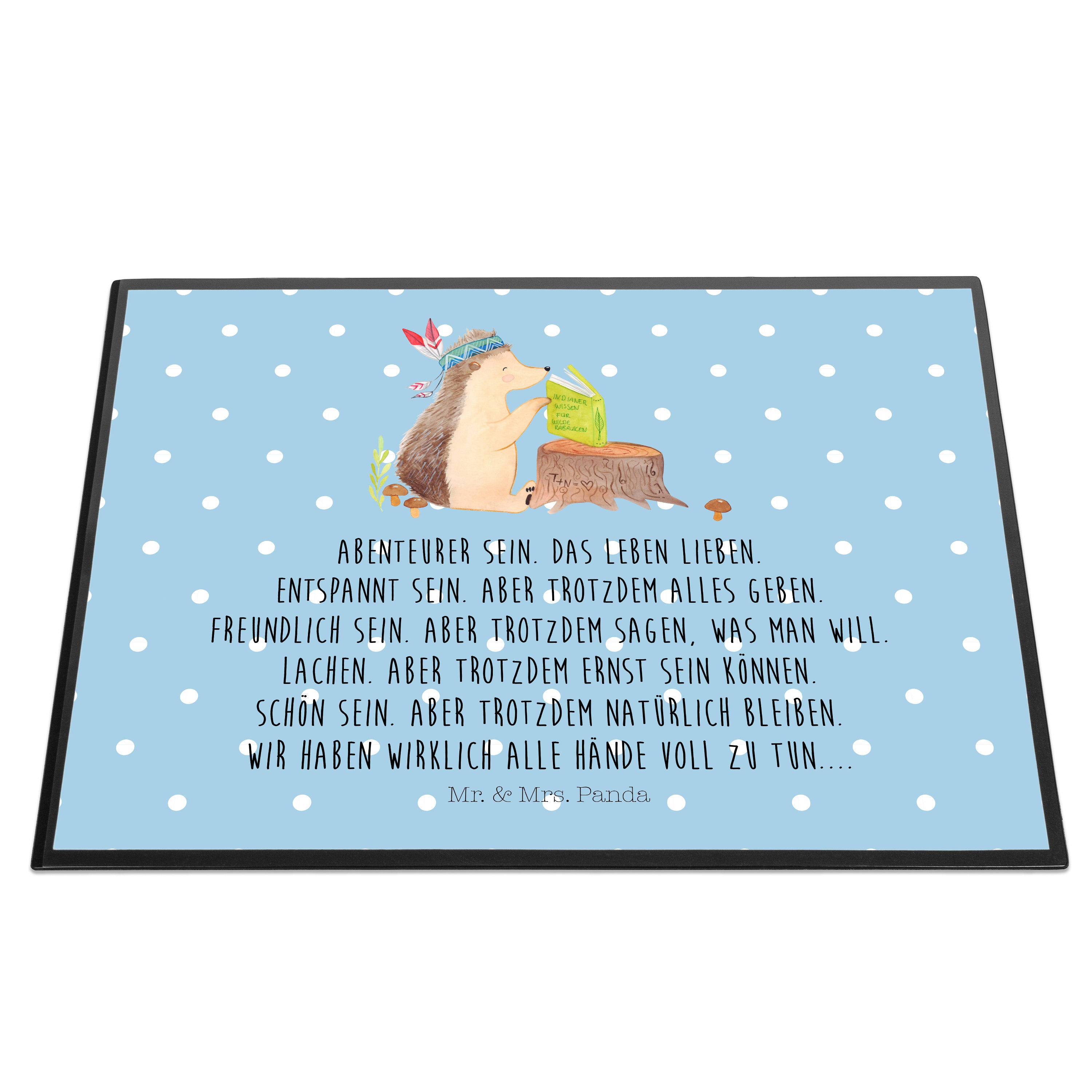 Schreibtischunterlage Igel Indianer - mit Spruch - Blau Pastell