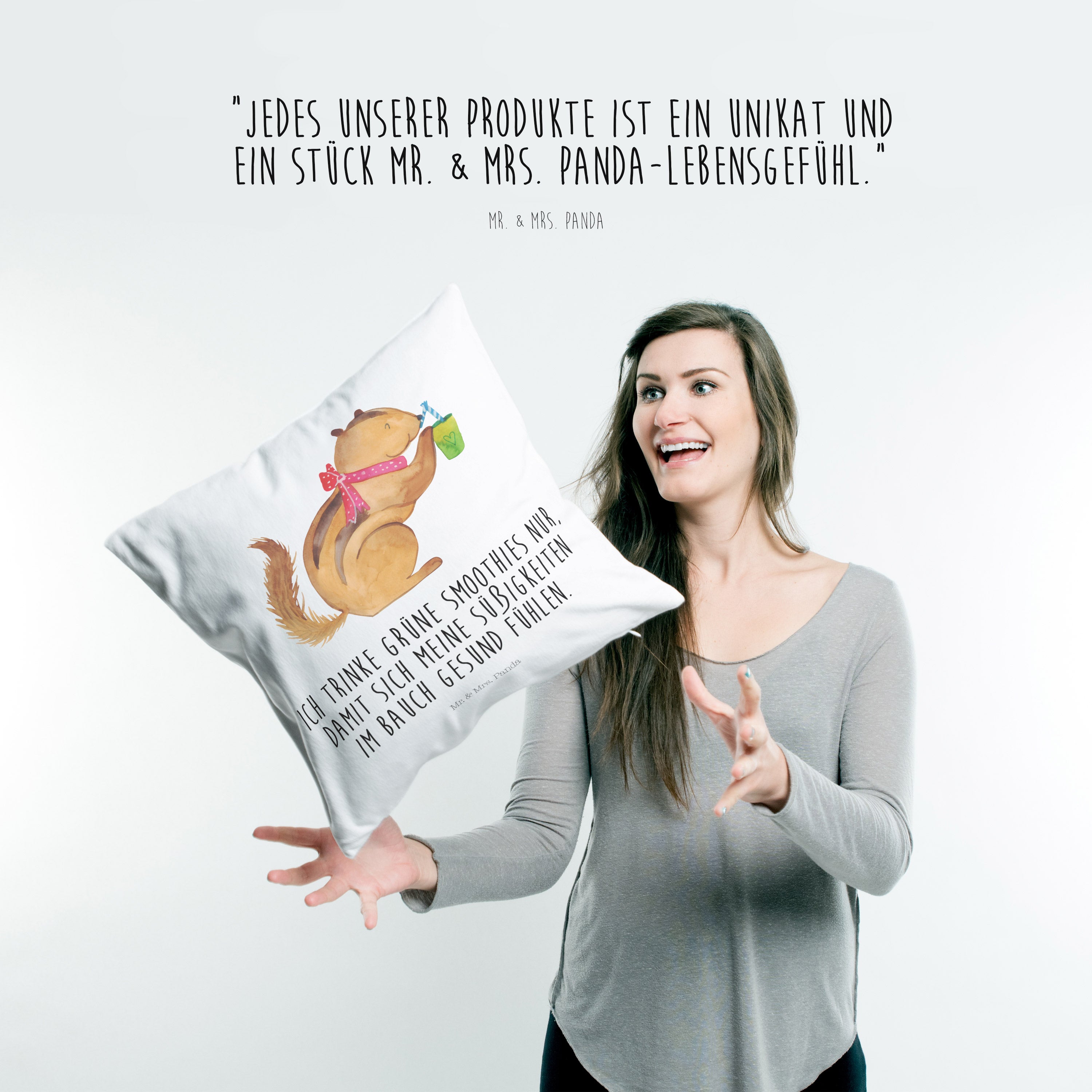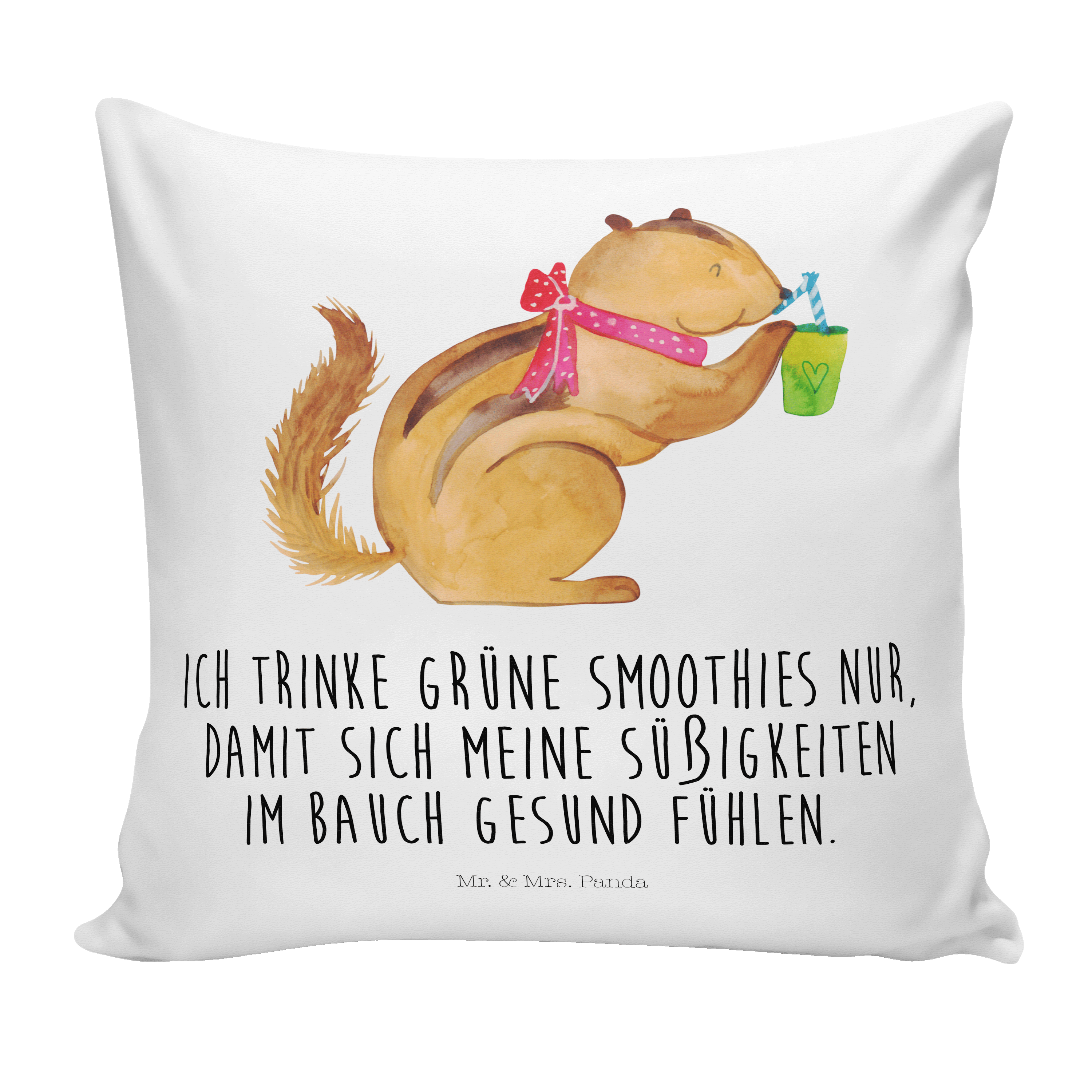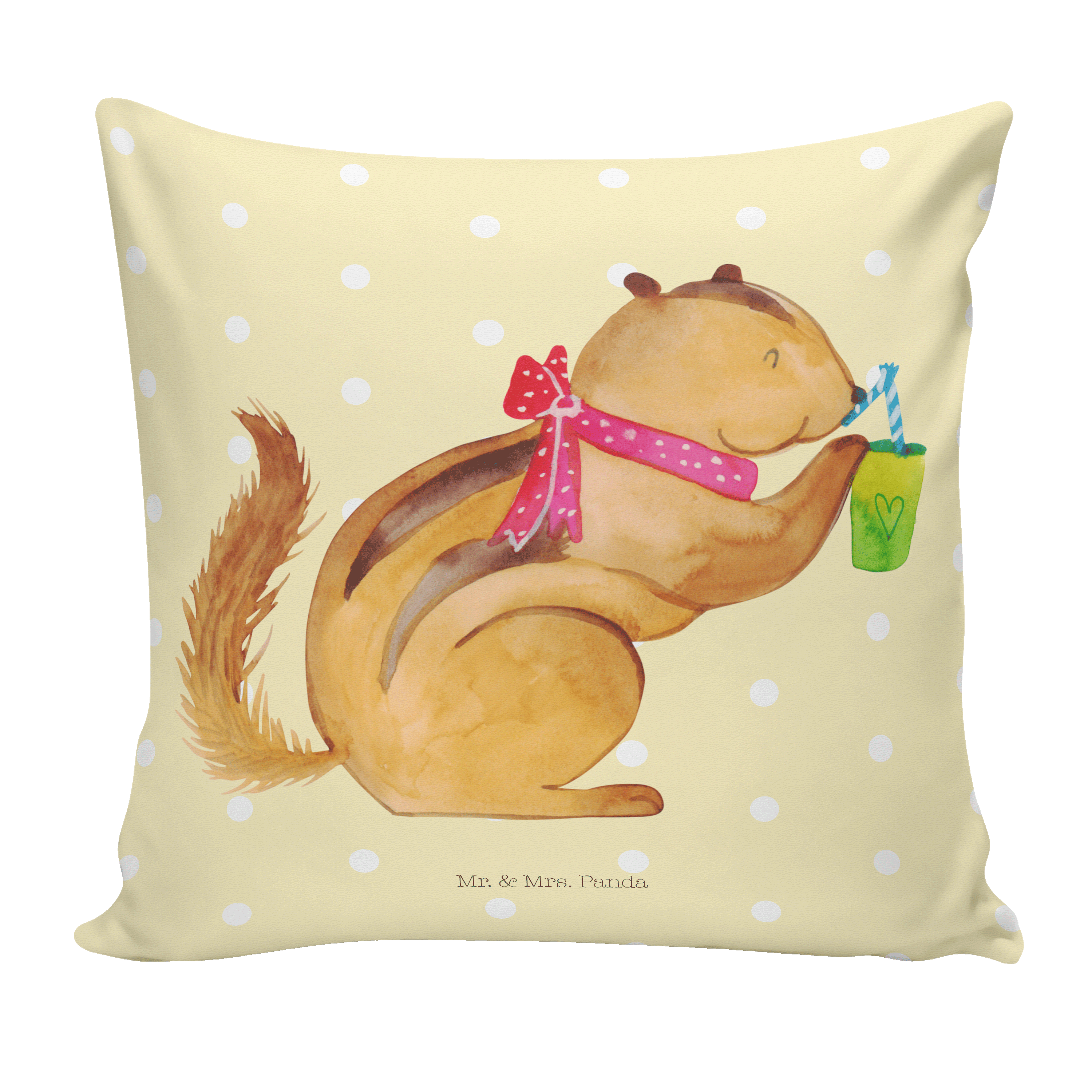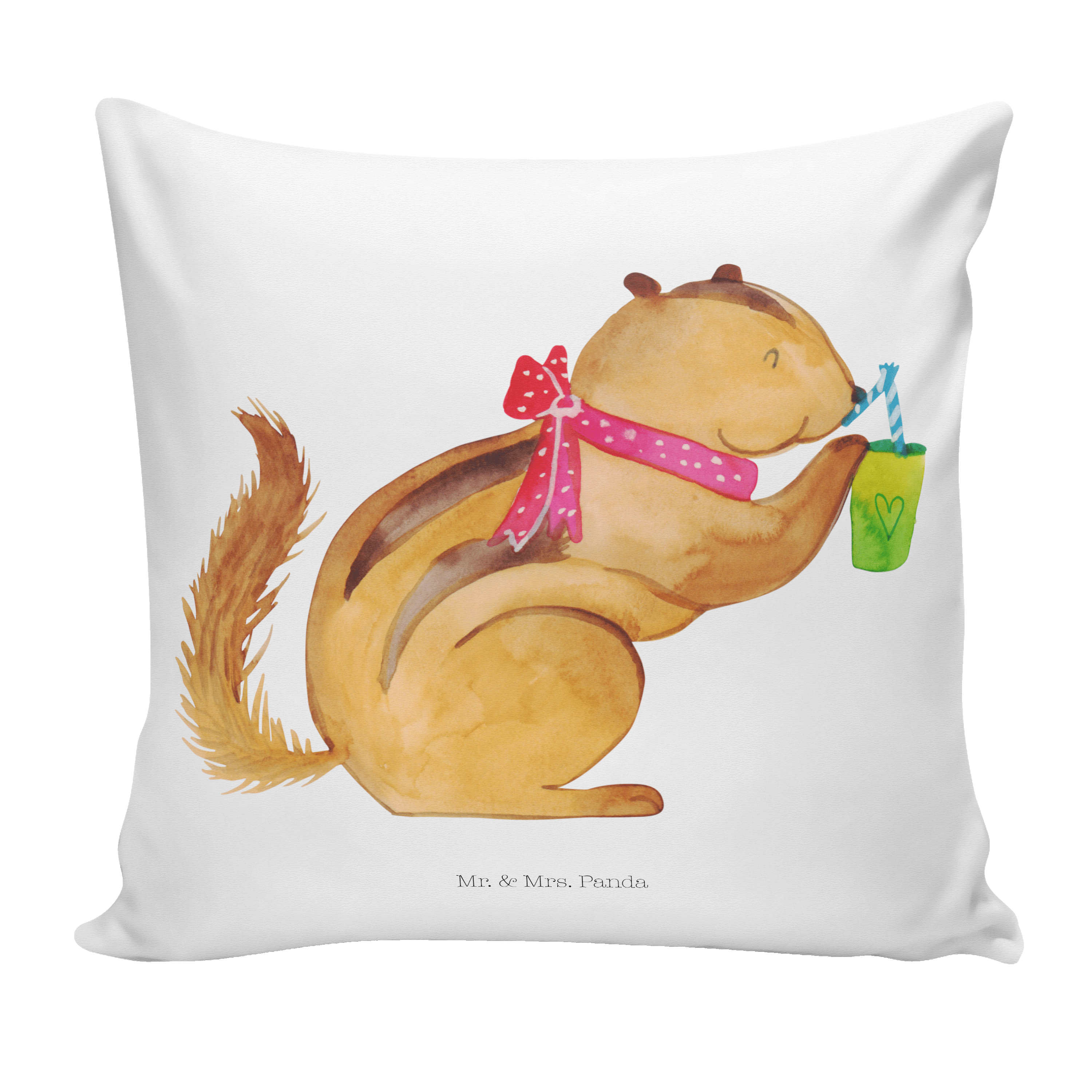 Du dachtest, du hättest schon alles gesehen, aber dann siehst du das niedliche Streifenhörnchen auf deinem neuen Eichhörnchen Smoothie Kissen. Das kleine Kerlchen schlürft genüsslich an einem Smoothie und du kannst dich gar nicht satt sehen an diesem entzückenden Motiv.