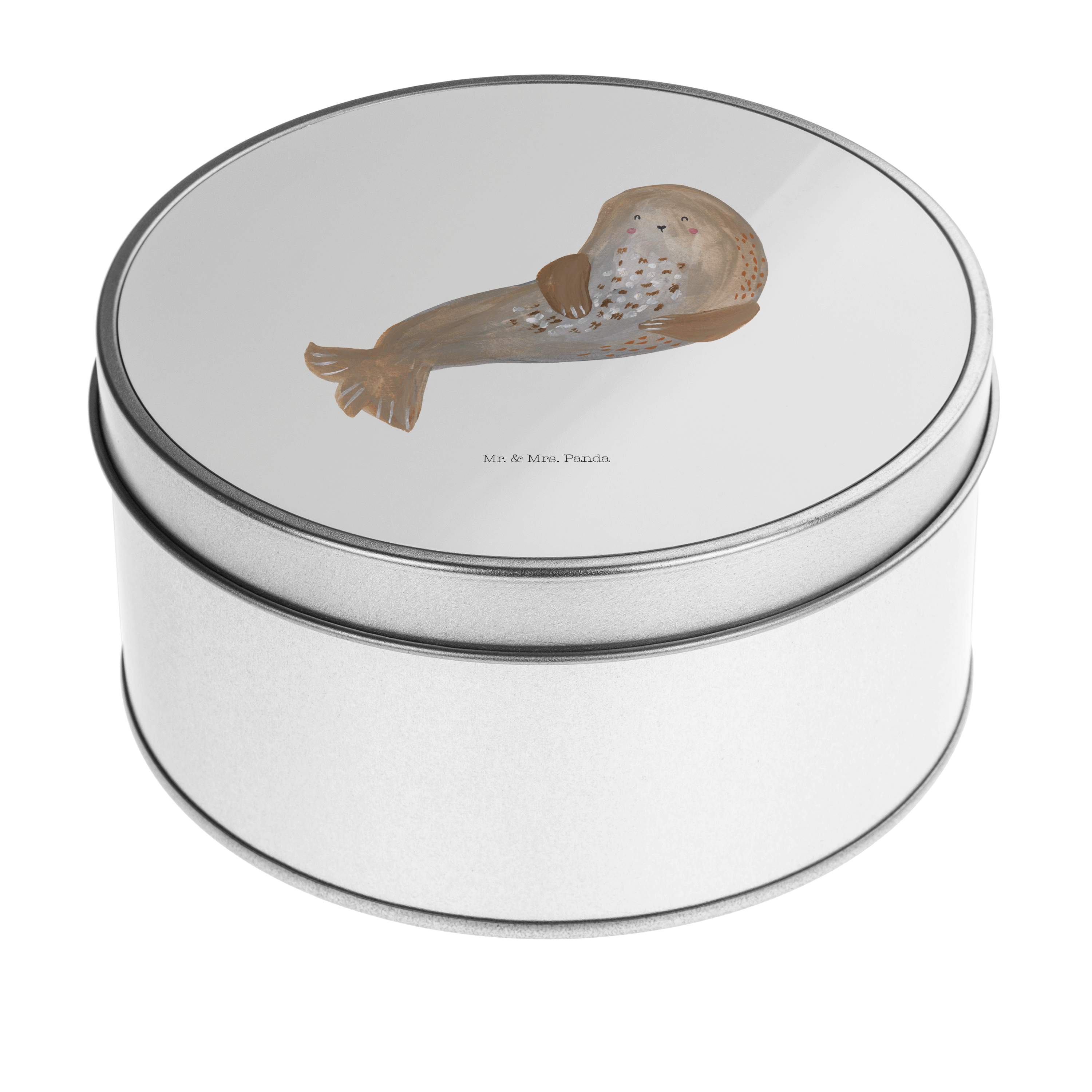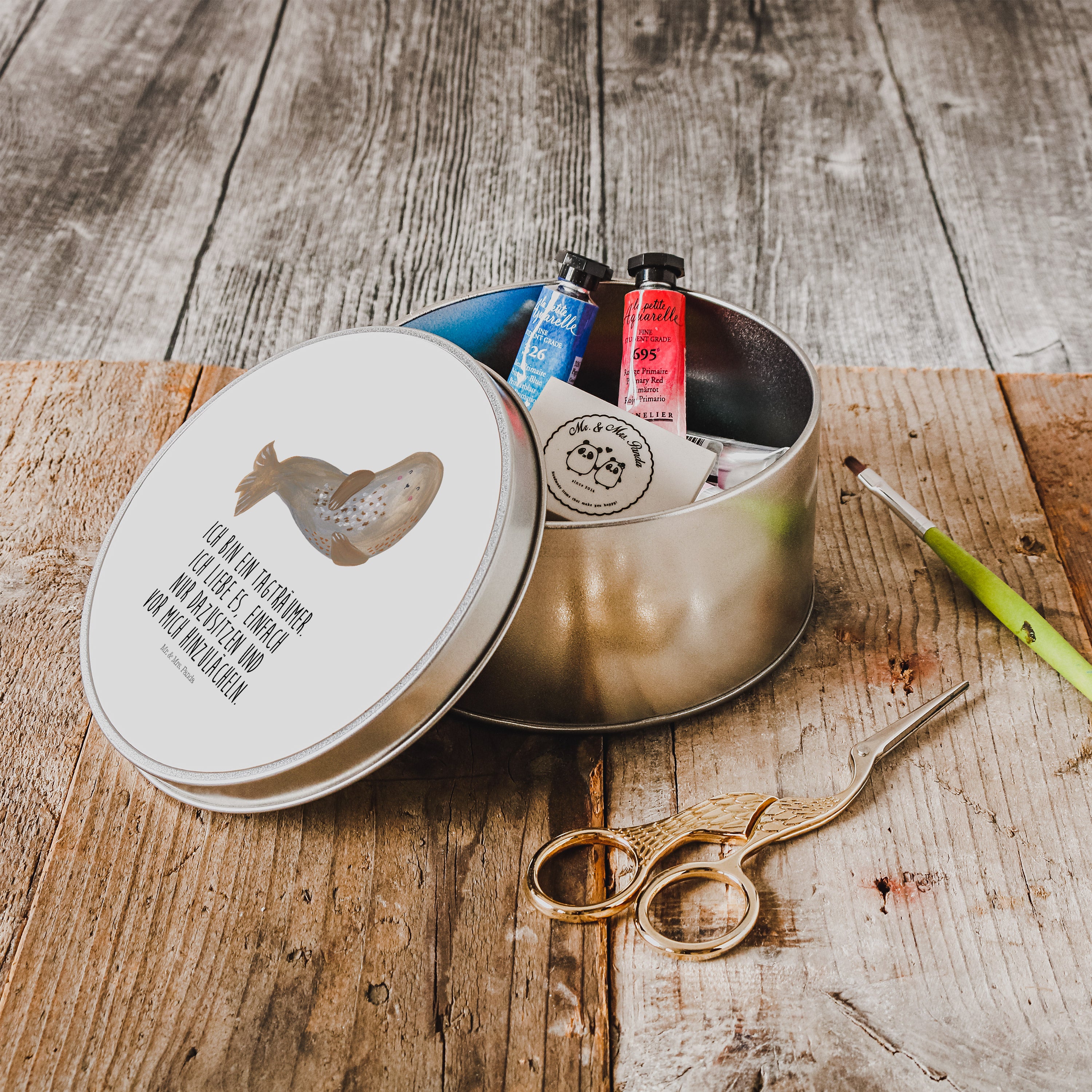 Blechdose rund Robbe lachend - mit Spruch - Gelb Pastell