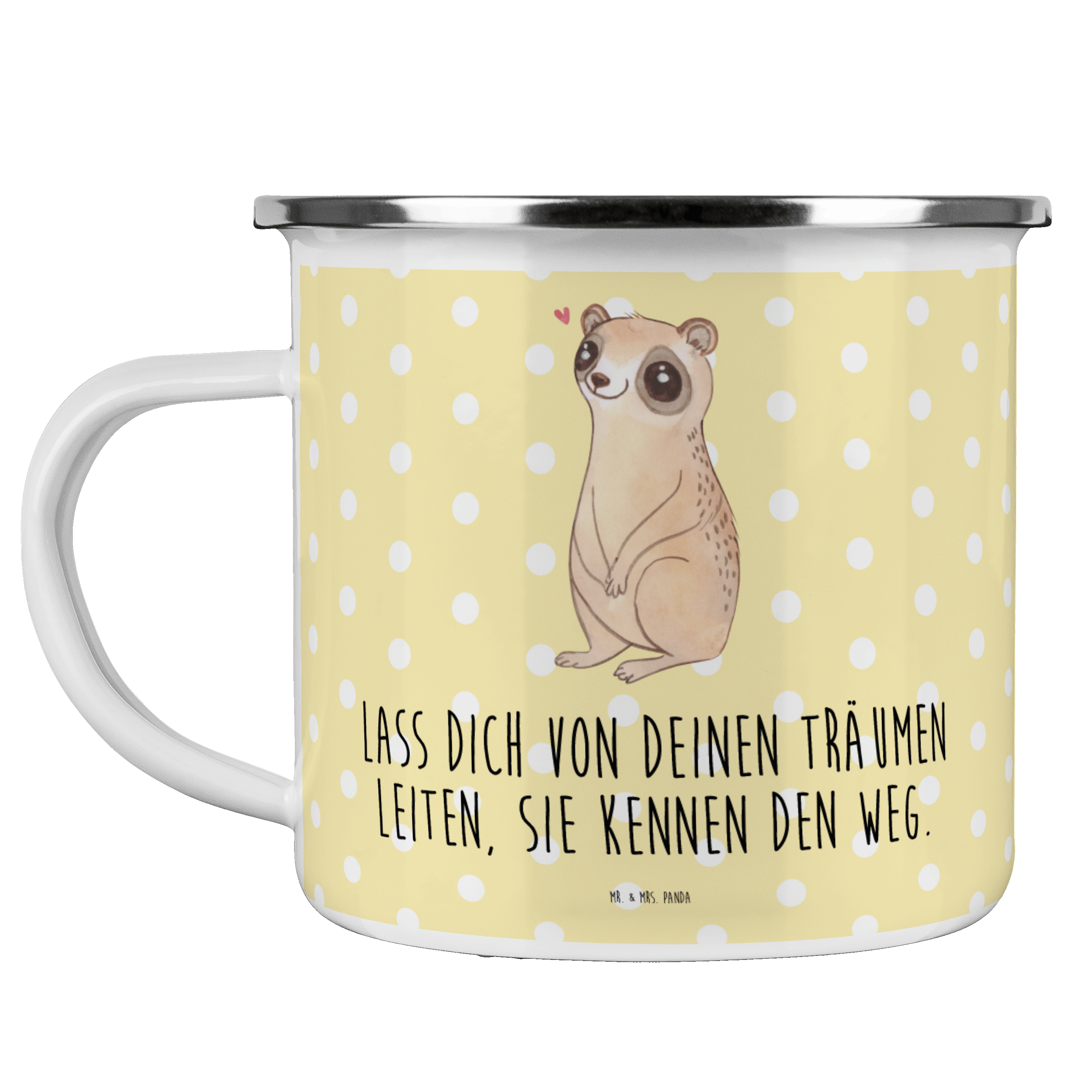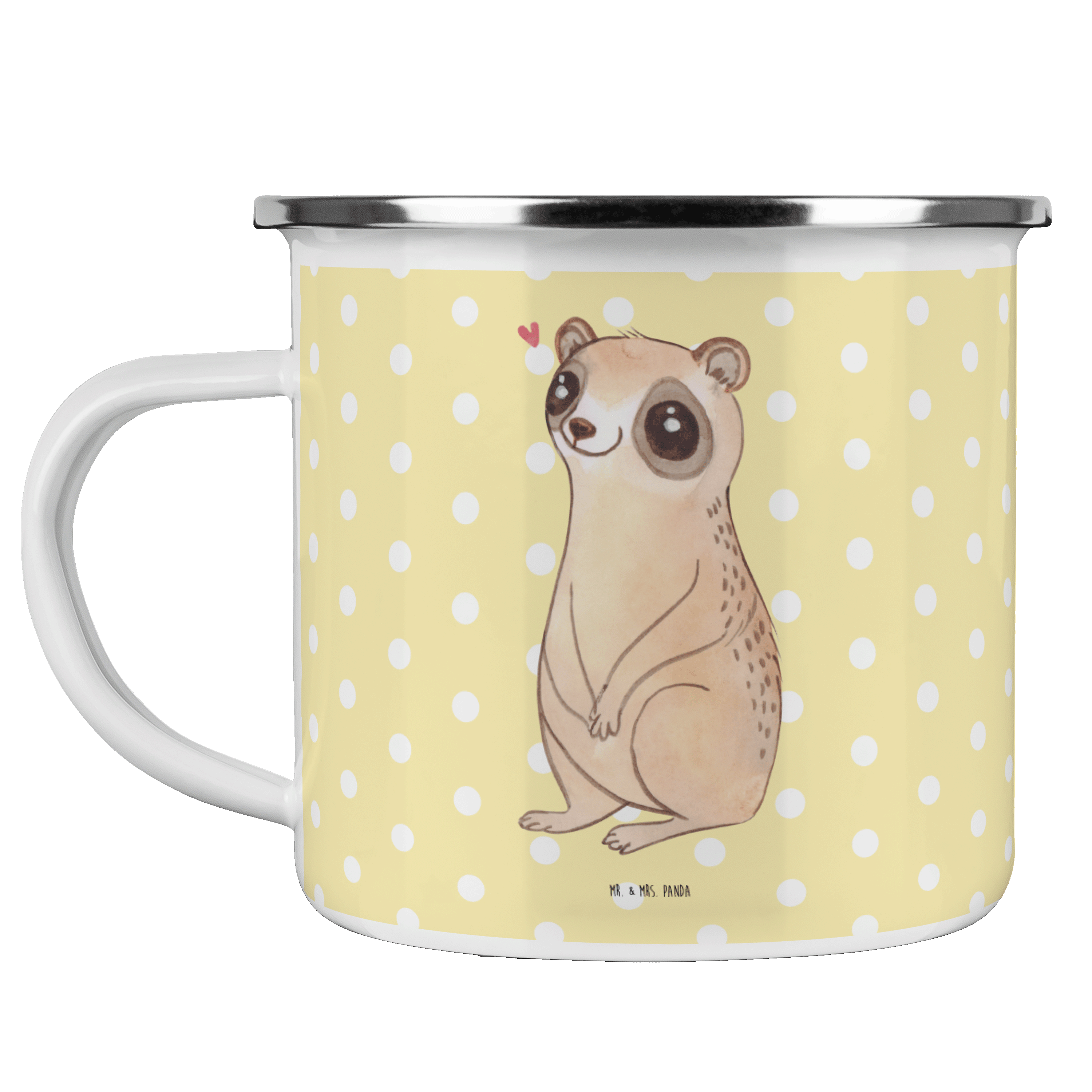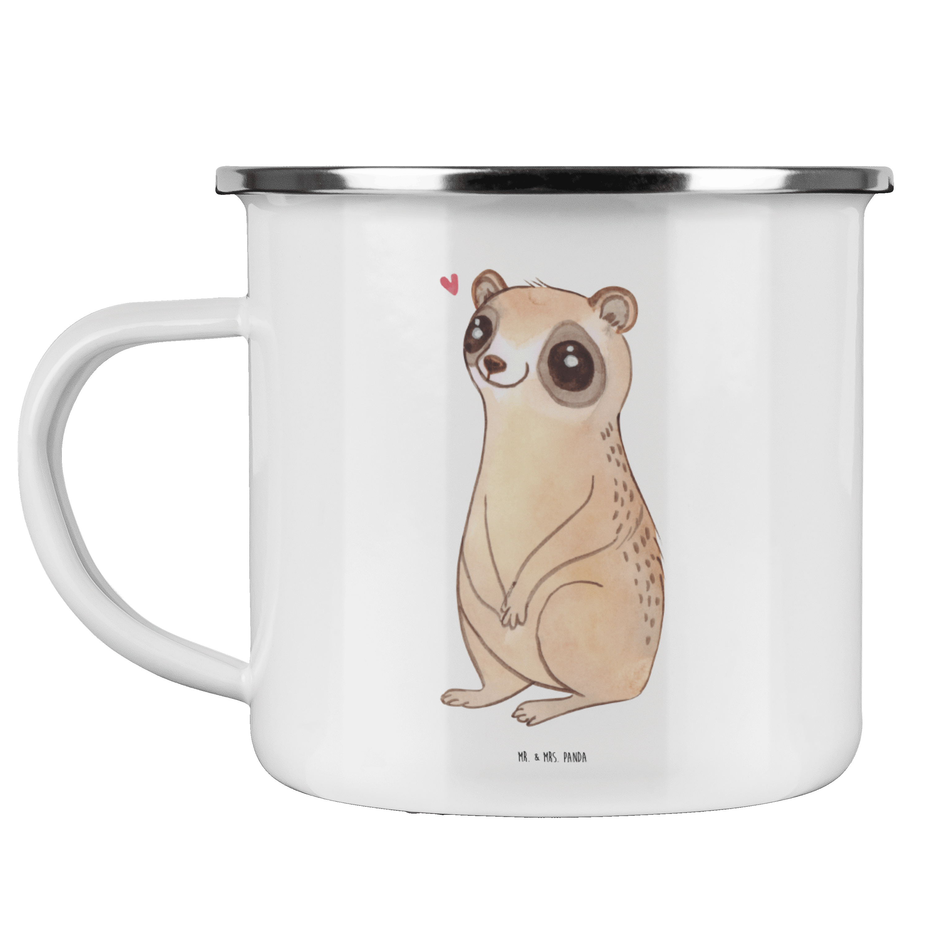 Camping Emaille Tasse Plumplori Glücklich - mit Spruch - Weiß