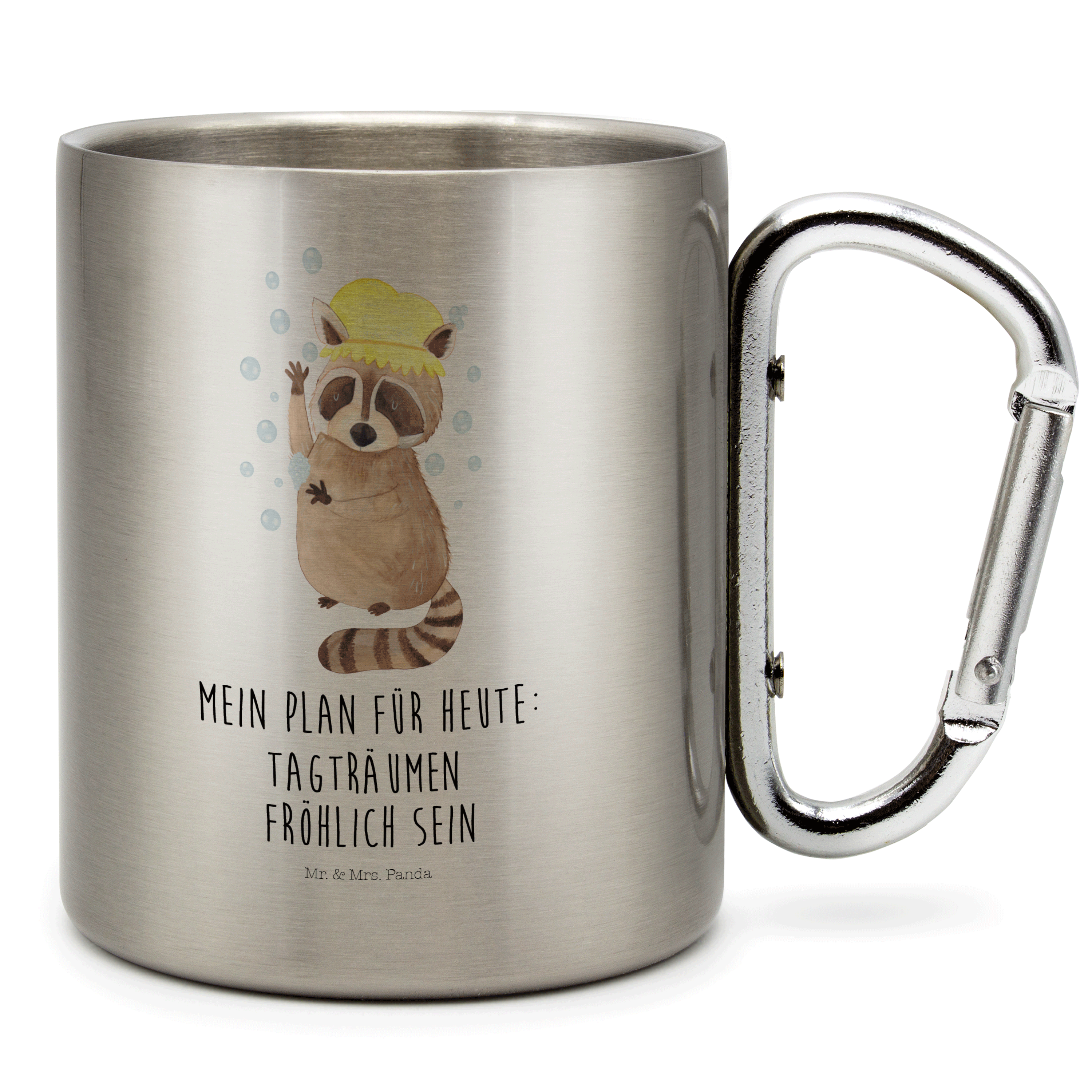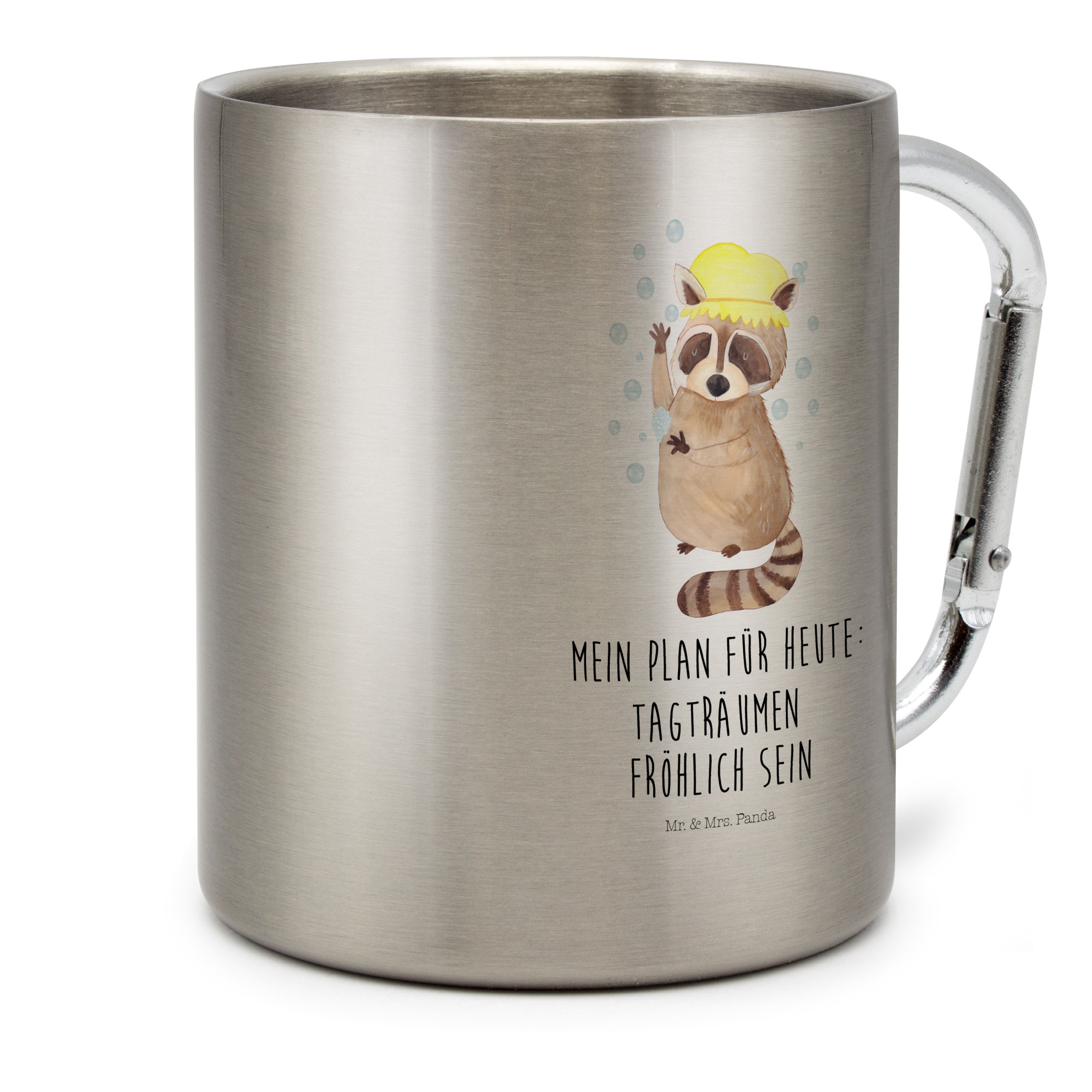 Edelstahlbecher Waschbär Edelstahltasse, Karabiner, Edelstahlbecher, Outdoor, Camping, Tasse, Becher, Tiermotive, Gute Laune, lustige Sprüche, Tiere, Waschbär, Tagträumen, Plan, Fröhlich, waschen, Seifenblasen