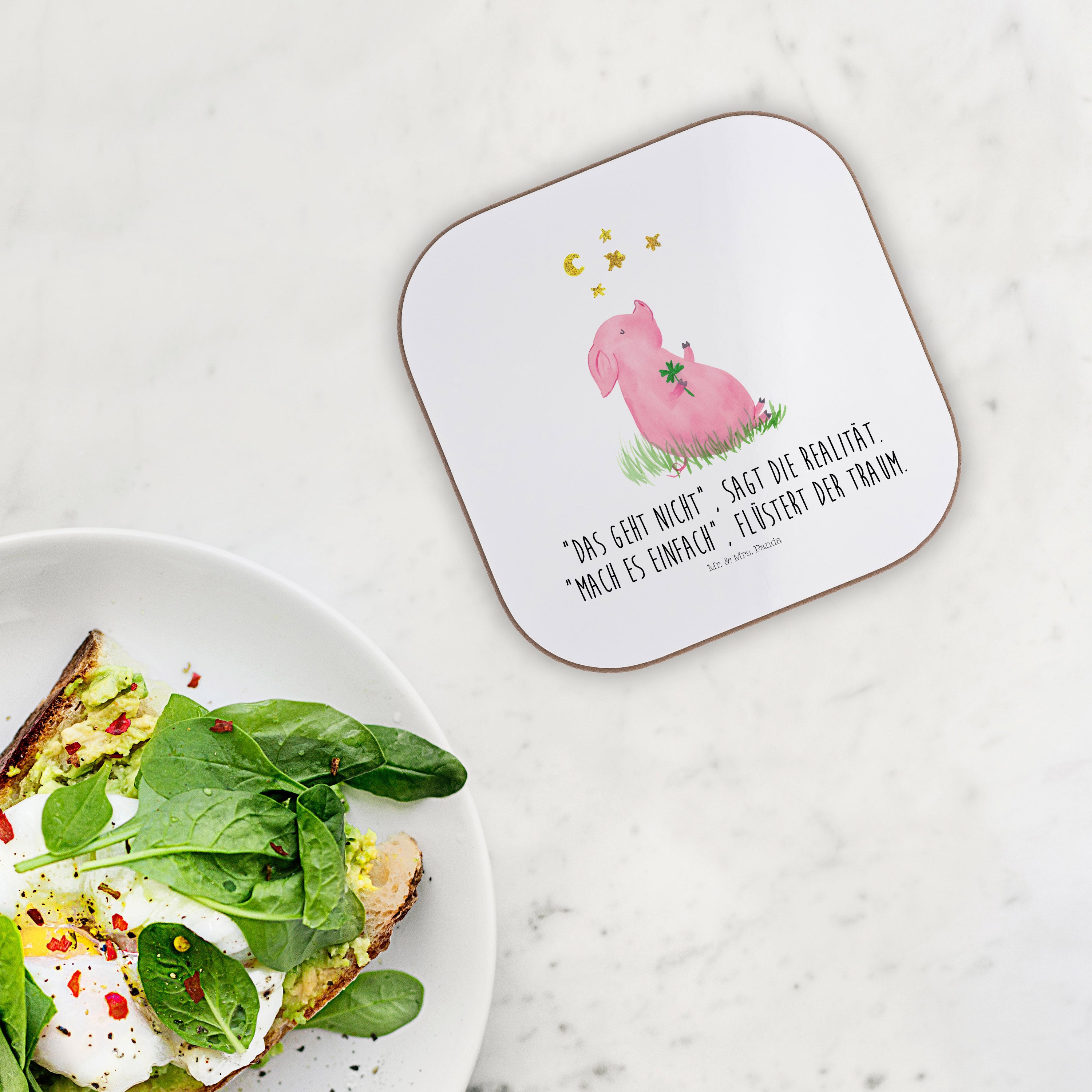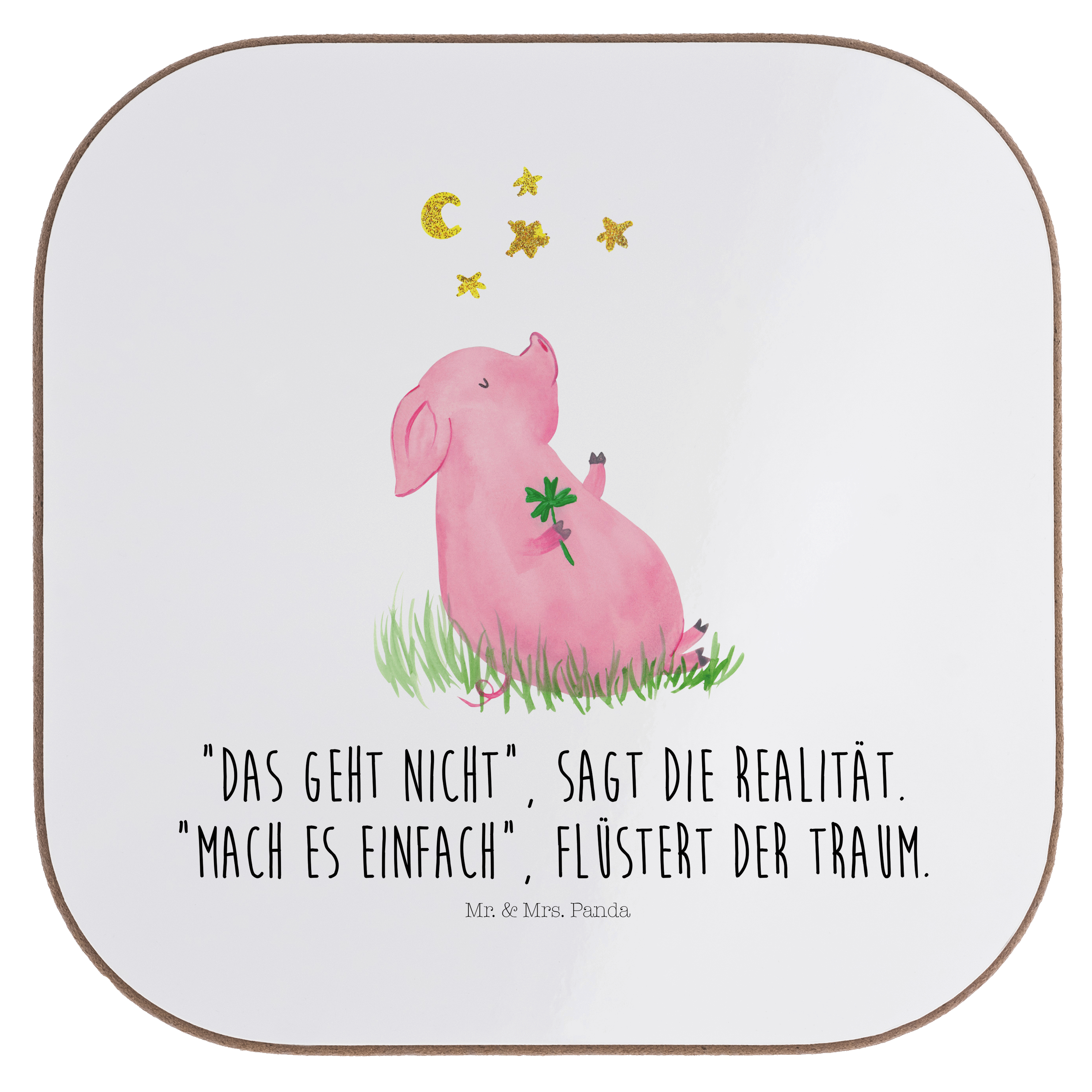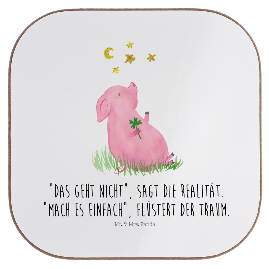 Quadratische Untersetzer Glücksschwein - mit Spruch - Weiß