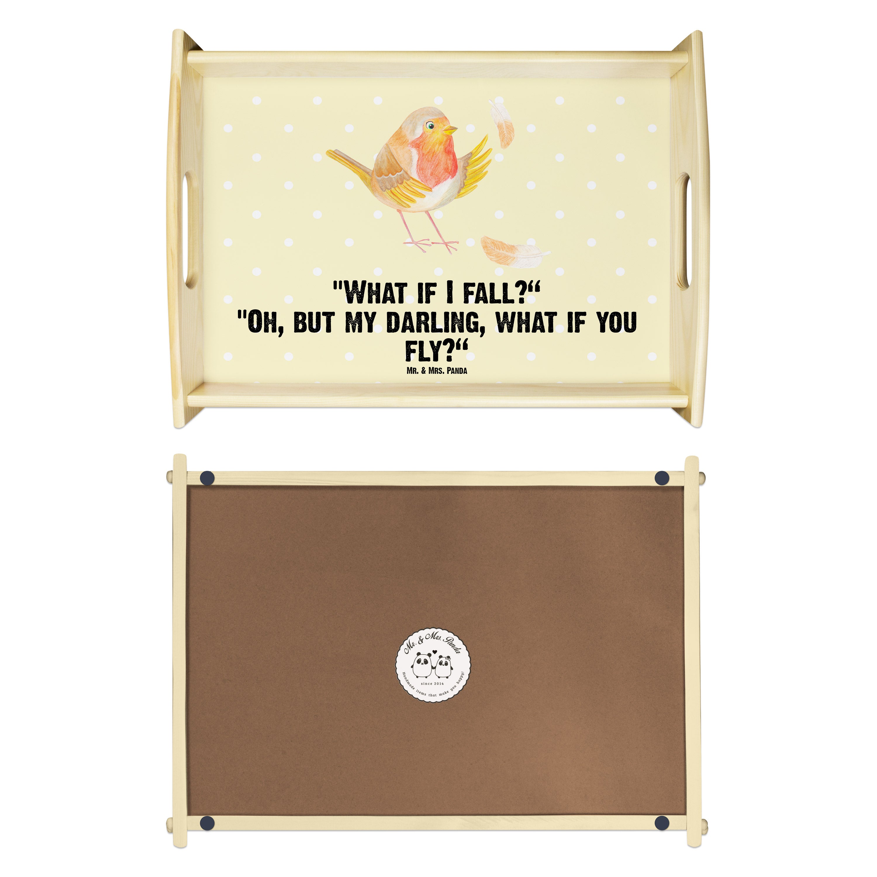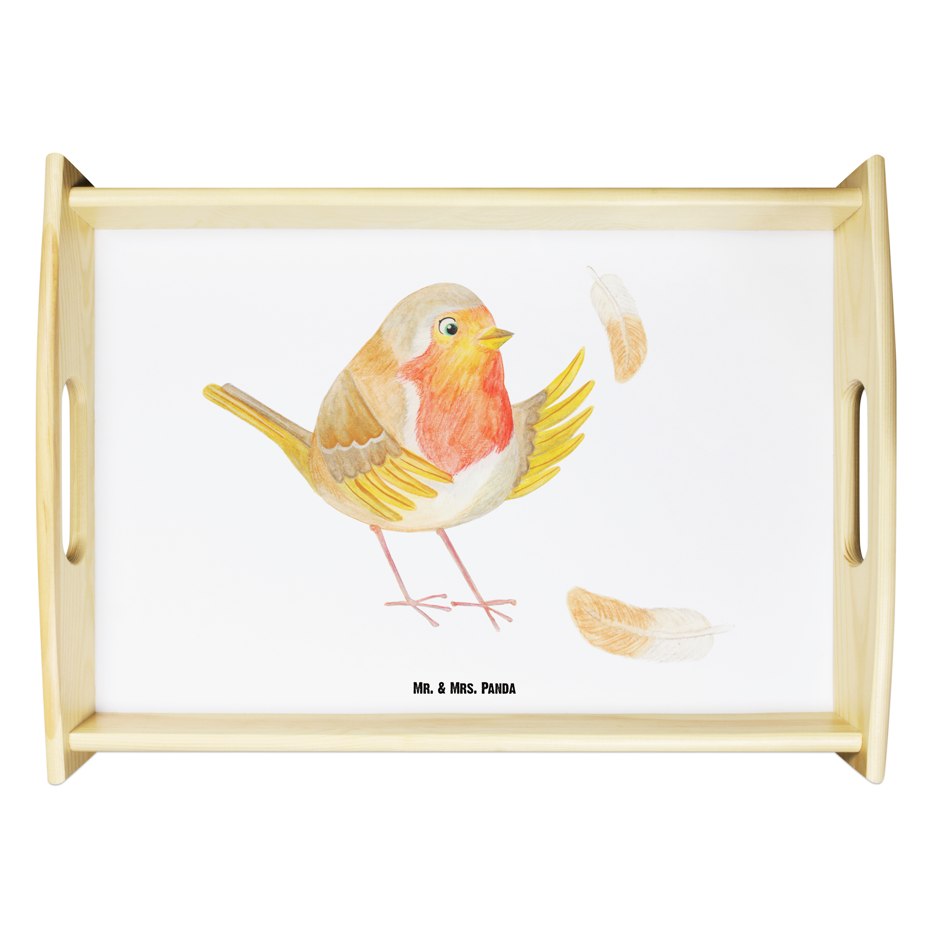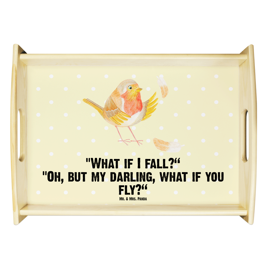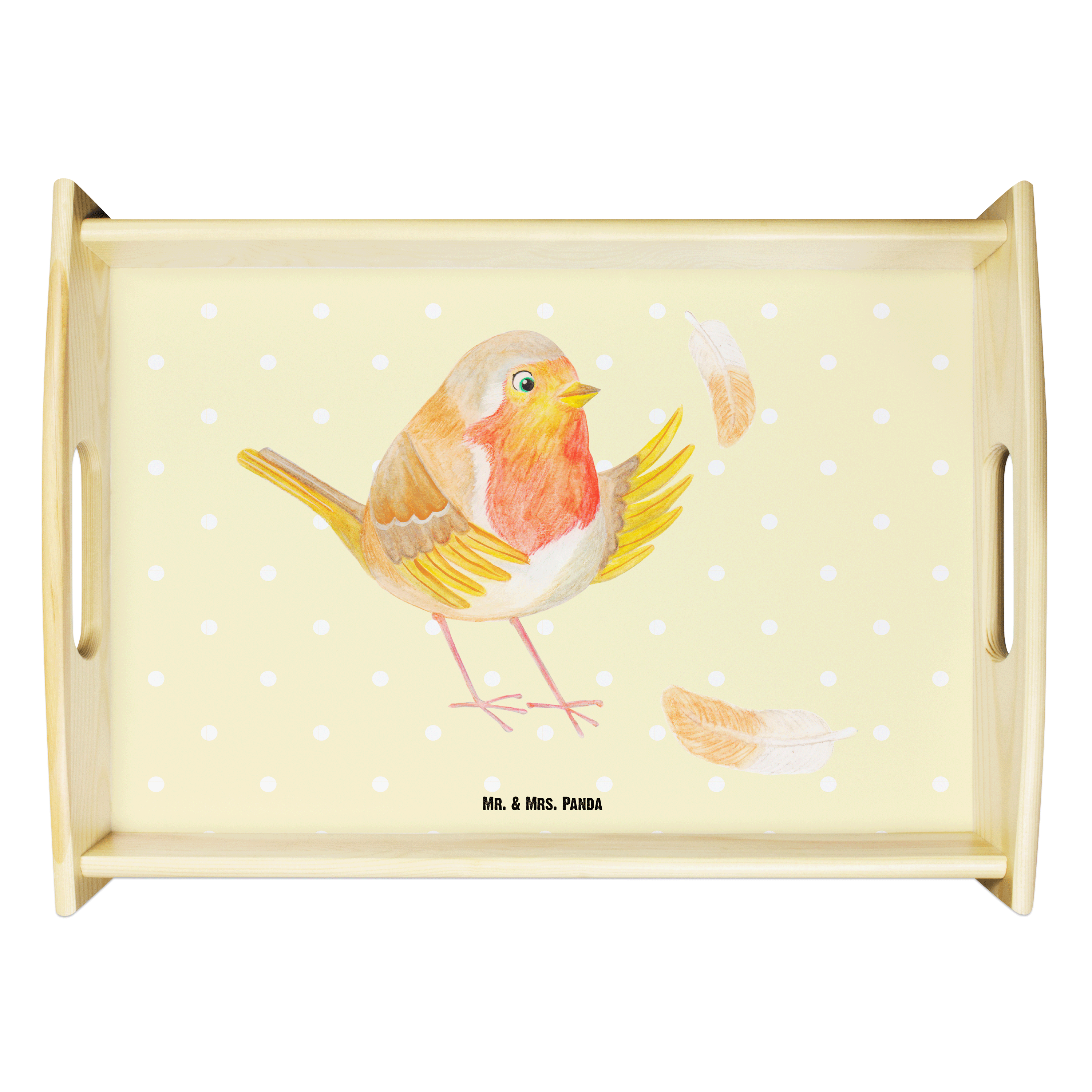 Serviertablett Rotkehlchen mit Federn - mit Spruch - Gelb Pastell
