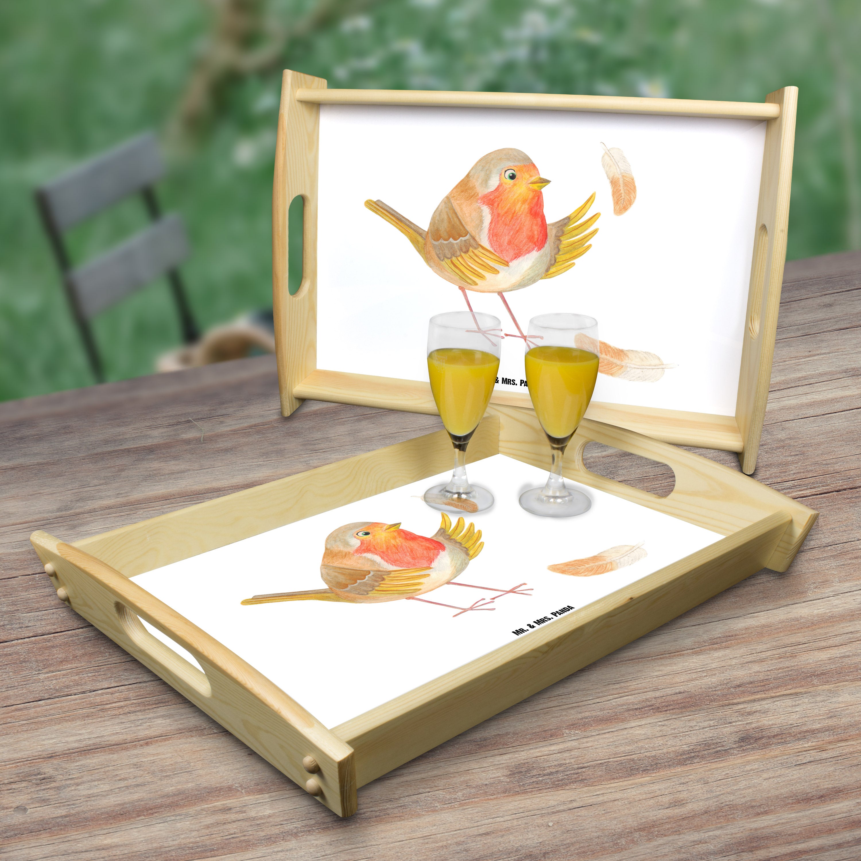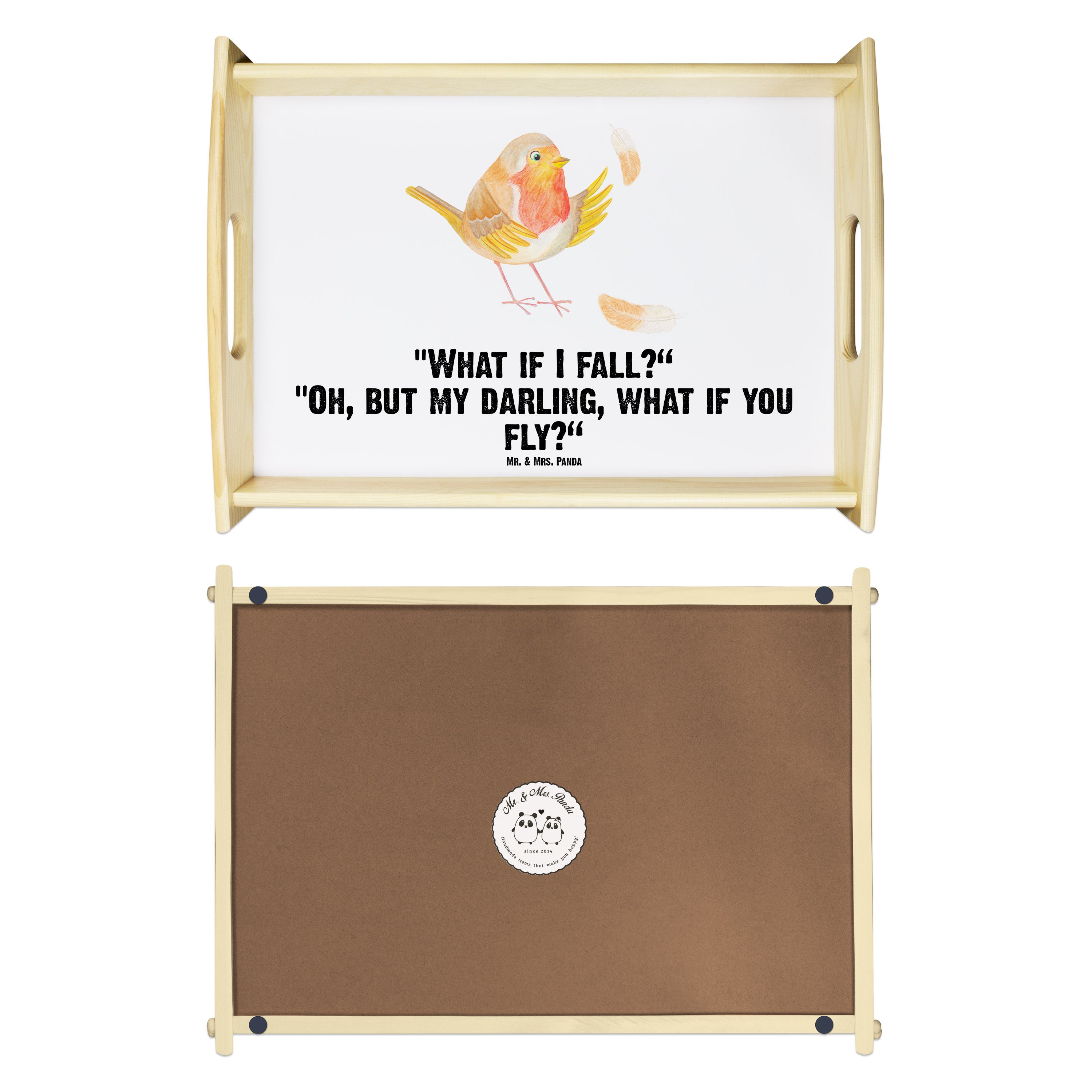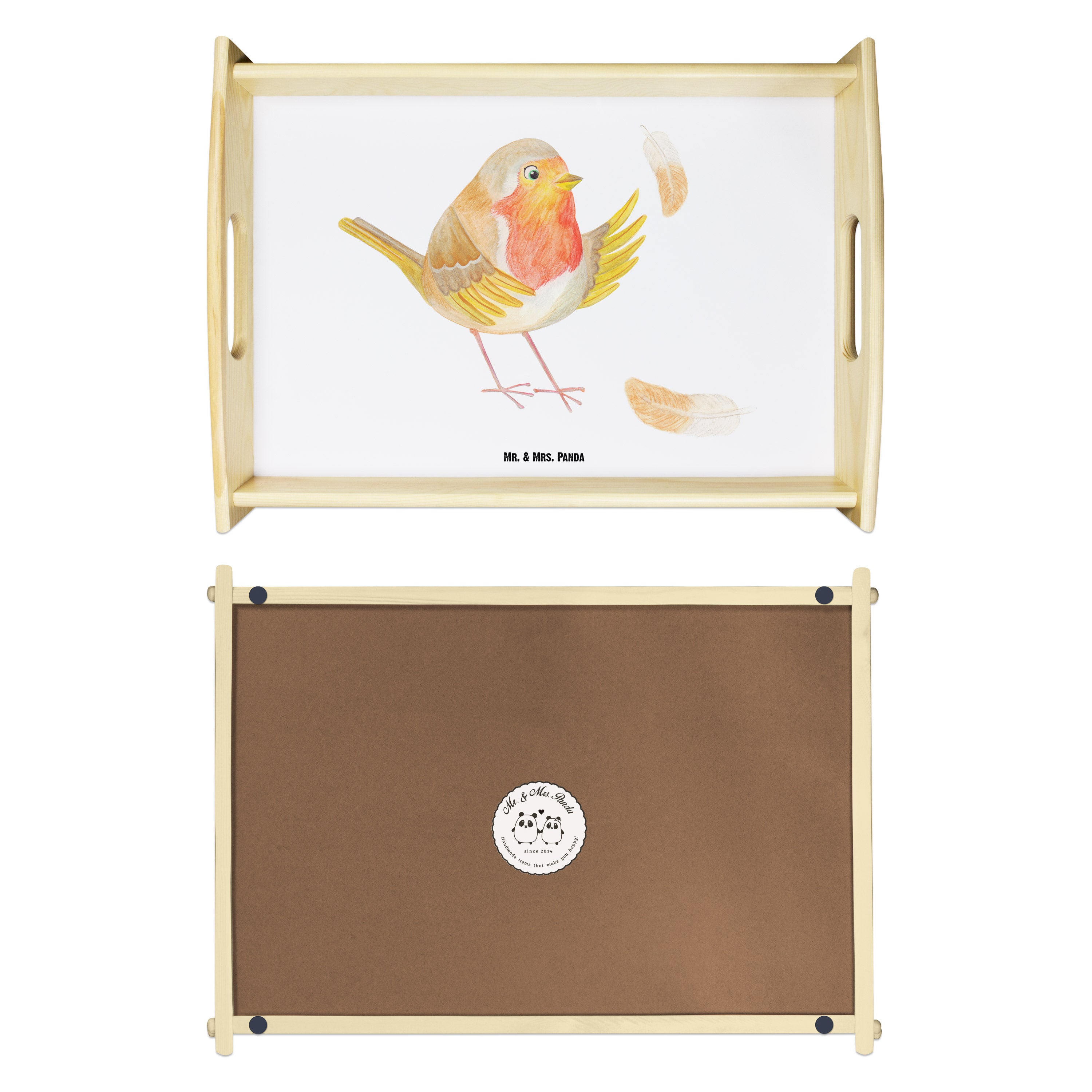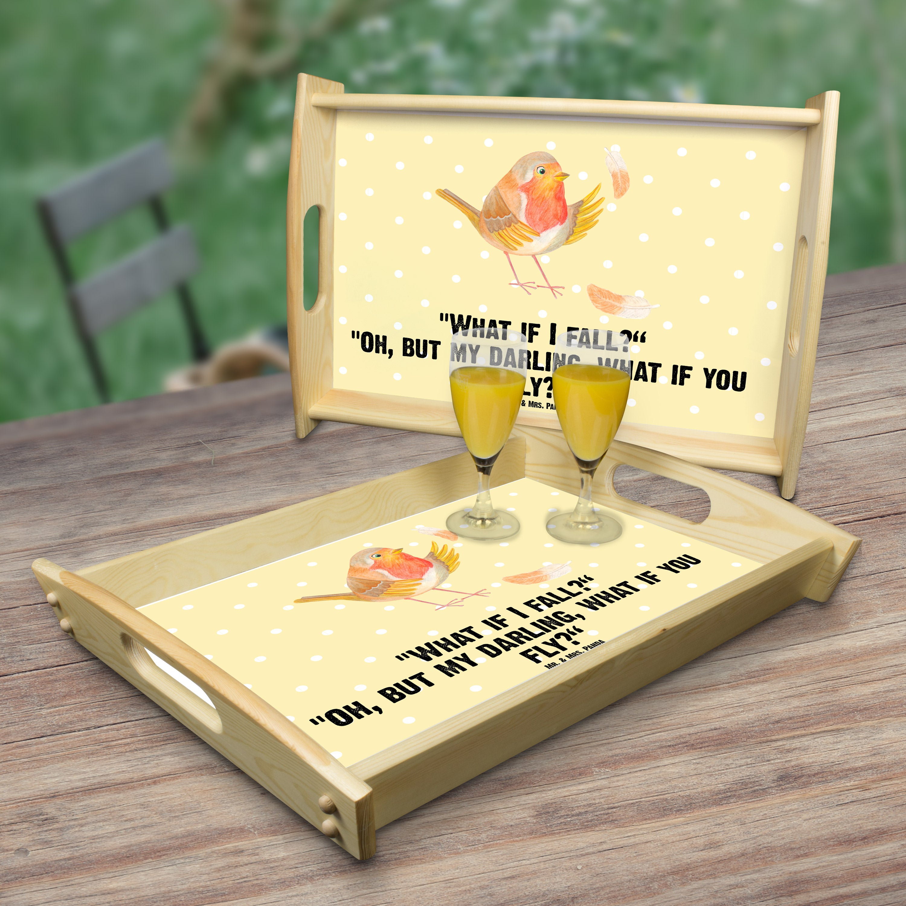Serviertablett Rotkehlchen mit Federn - mit Spruch - Gelb Pastell
