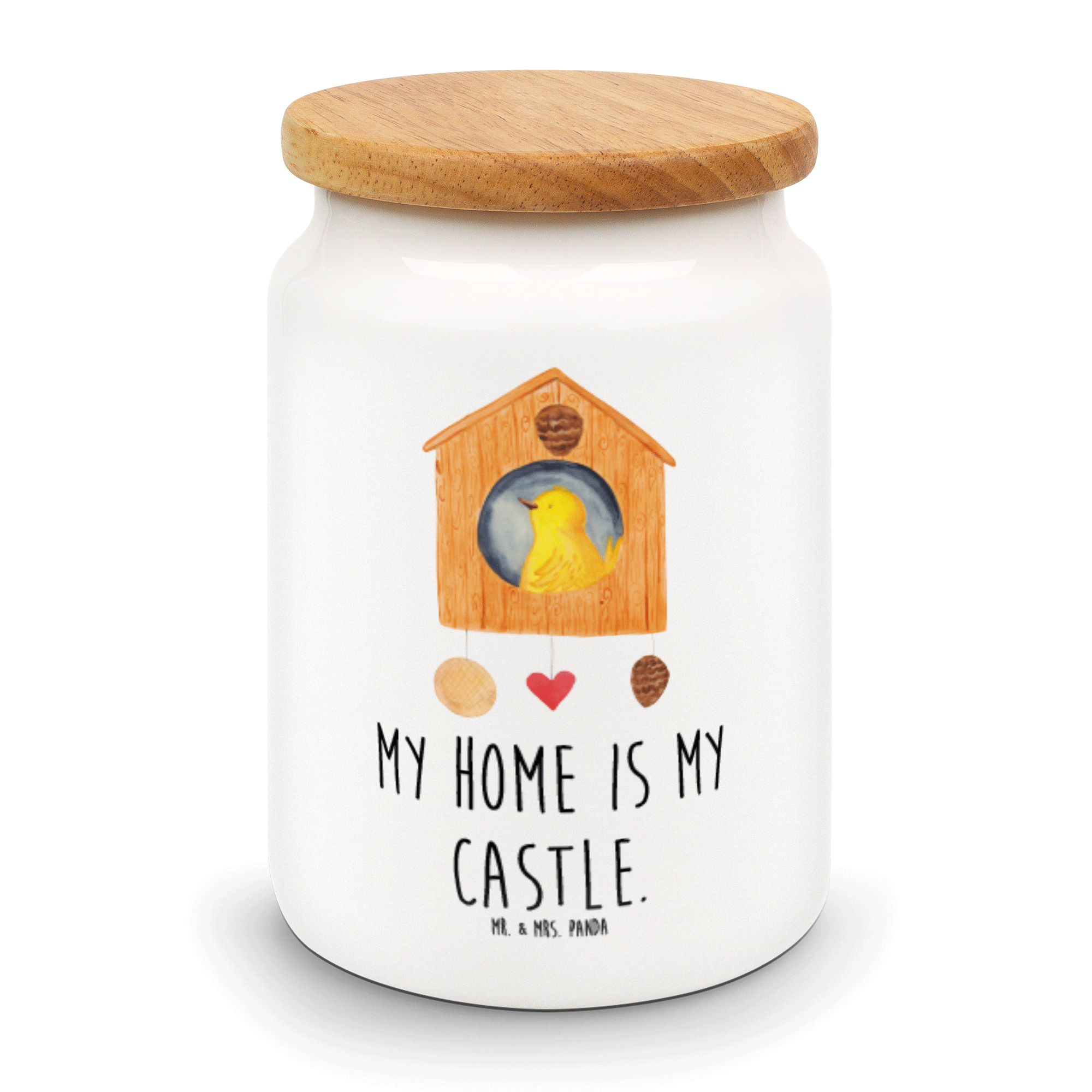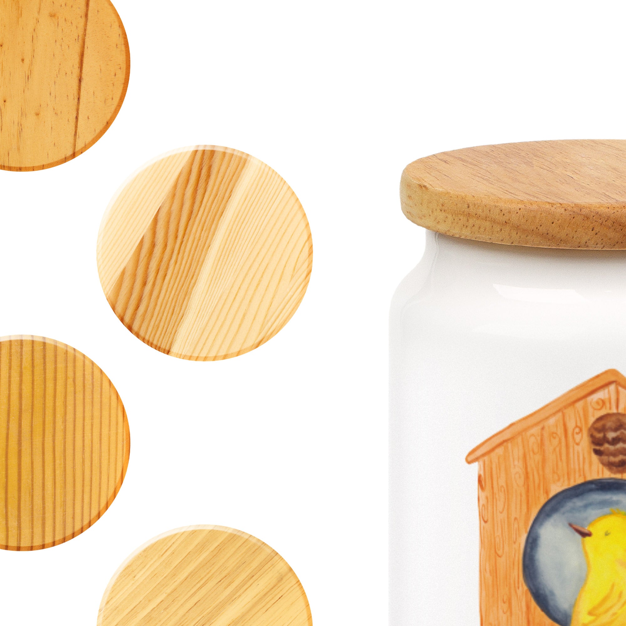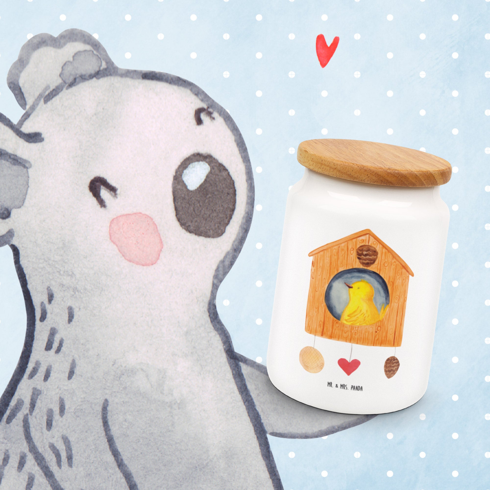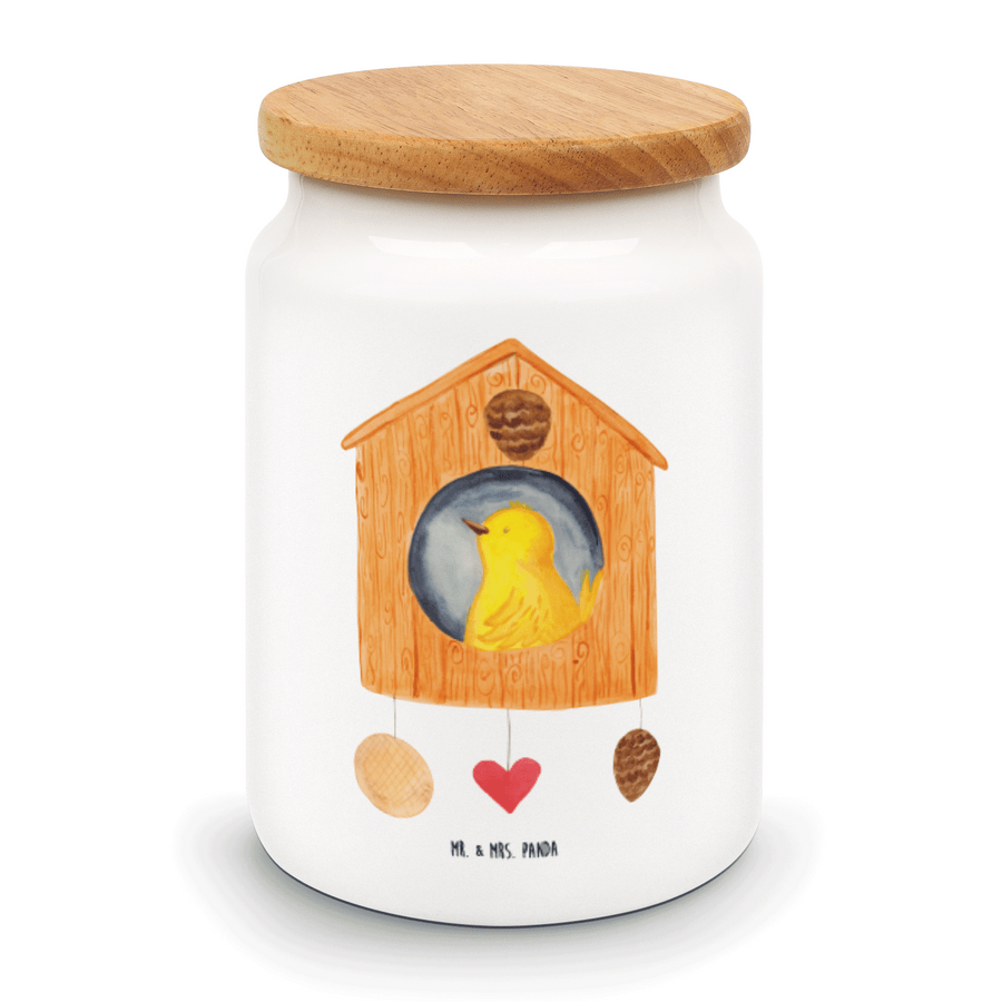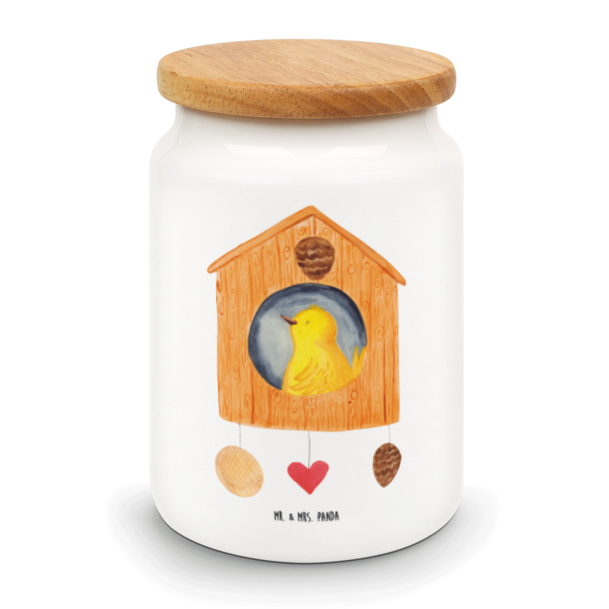 Der kleine Vogel ist mächtig stolz auf sein Vogelhäuschen. Das ist aber auch eine zauberhafte Immobilie... Handgezeichnet von Mrs. Panda in Aquarelle.