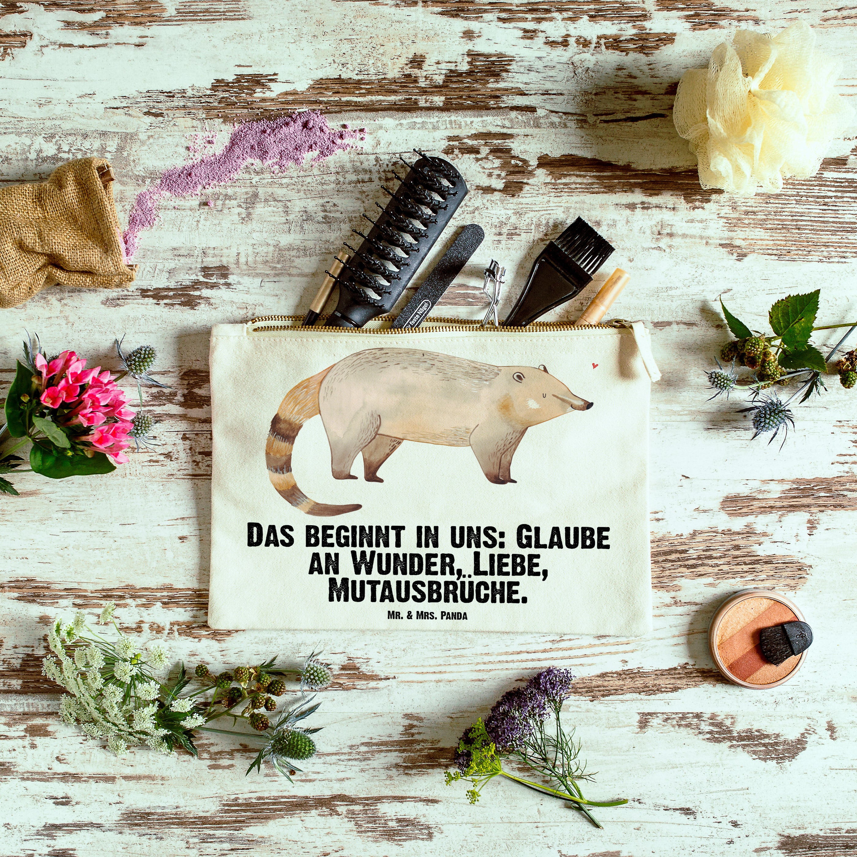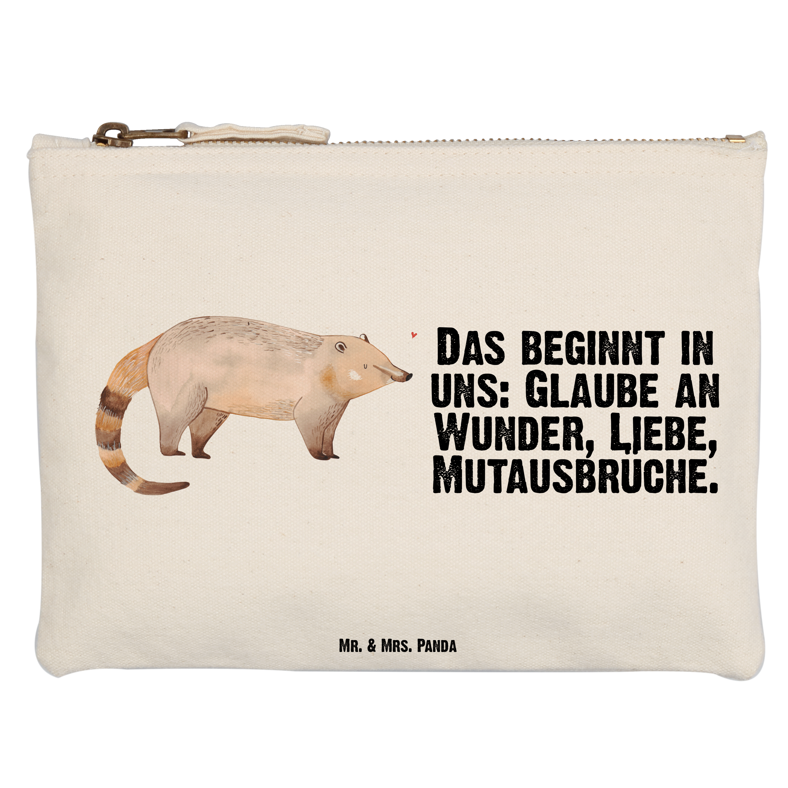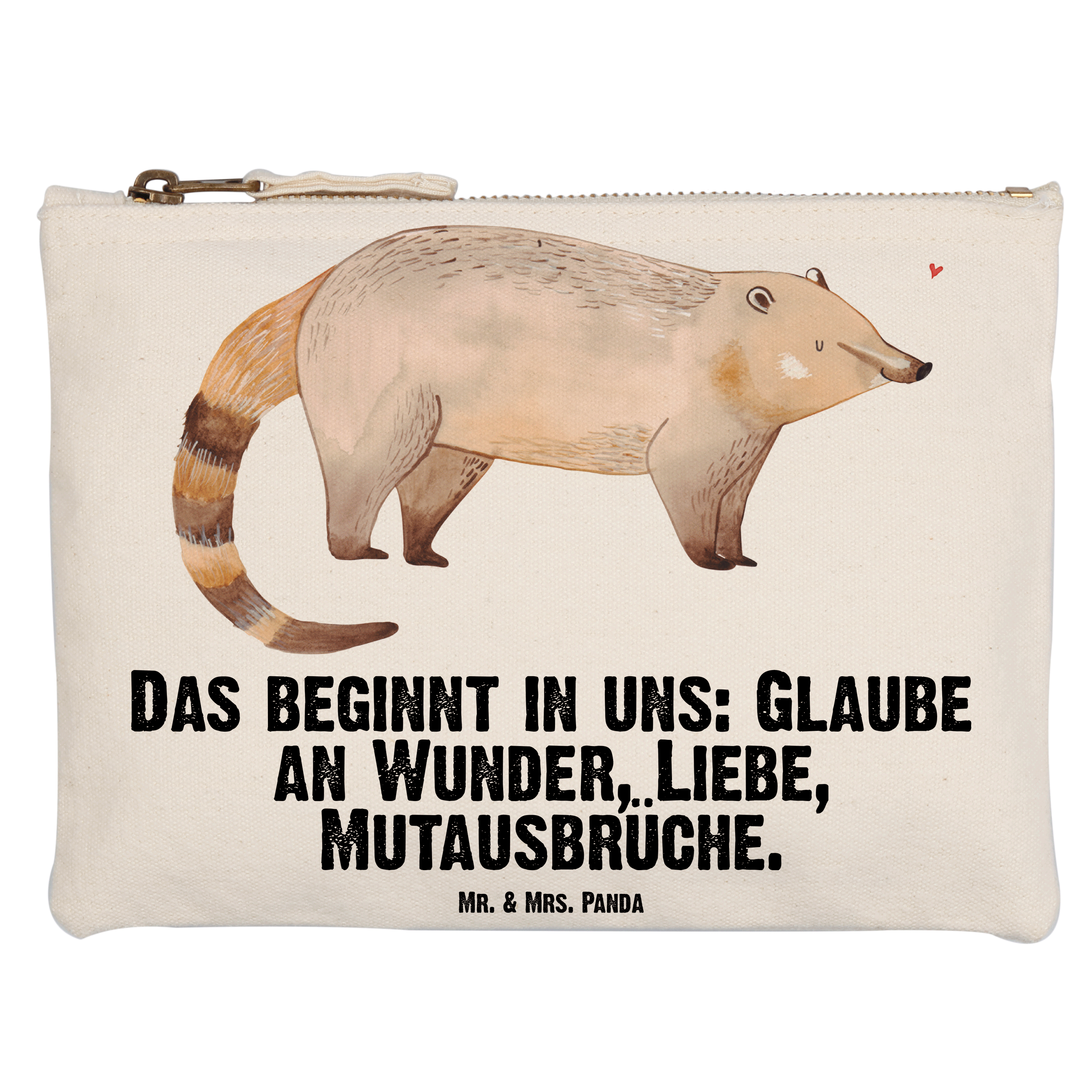 Eine wunderschöne Schminktasche von Mr. & Mrs. Panda mit Reißverschlussfach. Diese Kosmetiktasche oder Kosmetikbeutel ist aus 100% Baumwolle und bedruckt mit unseren wunderschönen handgezeichneten Motiven. Hol dir dieses einzigartige Etui direkt nach Hause - du kannst die Tasche auch perfekt als Stiftemäppchen, Federmappe, Schlamper oder Etui verwenden.
