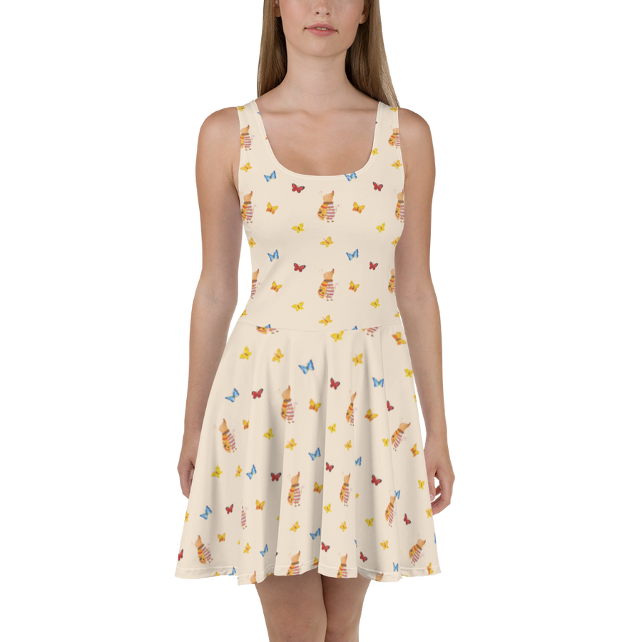 - Das Kleid ist leicht ausgestellt und reicht bis zur Hälfte der Knie.
