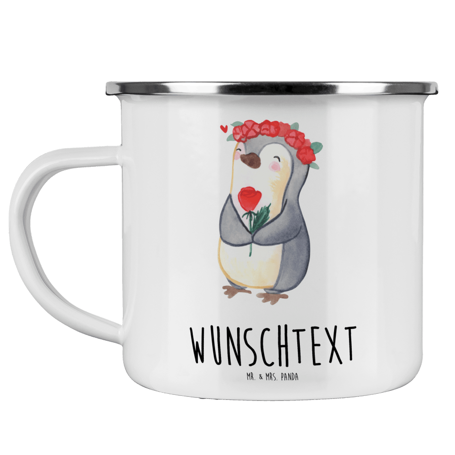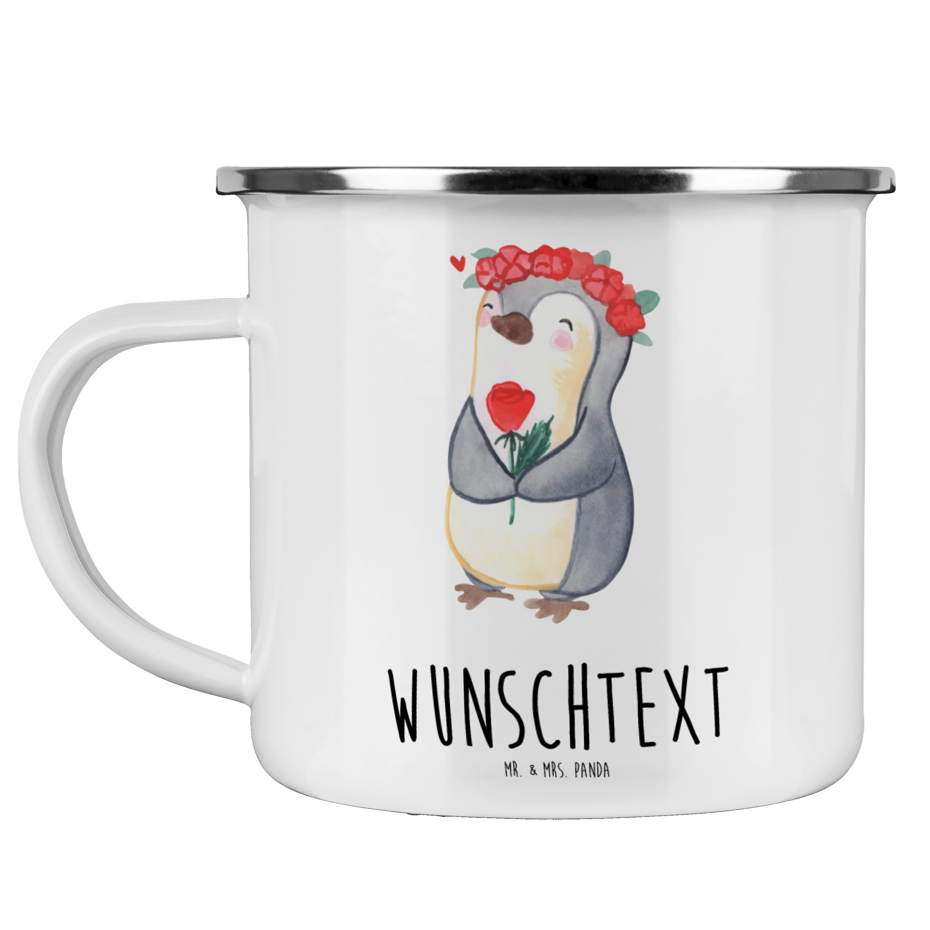 Diese wunderschöne personalisierte Emailletasse von Mr. & Mrs. Panda mit abgesetztem Edelstahl Rand in Emaille Optik ist der perfekte, bruchsichere Begleiter für dein nächstes Abenteuer. Sie wird von uns liebevoll mit deinem Namen oder Wunschnamen bedruckt. Das Füllvolumen des Bechers beträgt 300 ml. So sind die Motivtassen ideal beim Camping als Campingbecher einsetzbar.