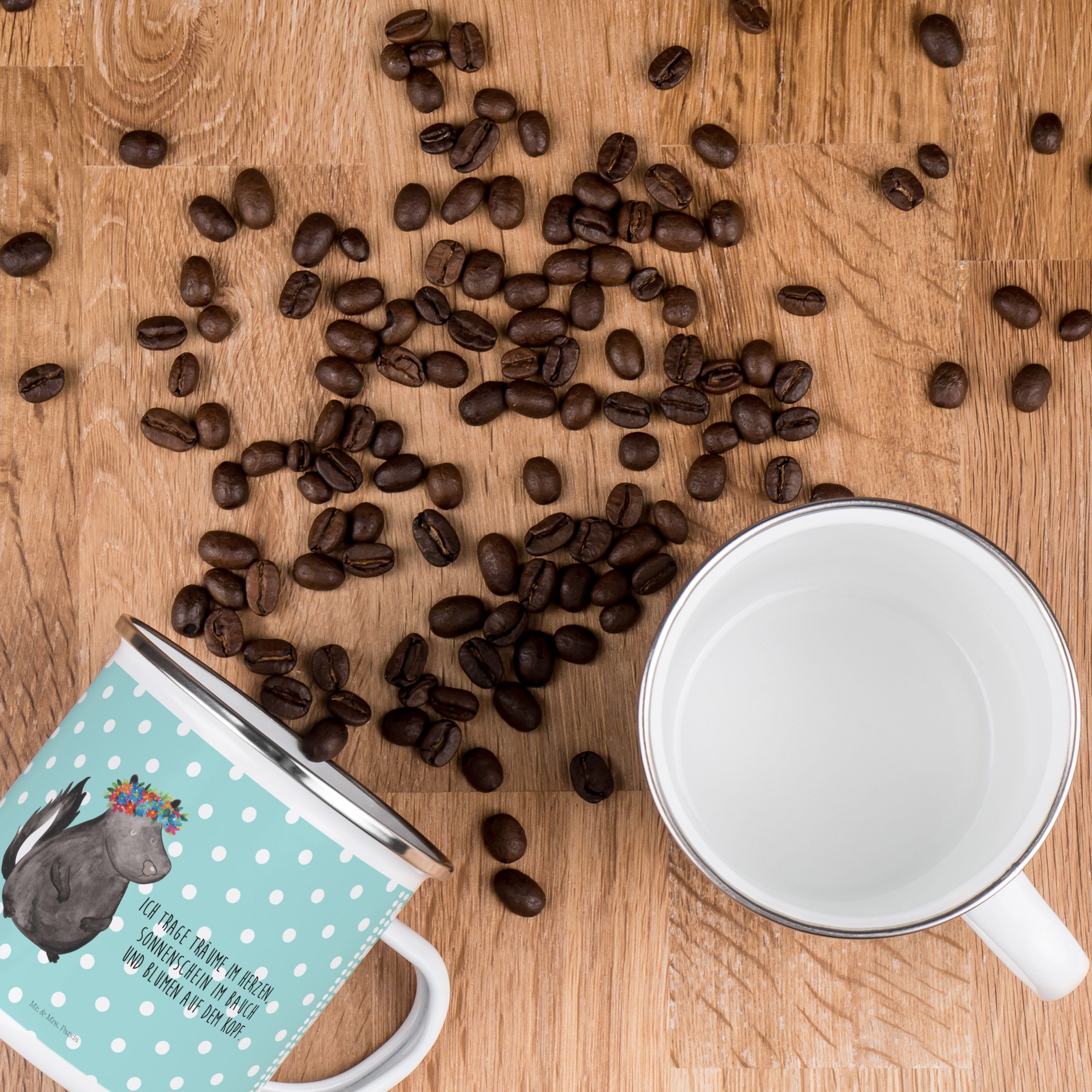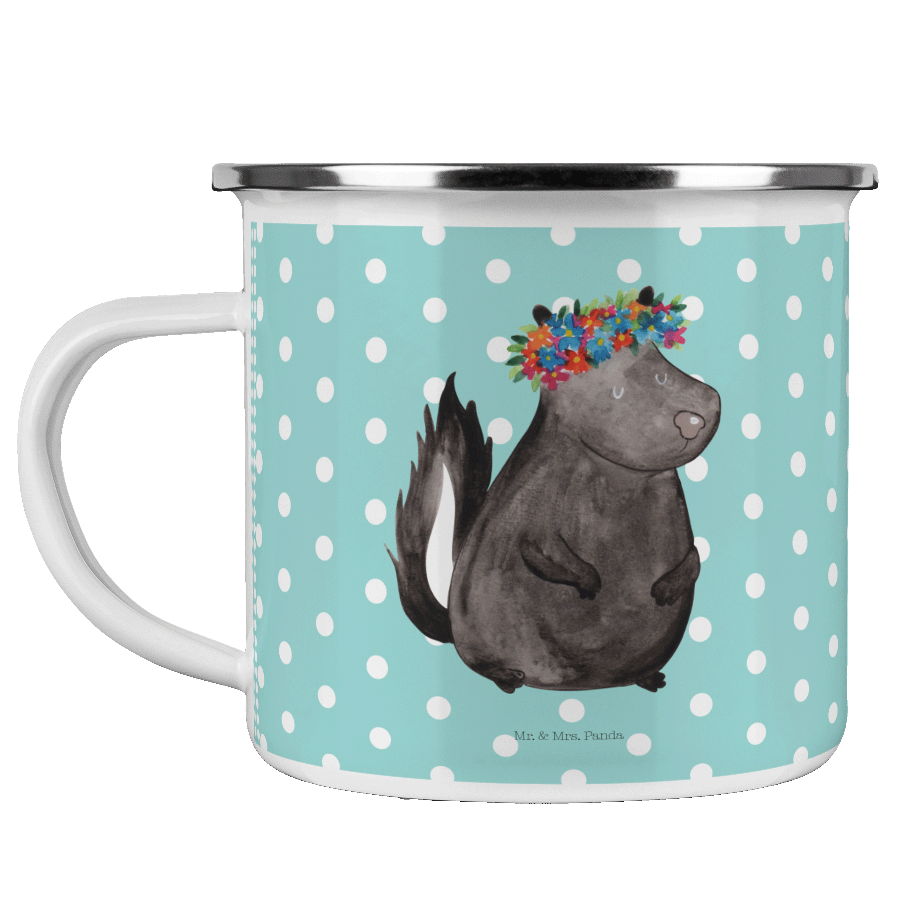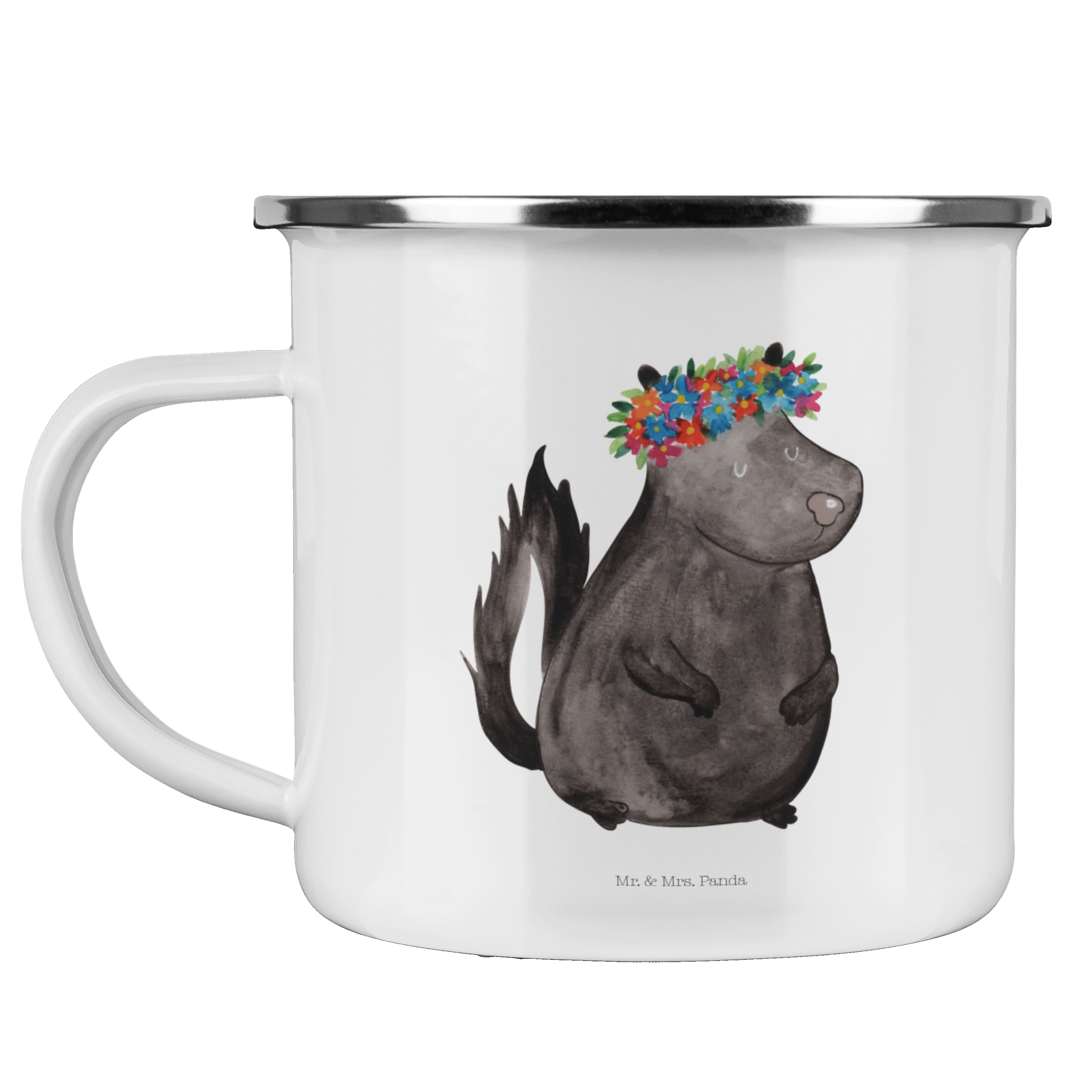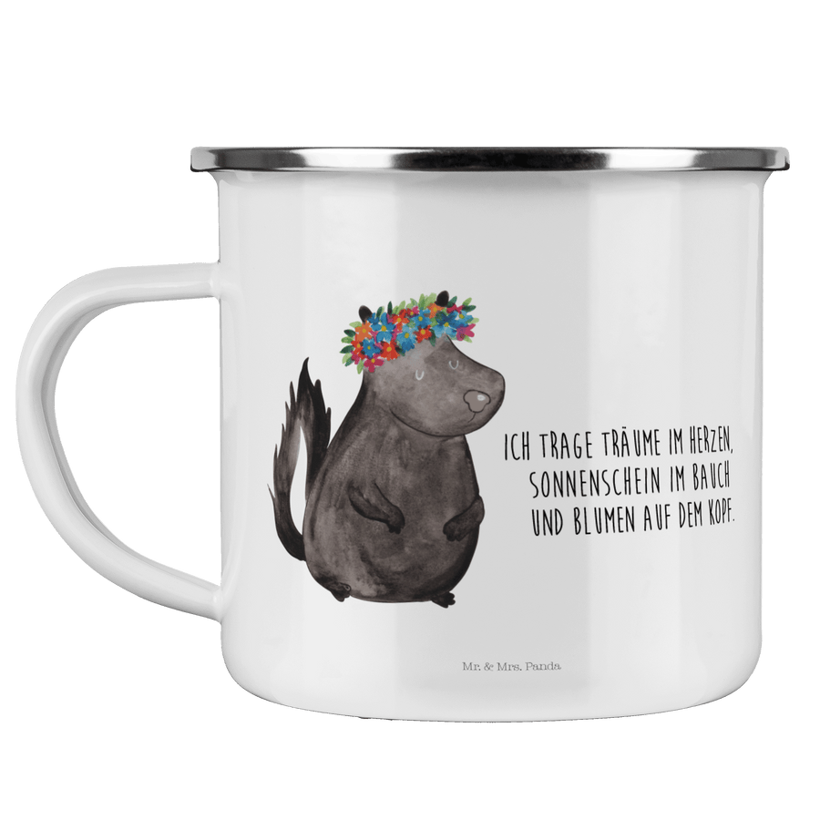 Camping Emaille Tasse Stinktier Blumenmaedchen - mit Spruch - Weiß
