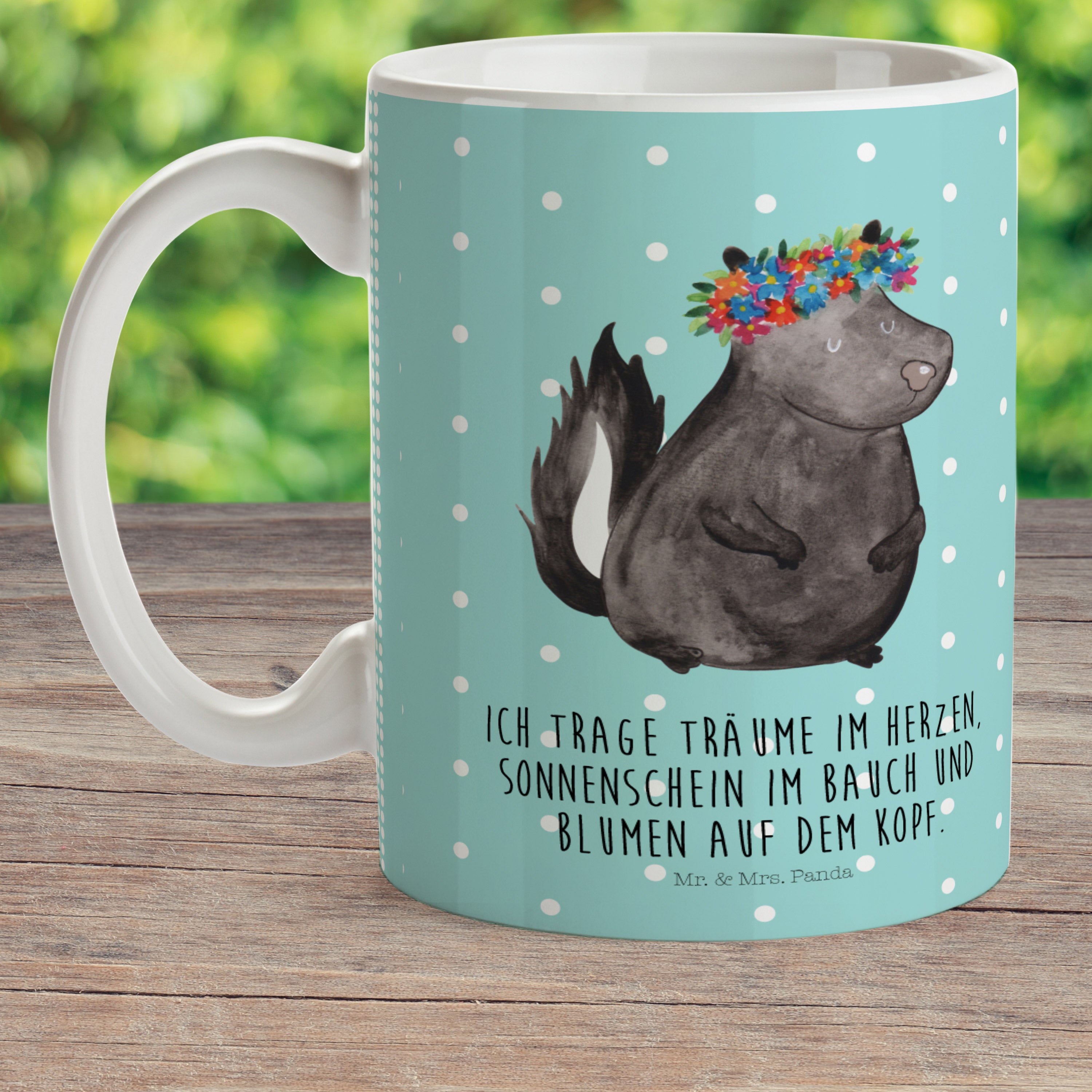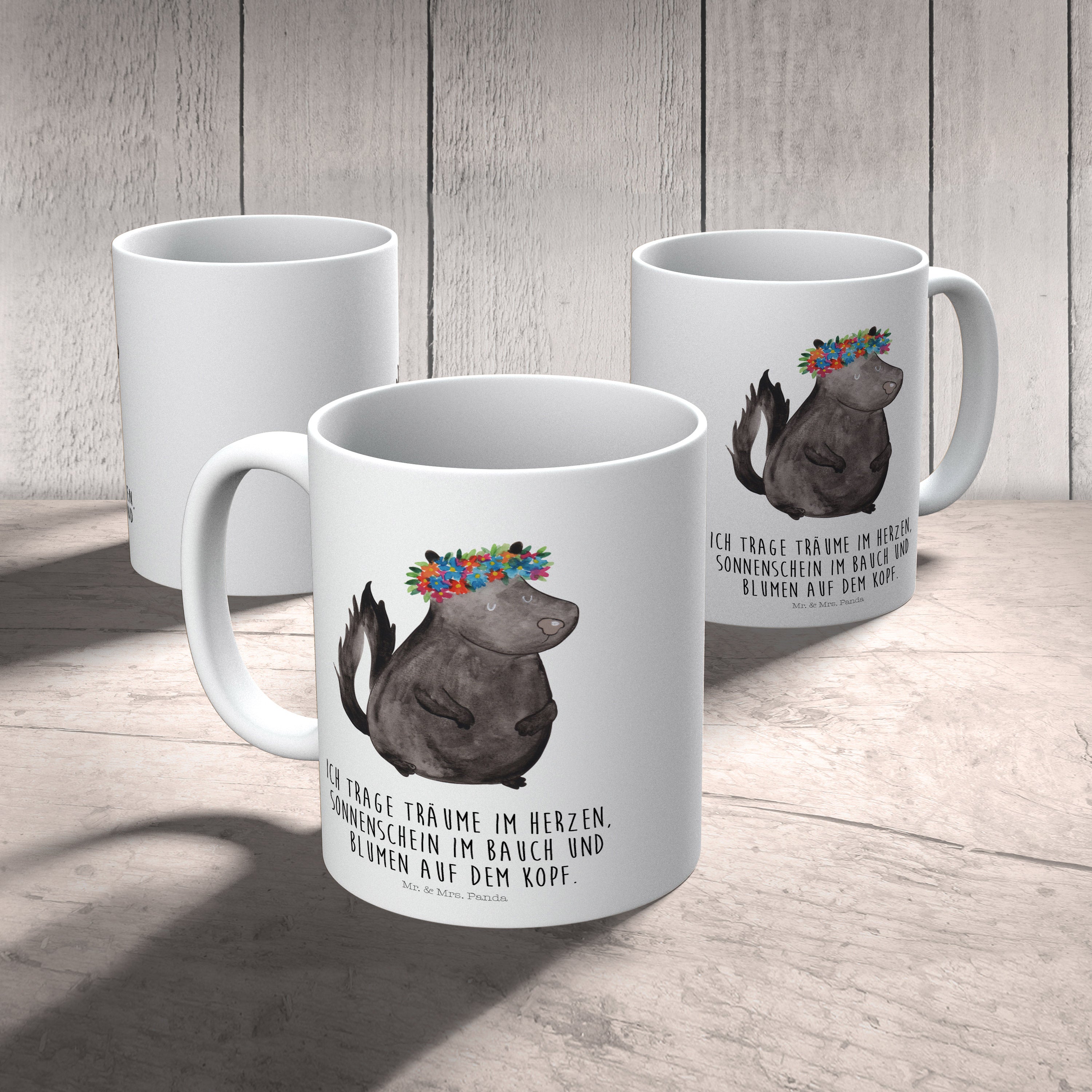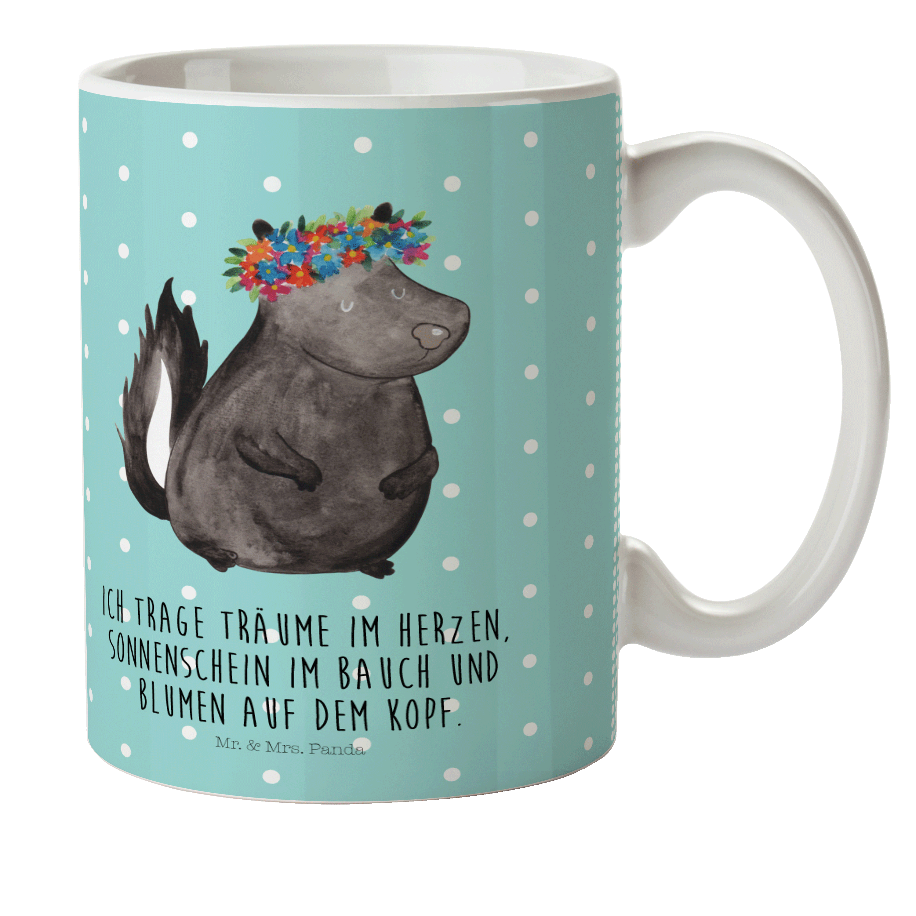 Es gibt nichts Schöneres, als die Natur in ihrer puren Form zu erleben. Das Stinktier Blumenmädchen-Motiv von Mr. & Mrs. Panda präsentiert die wundervolle Natur auf eine besondere und einzigartige Art und Weise. Das süße Stinktier mit einem bunten Blumenkranz auf dem Kopf erfüllt Dich mit Freude und ihm zu begegnen, macht Deinen Tag einzigartig. Es ist nicht nur ein Kunstwerk, sondern auch ein Symbol der Schönheit, die in der Natur zu finden ist.