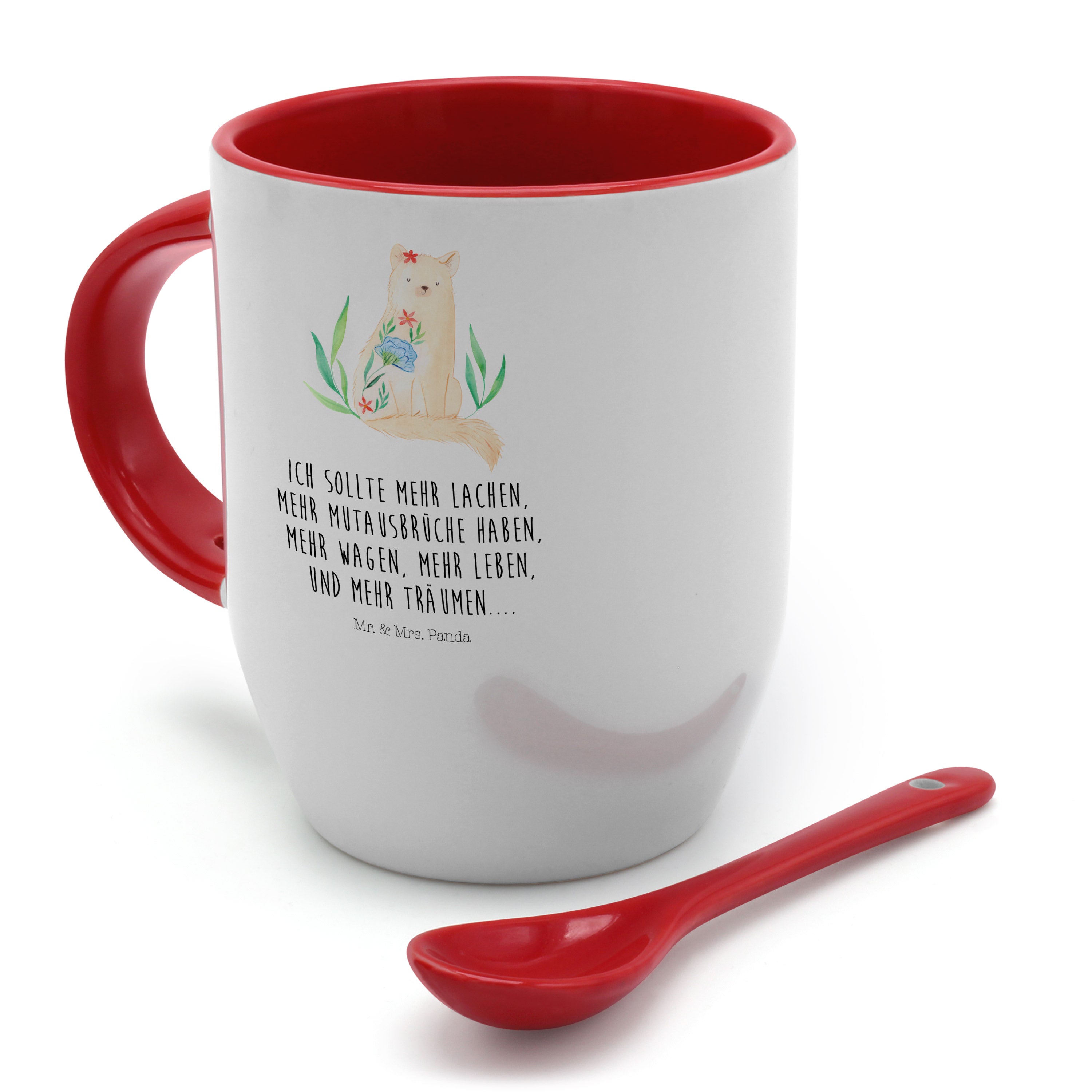 Tasse mit Löffel Katze Blumen - mit Spruch