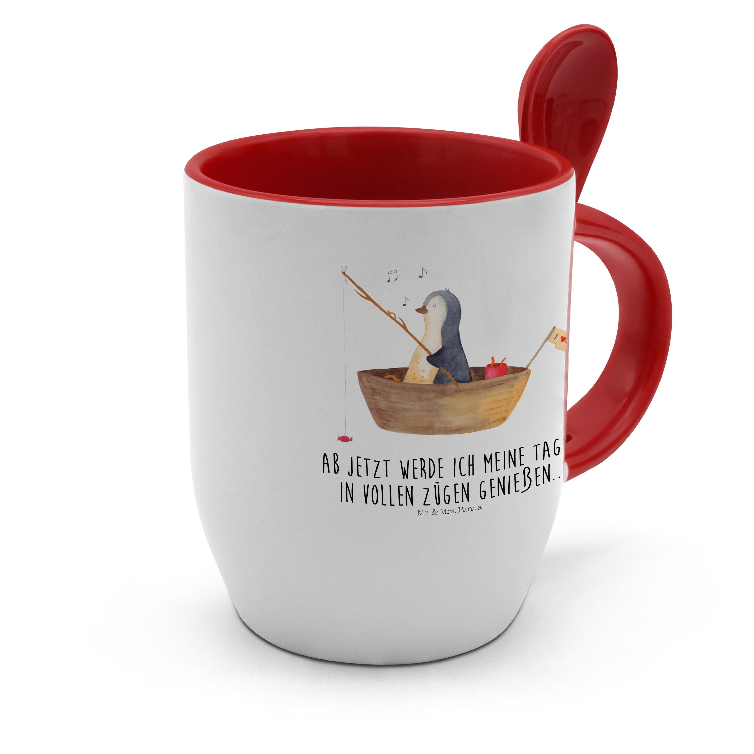 Tasse mit Löffel Pinguin Angelboot Tasse, Kaffeetasse, Tassen, Tasse mit Spruch, Kaffeebecher, Tasse mit Löffel, Pinguin, Pinguine, Angeln, Boot, Angelboot, Lebenslust, Leben, genießen, Motivation, Neustart, Neuanfang, Trennung, Scheidung, Geschenkidee Liebeskummer