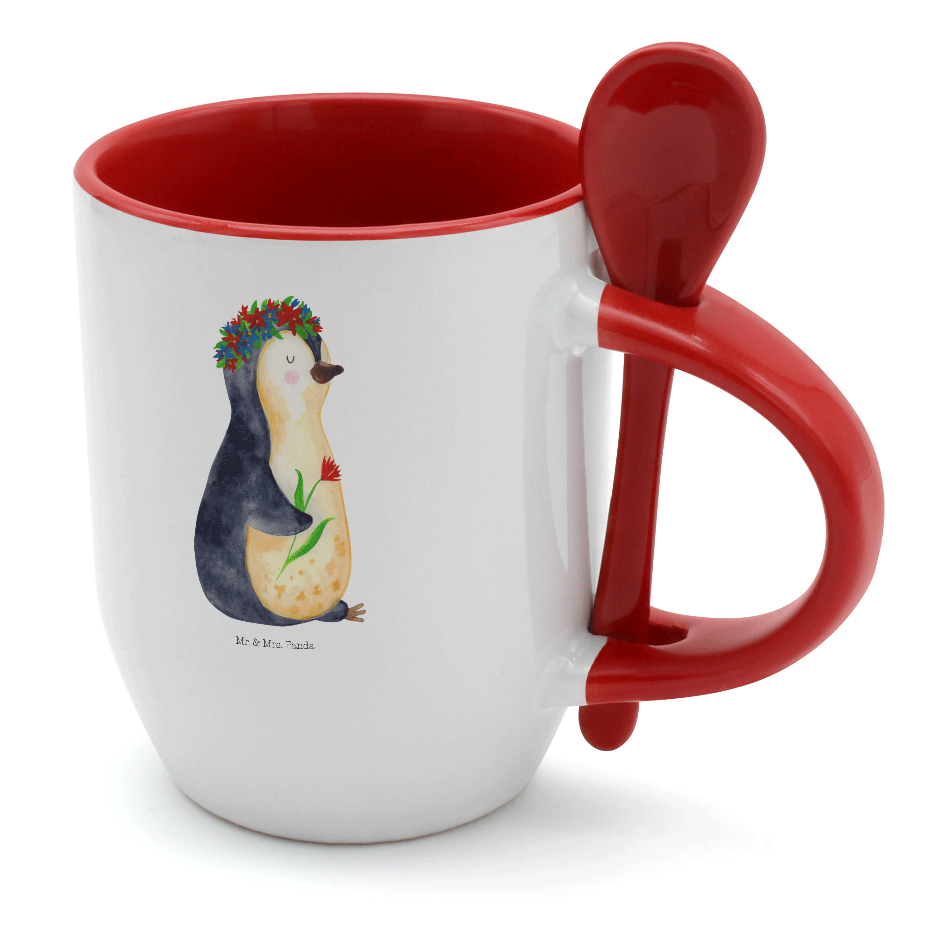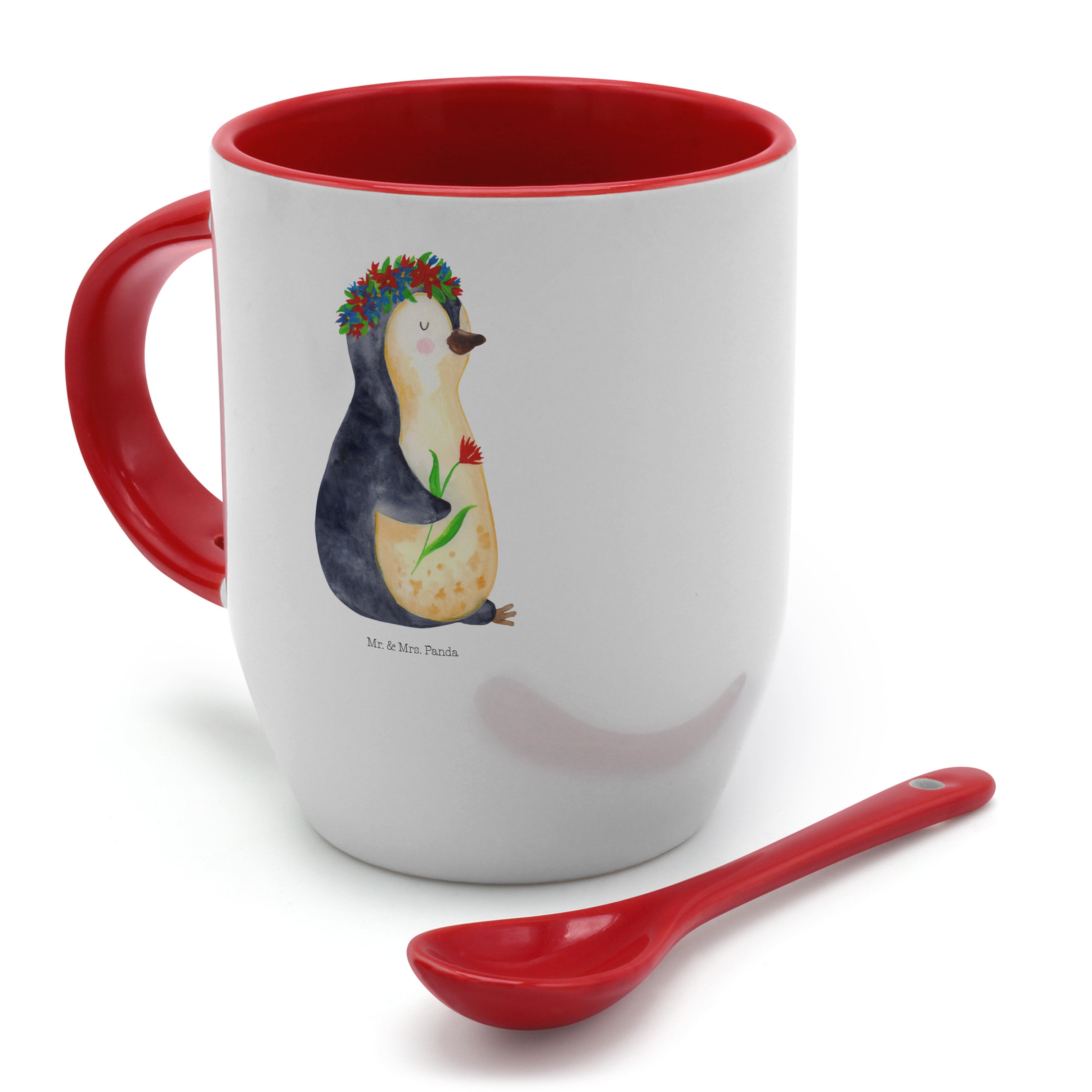 Tasse mit Löffel Pinguin Blumenkranz - mit Spruch