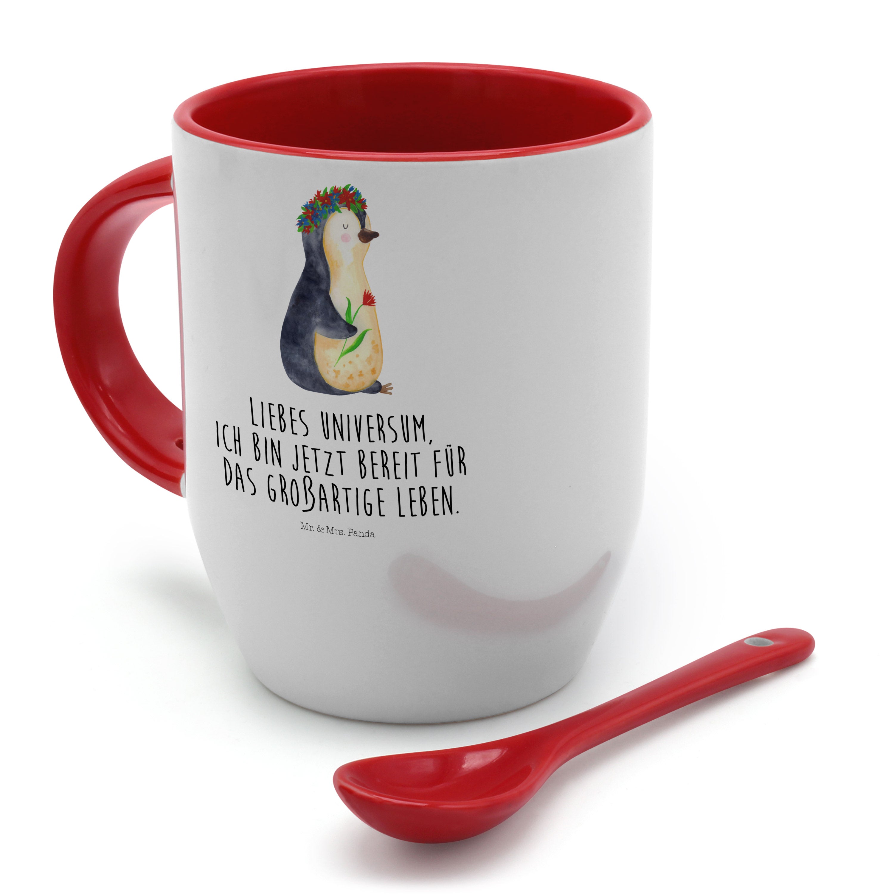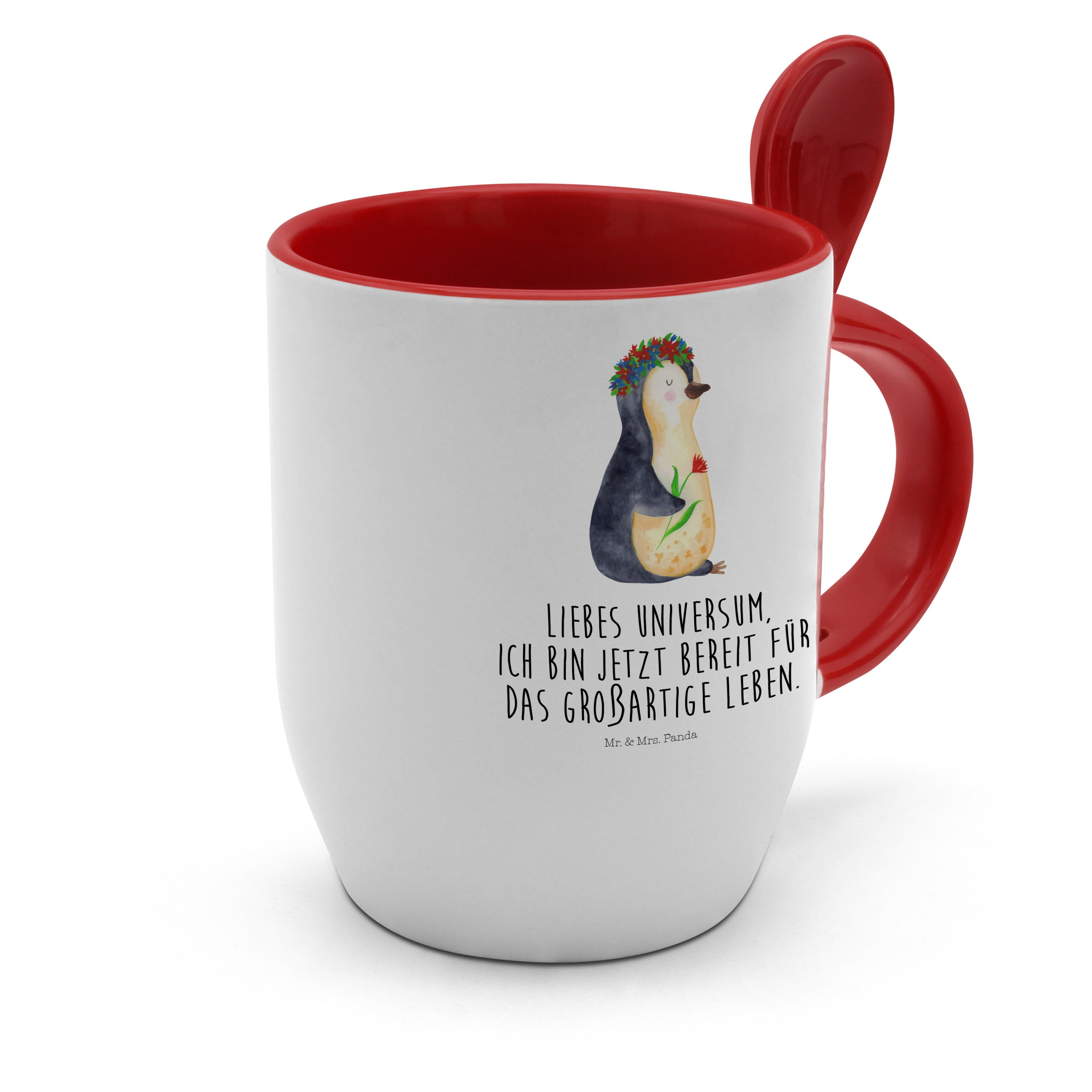 Tasse mit Löffel Pinguin Blumenkranz Tasse, Kaffeetasse, Tassen, Tasse mit Spruch, Kaffeebecher, Tasse mit Löffel, Pinguin, Pinguine, Blumenkranz, Universum, Leben, Wünsche, Ziele, Lebensziele, Motivation, Lebenslust, Liebeskummer, Geschenkidee