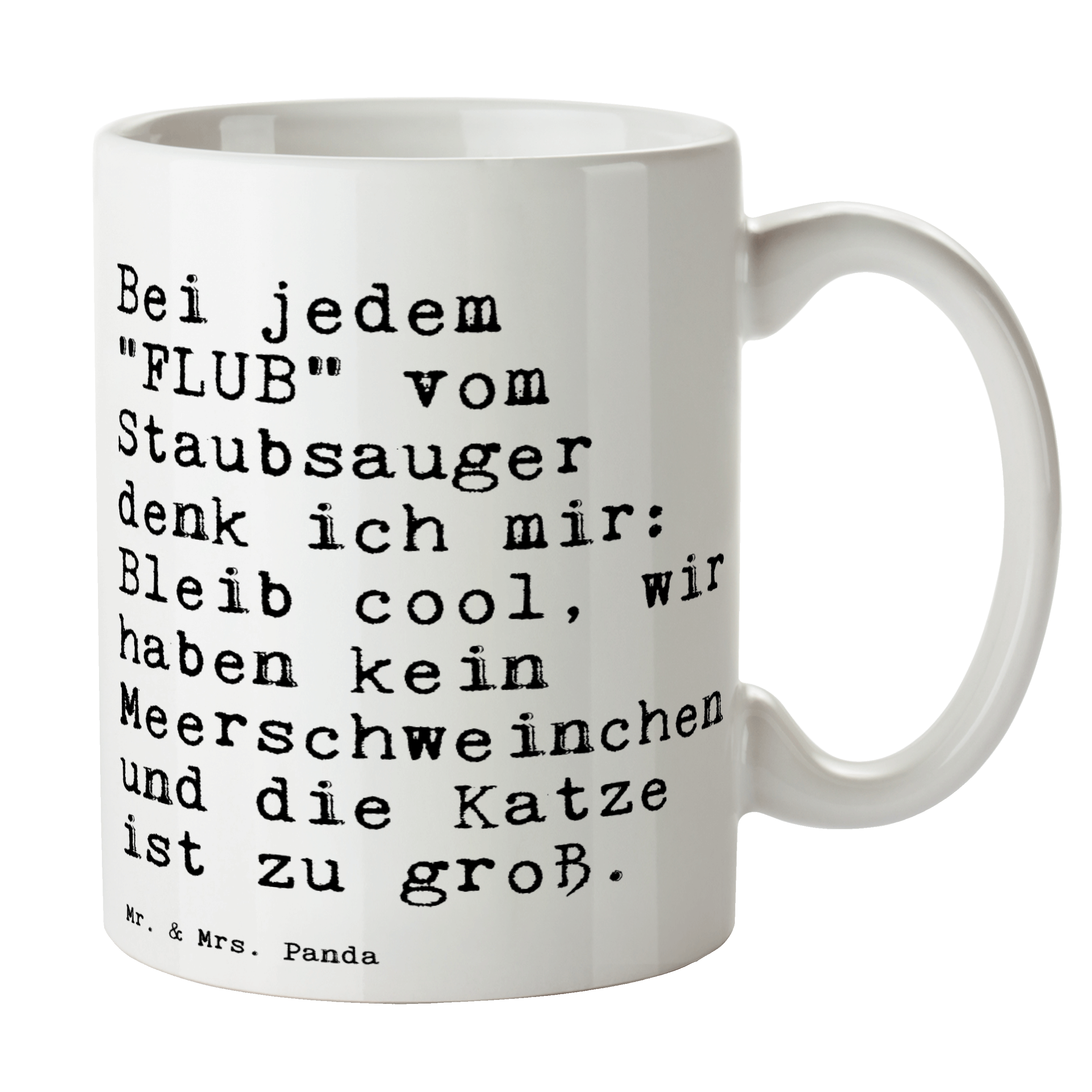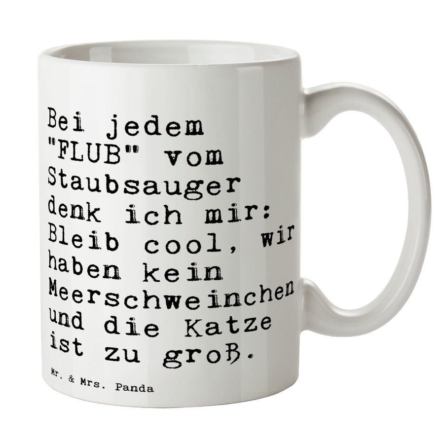 Tasse Text Bei jedem "FLUB" vom Staubsauger denk ich mir: Bleib cool, wir haben kein Meerschweinchen und die Katze ist zu groß.