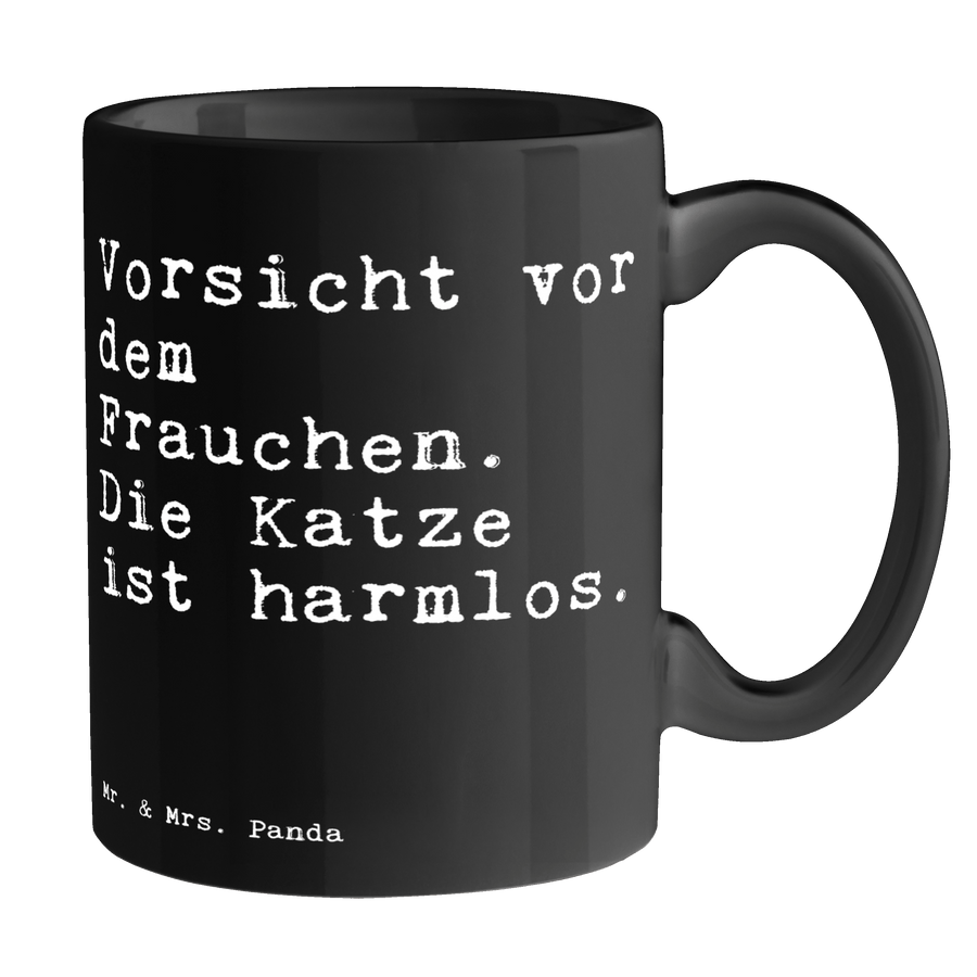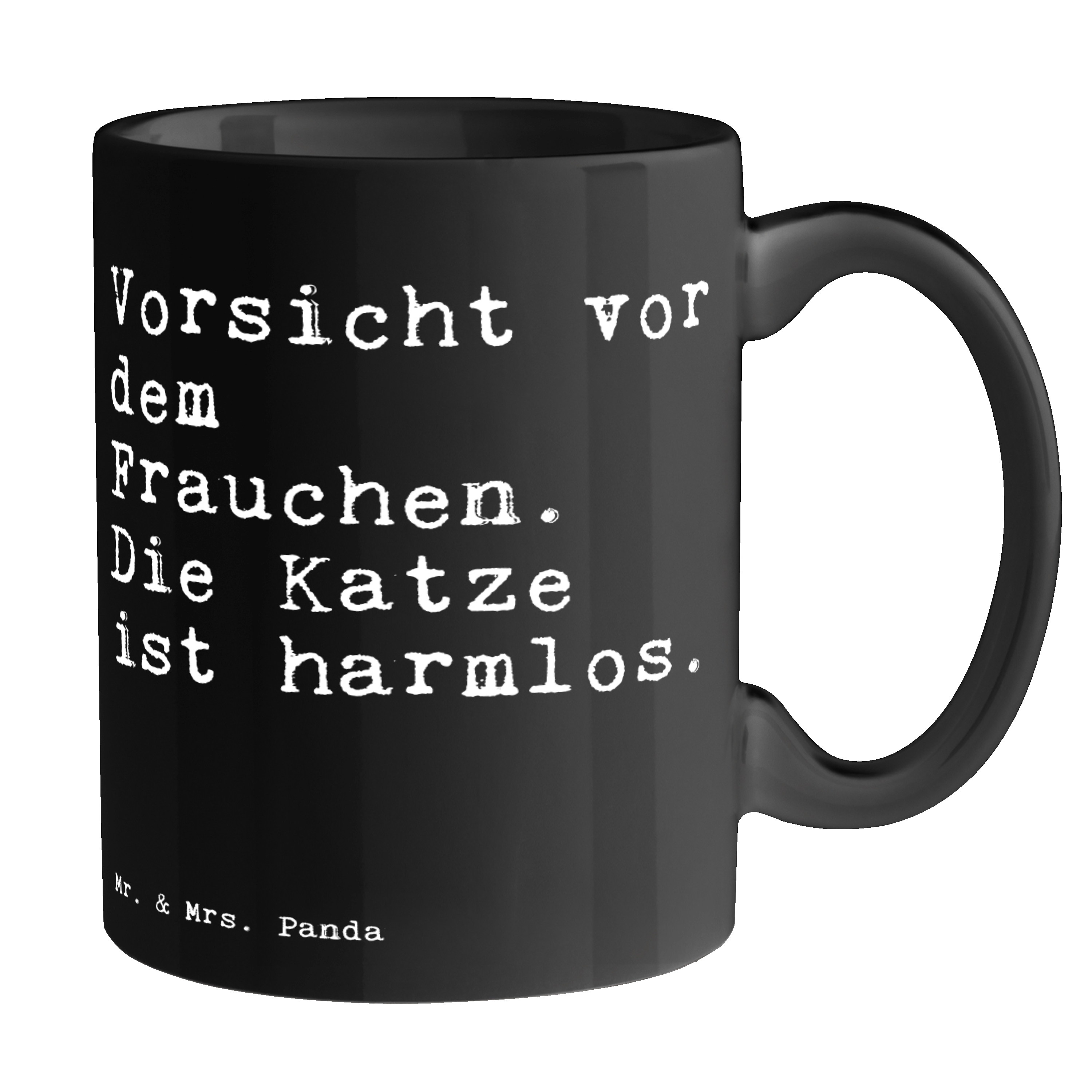 Tasse Sprüche und Zitate Vorsicht vor dem Frauchen. Die Katze ist harmlos.