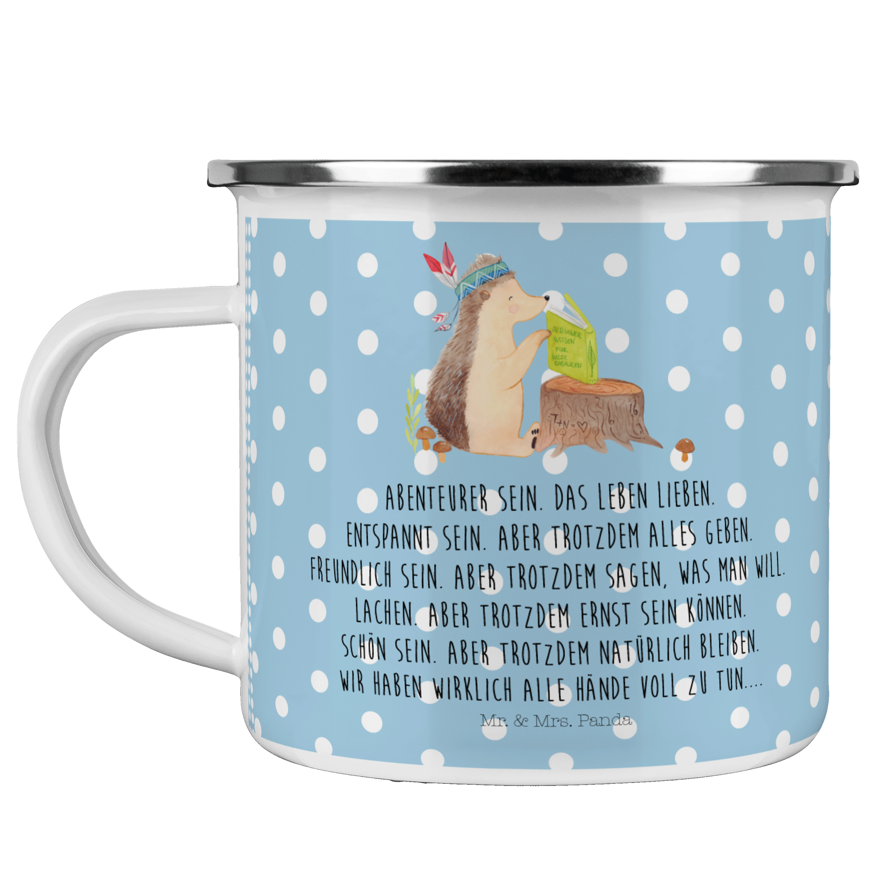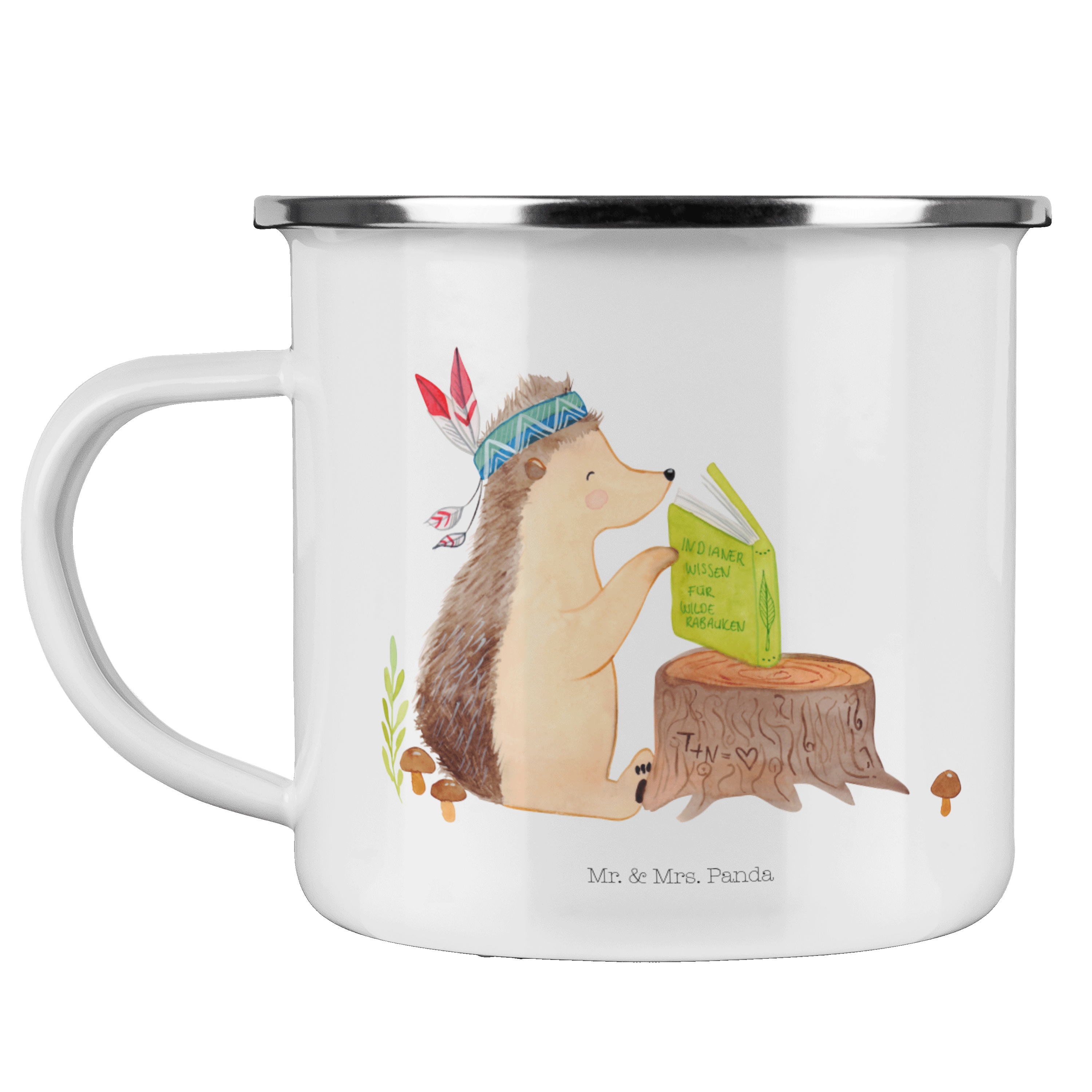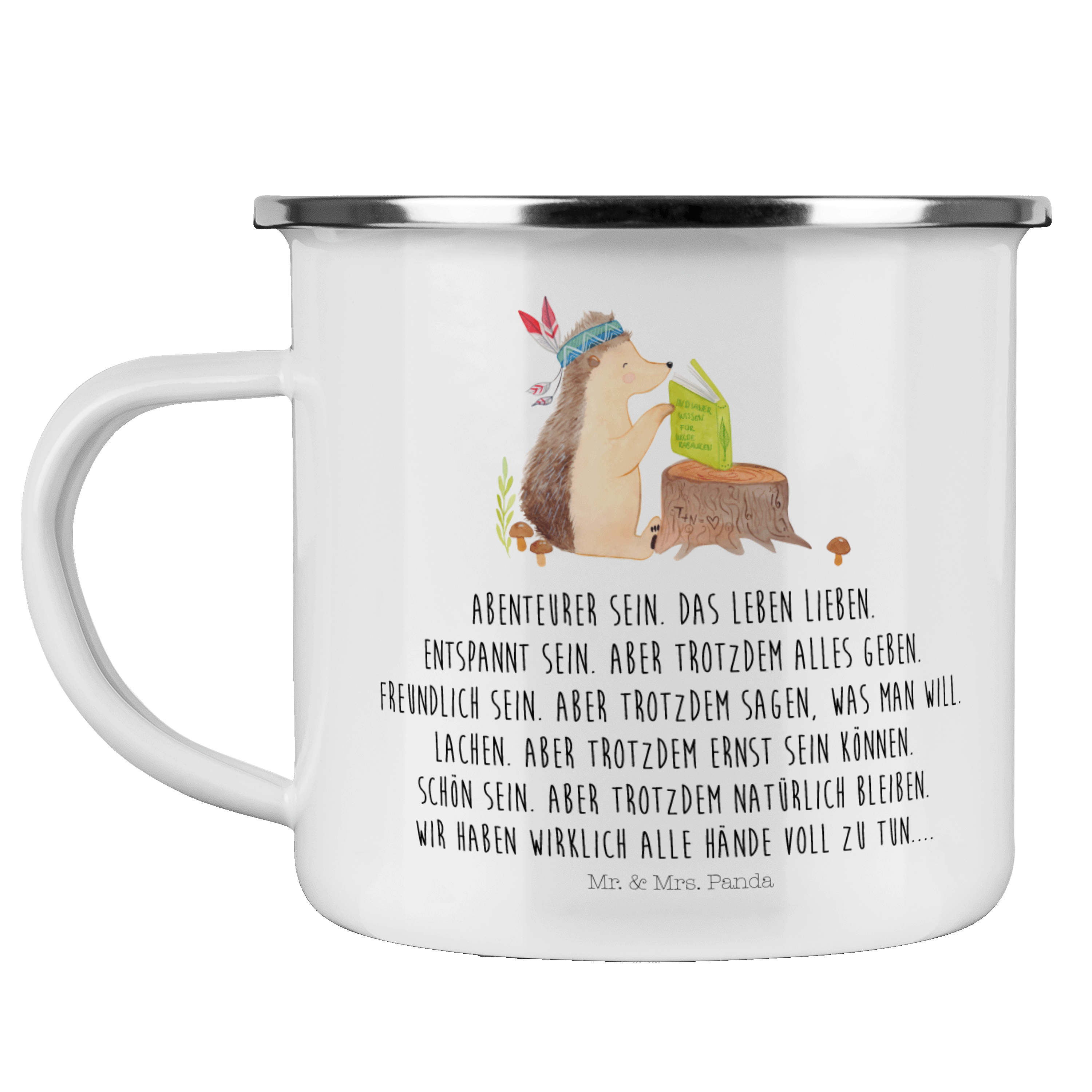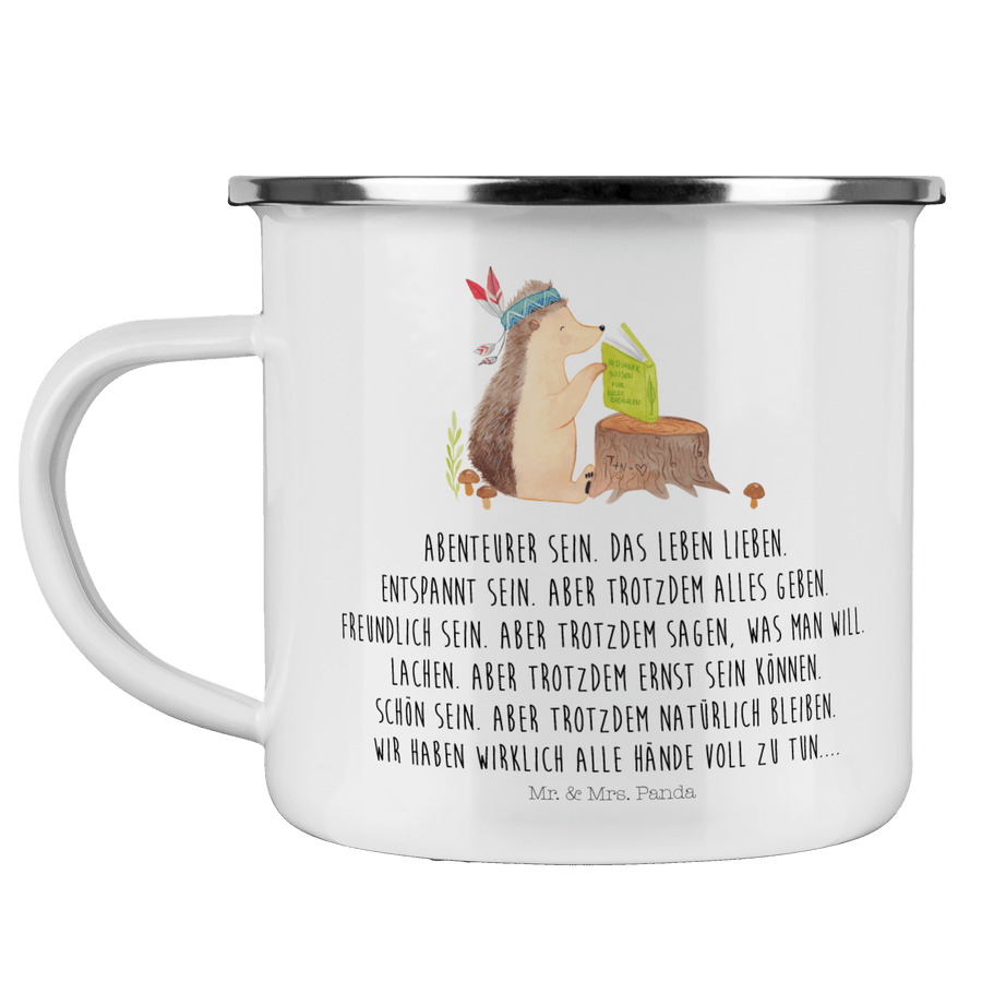 Camping Emaille Tasse Igel Indianer - mit Spruch - Weiß