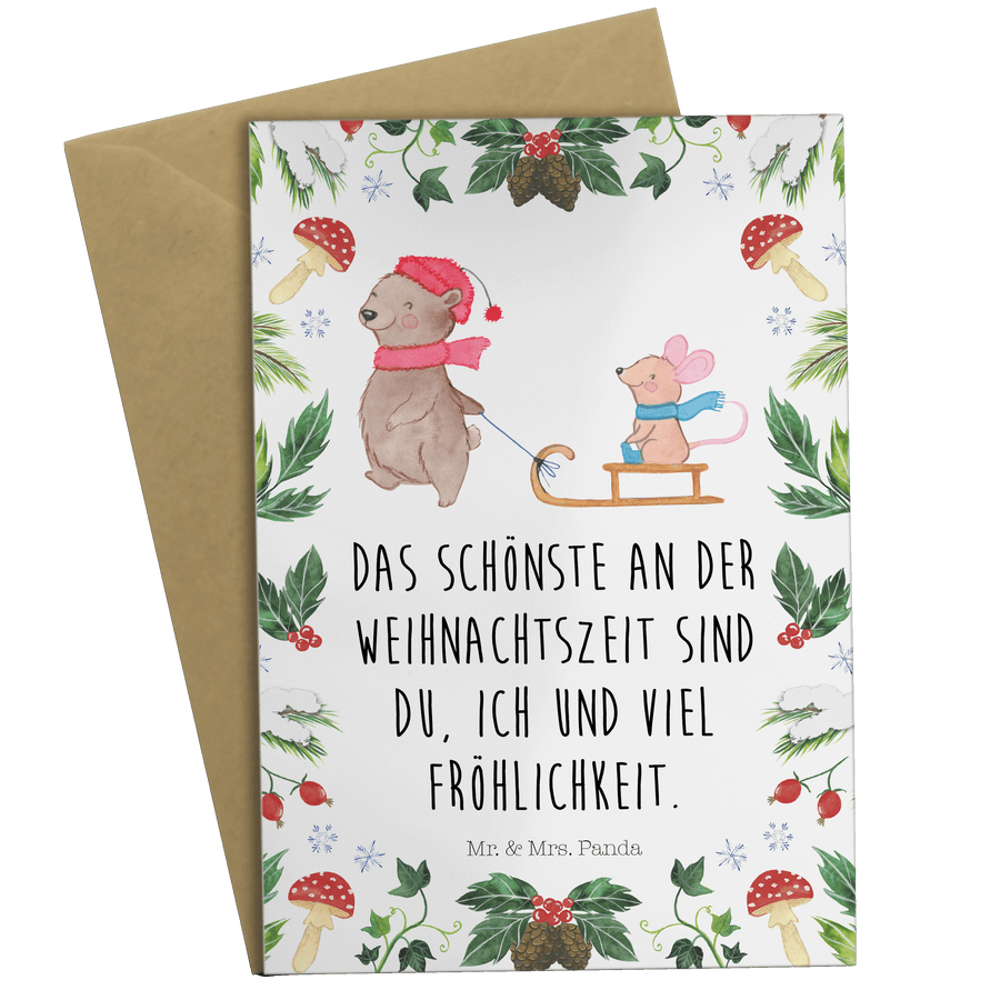 Grußkarte Bär Maus Schlitten - mit Spruch - Weiß