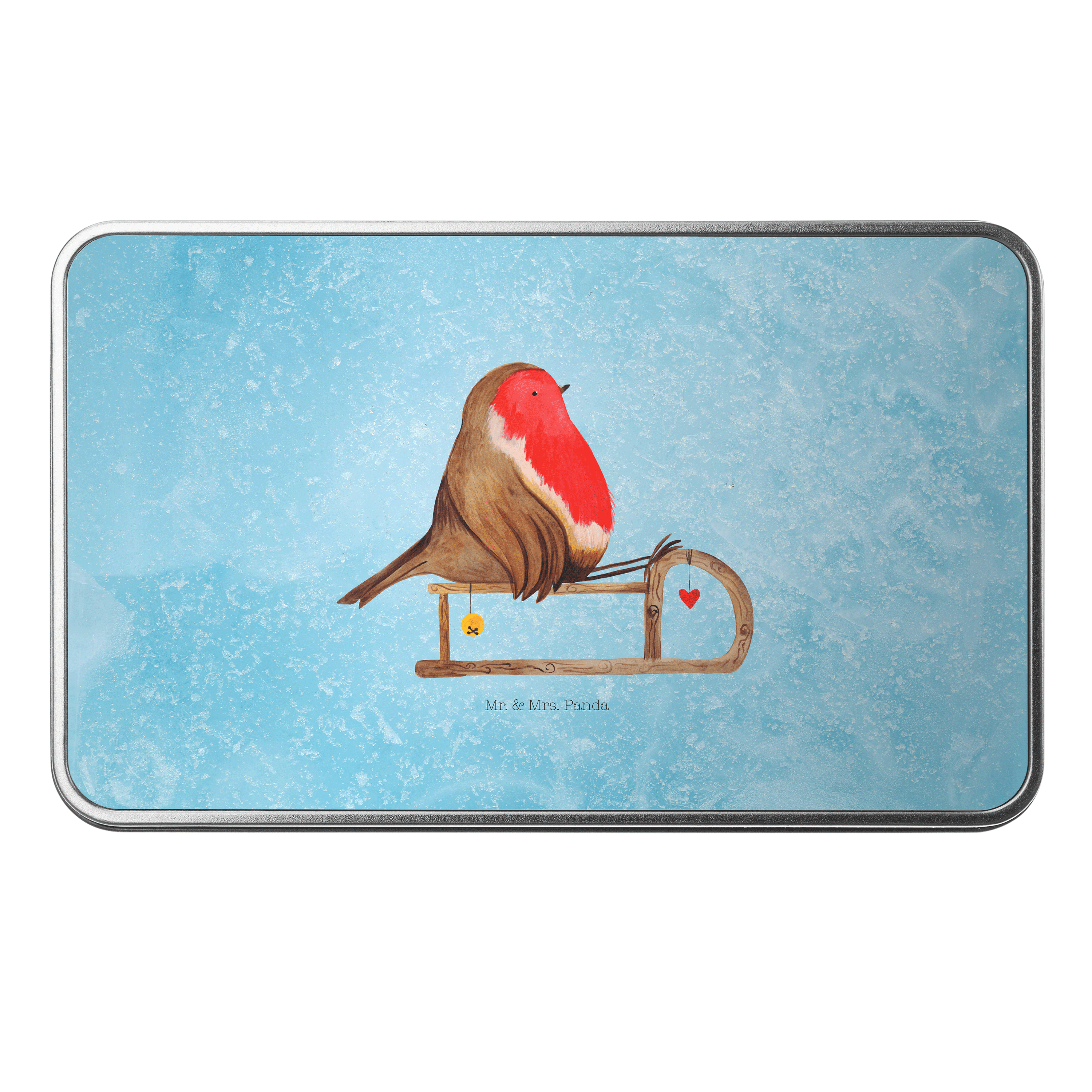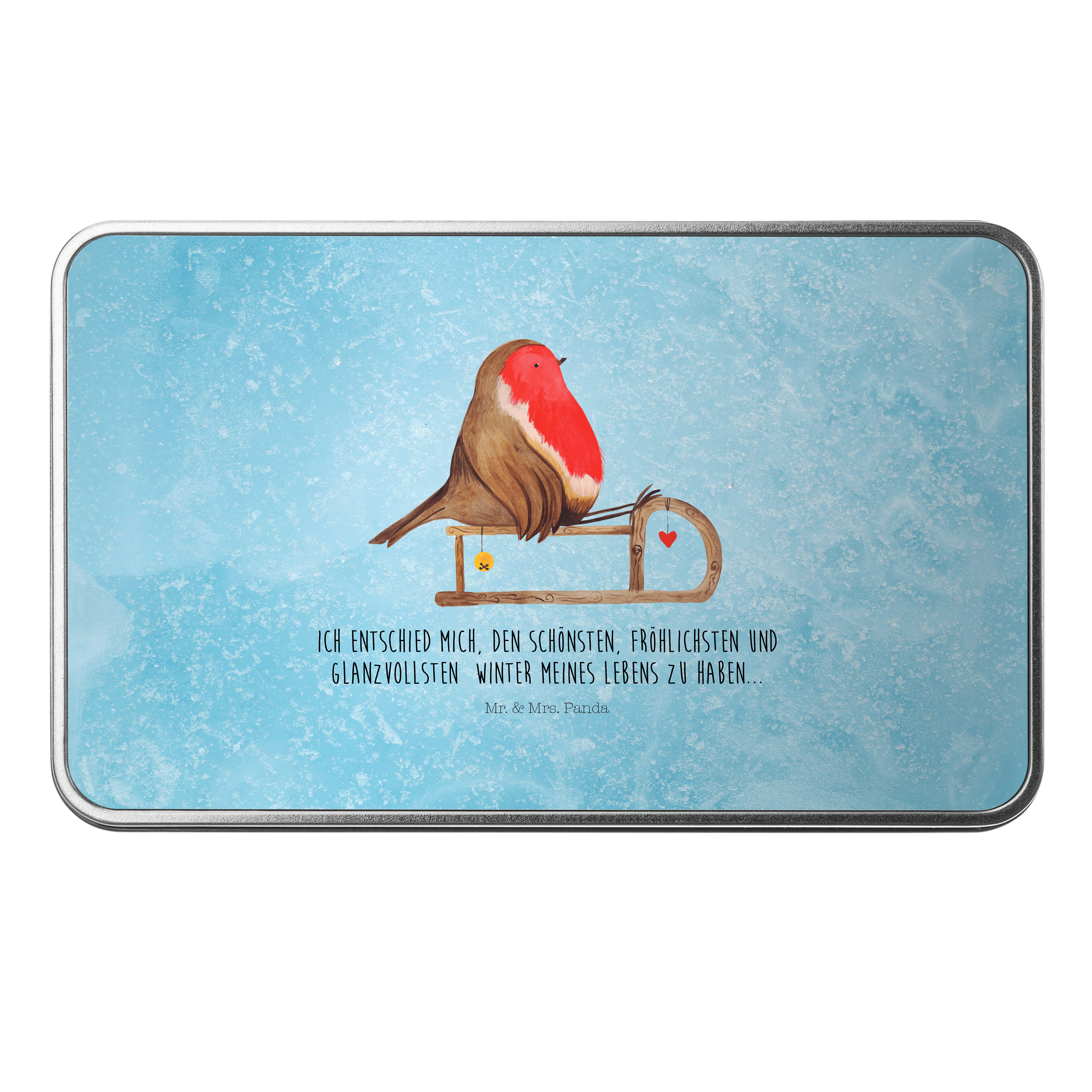 Metalldose rechteckig Rotkehlchen Schlitten - mit Spruch - Eisblau