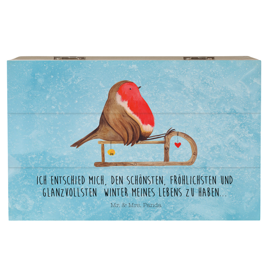 Holzkiste Rotkehlchen Schlitten - 19 x 12 cm - mit Spruch - Eisblau