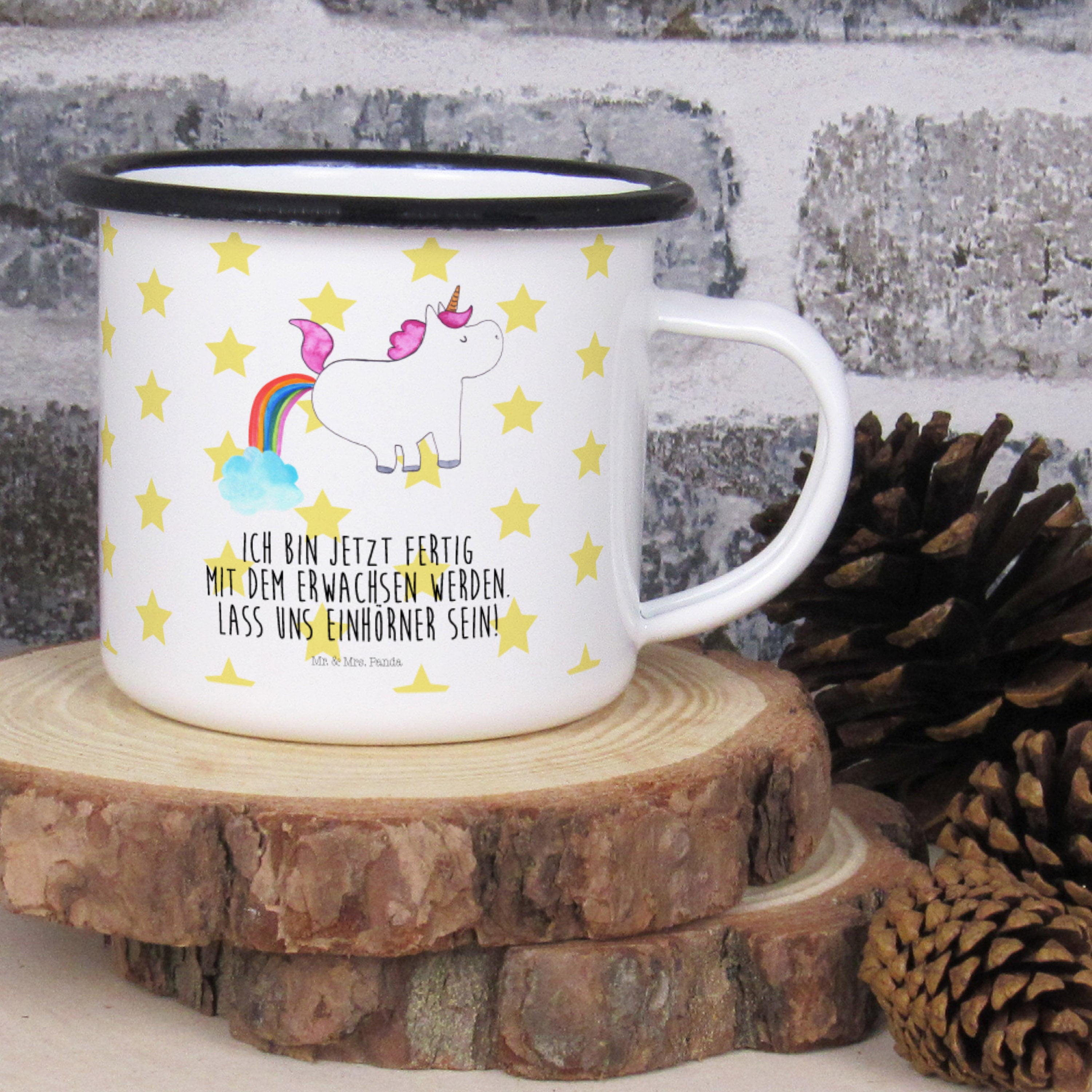 Diese wunderschöne XL Emaille Tasse von Mr. & Mrs. Panda ist wirklich etwas ganz besonders und hat ein extra großes Füllvolumen. Diese Motivtasse mit abgesetztem schwarzem Emaille Rand ist ein bruchsicherer Begleiter für dein nächstes Abenteuer. Das Füllvolumen des Bechers beträgt 480 ml und ist ideal beim Camping als Campingbecher einsetzbar.