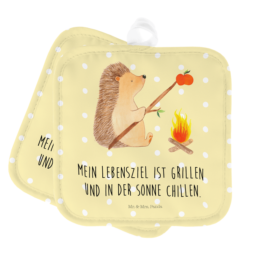 2er Set Topflappen Igel grillt - mit Spruch - Gelb Pastell