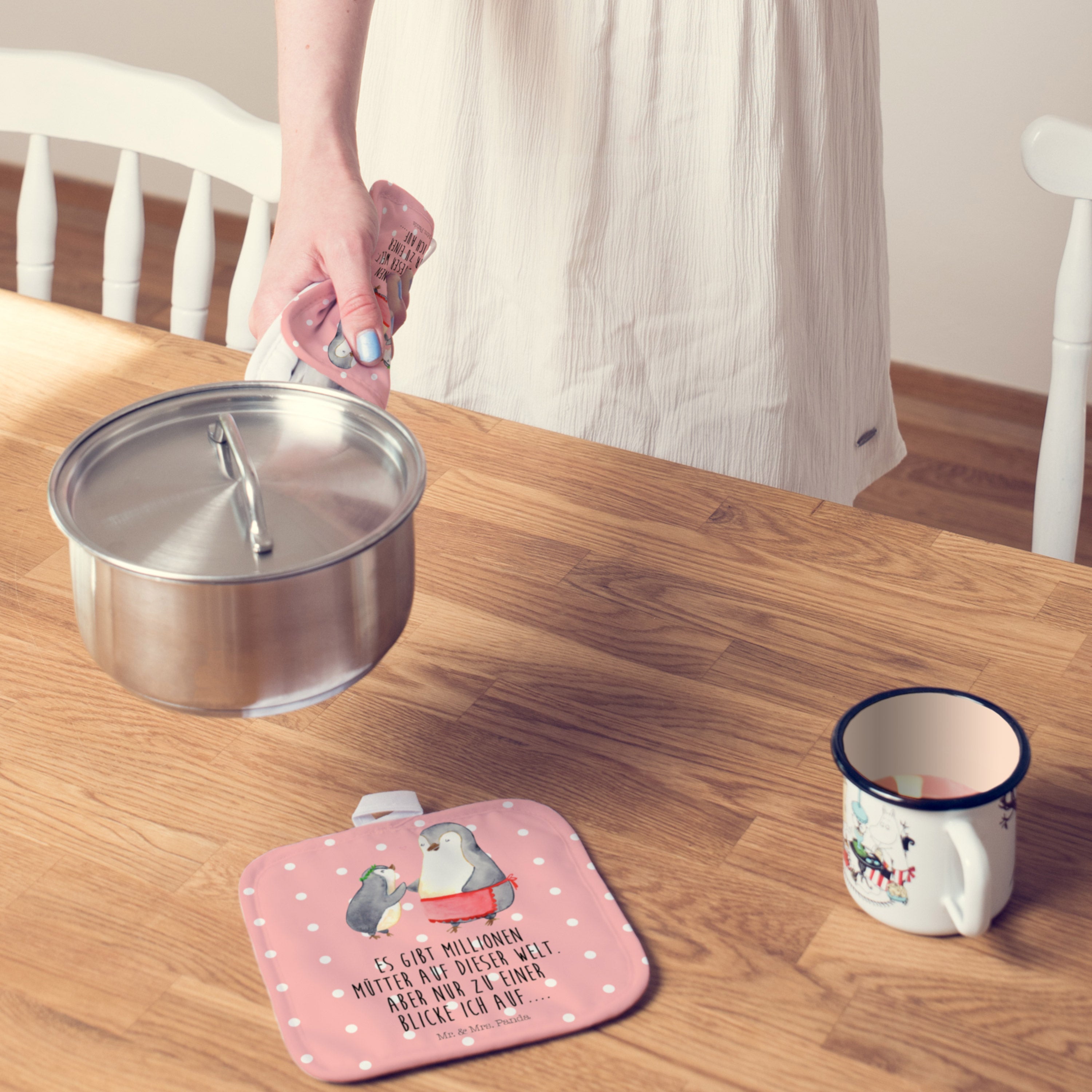 Diese wunderschönen Topflappen von Mr. & Mrs. Panda kommen im 2er Set. Sie wurden liebevoll von uns per Hand bedruckt und das Material ist äußerst strapazierfähig und langlebig. Die Mischung aus Baumwolle und Kunstfaser ist optimal für deine Topflappen, weil die Baumwolle gut isoliert und die Kunstfaser besonder dünn ist, sodass sie sehr hitzebeständig ist. Die Topflappen haben jeweils eine Schlaufe mit der du sie gut aufhängen kannst. So hast du die perfekte Dekoration in deiner Küche!
