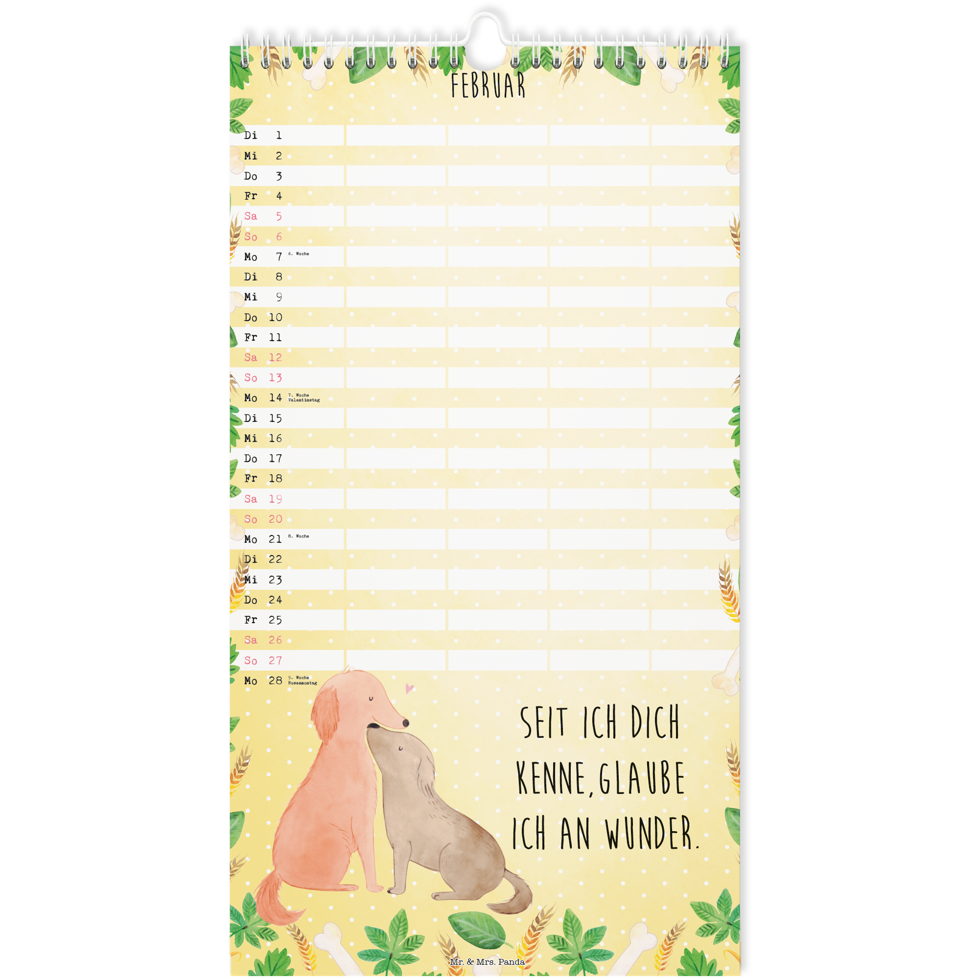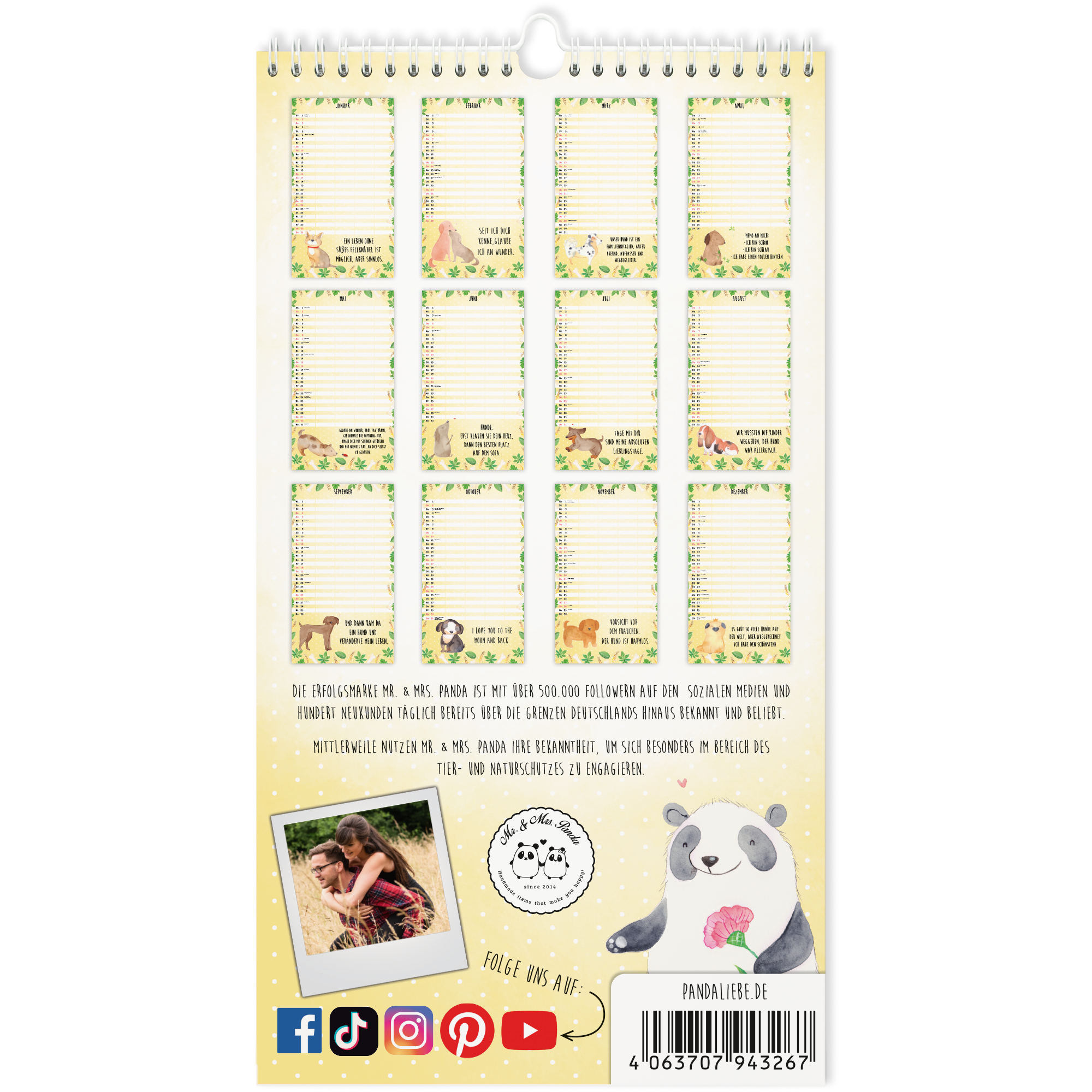 Dieser wunderschöne Familienkalender von Mr. & Mrs. Panda ist mit unseren schönsten Motiven versehen. Wir begleiten dich und deine Familie Monat für Monat durch das Jahr und zaubern dir immer wieder ein Lächeln in's Gesicht. Der Wandkalender ist mit einem Papprücken verstärkt und vorderseitig mit einer Klarsichtfolie bedeckt. Dadurch ist er sehr edel und hochwertig und ist perfekt als Geschenk geeignet.