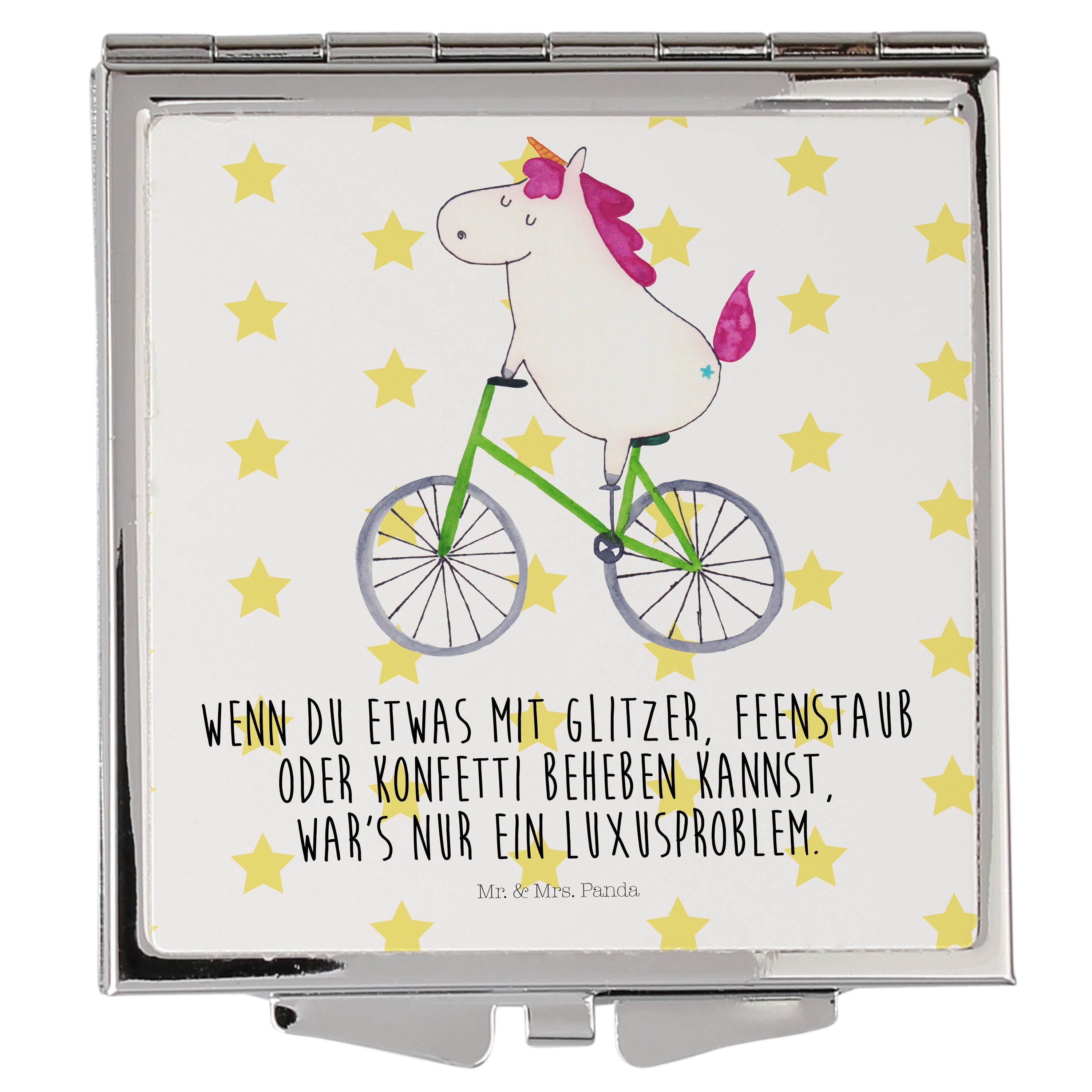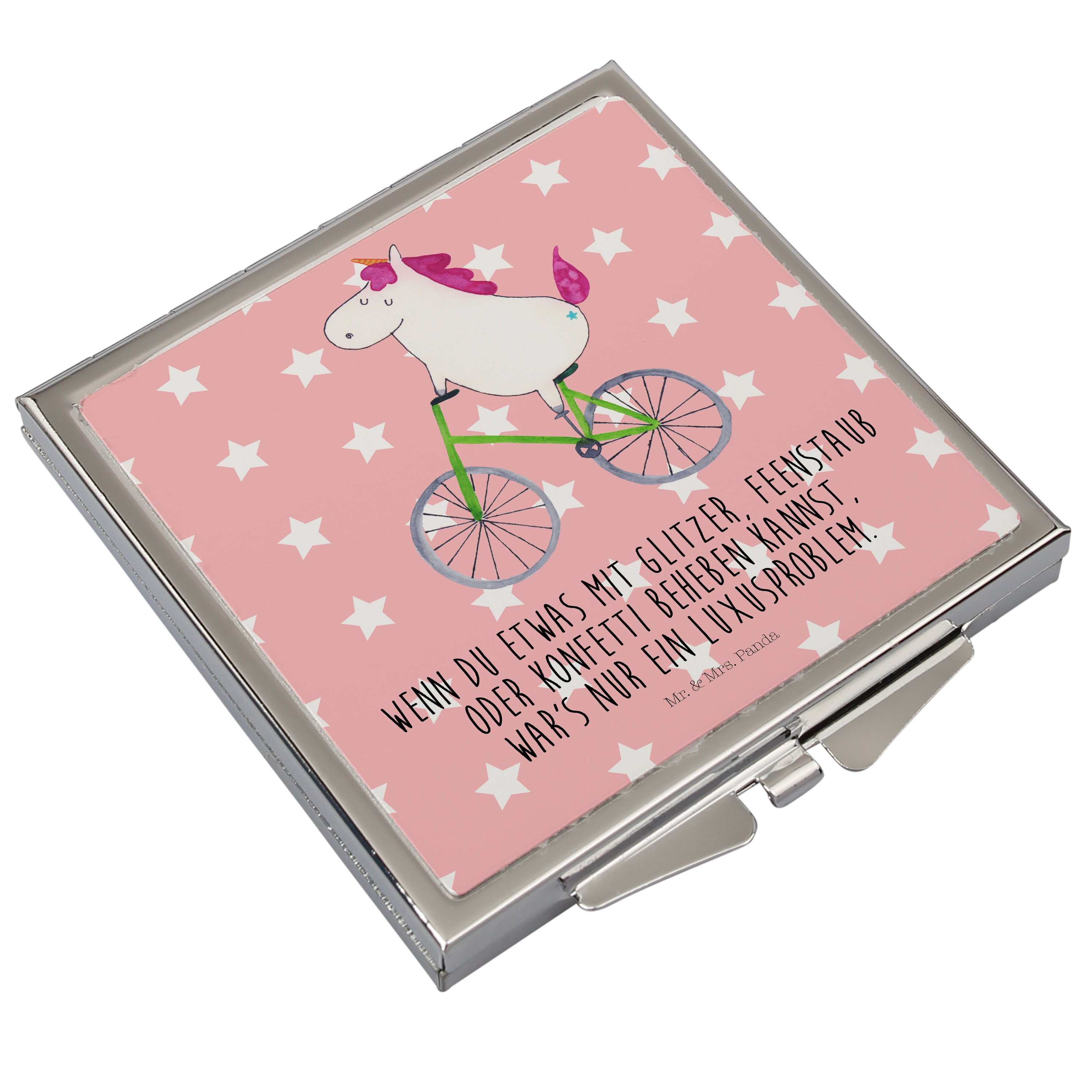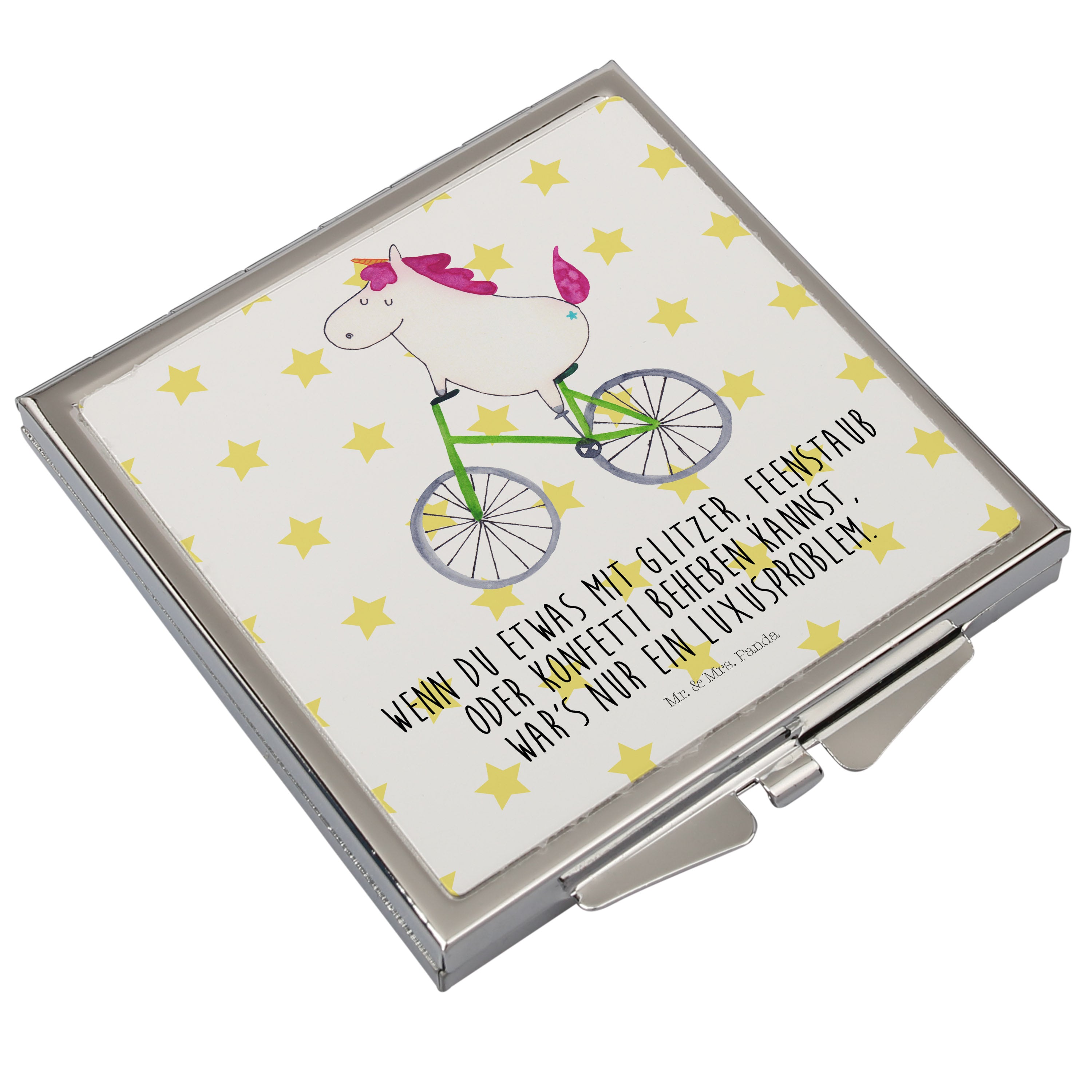 Handtaschenspiegel quadratisch Einhorn Radfahrer Spiegel, Handtasche, Quadrat, silber, schminken, Schminkspiegel, Einhorn, Einhörner, Einhorn Deko, Pegasus, Unicorn, Radfahren, Radfahrer, Rad, Bike, Feenstaub, Konfetti, Luxusproblem, Kummer, Liebeskummer