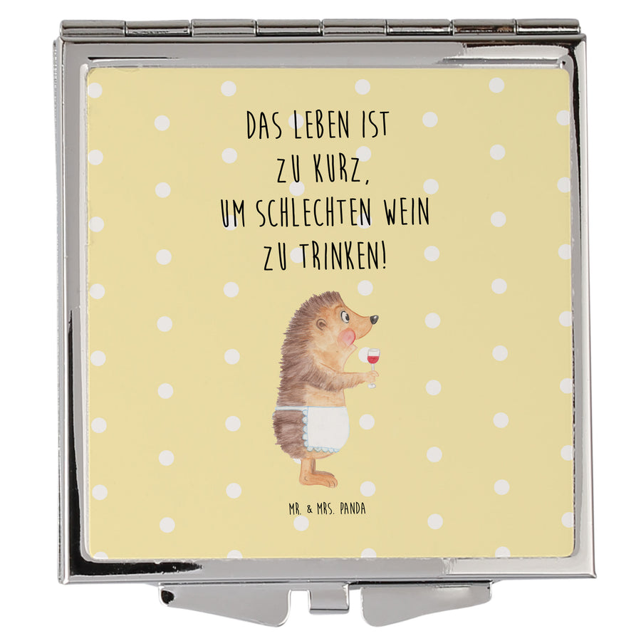 Handtaschenspiegel quadratisch Igel mit Wein - mit Spruch - Gelb Pastell