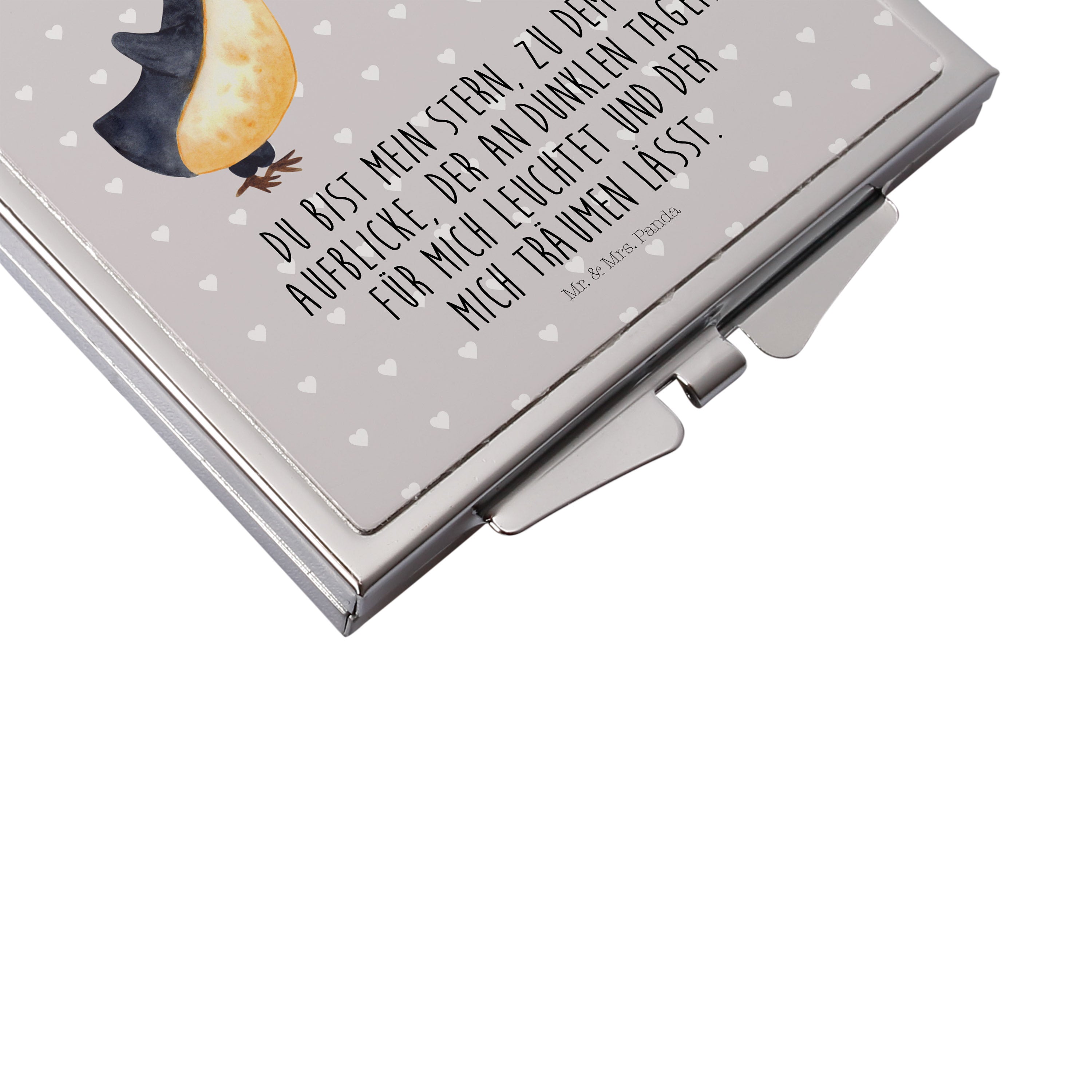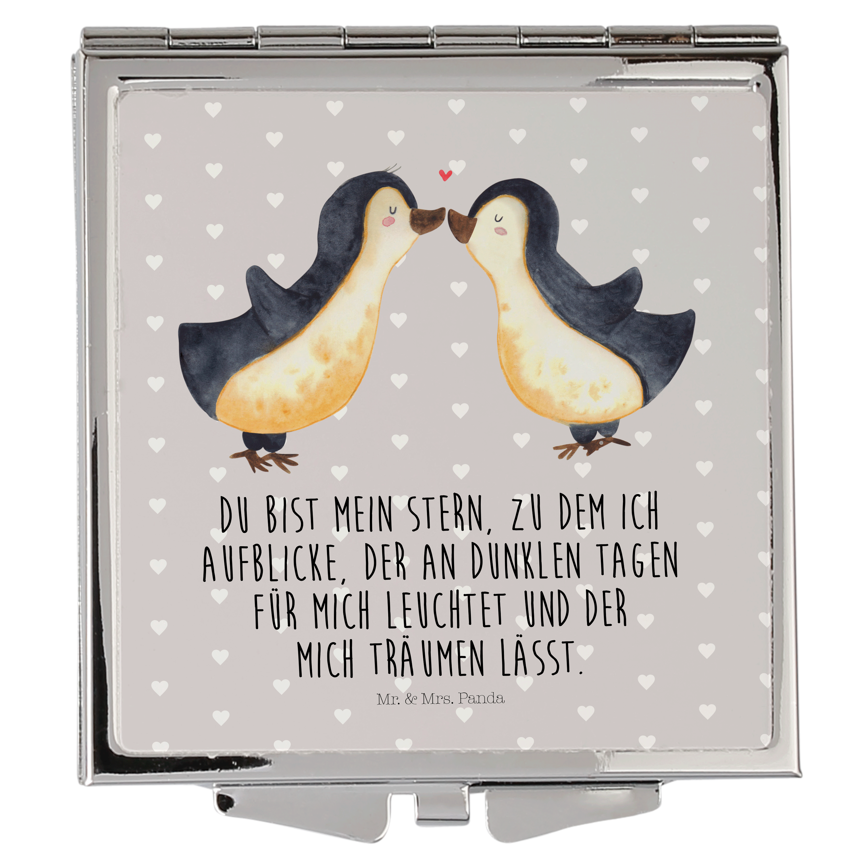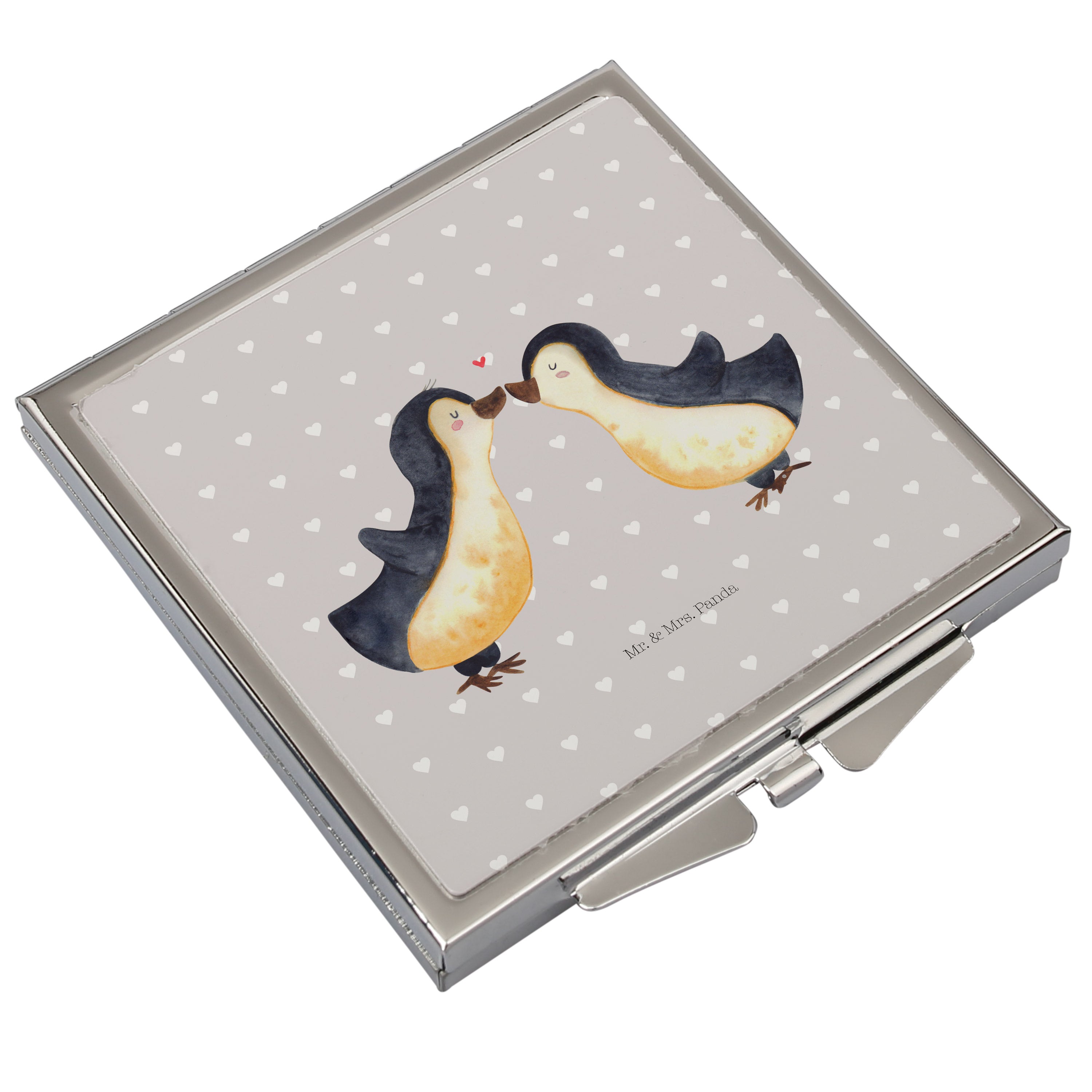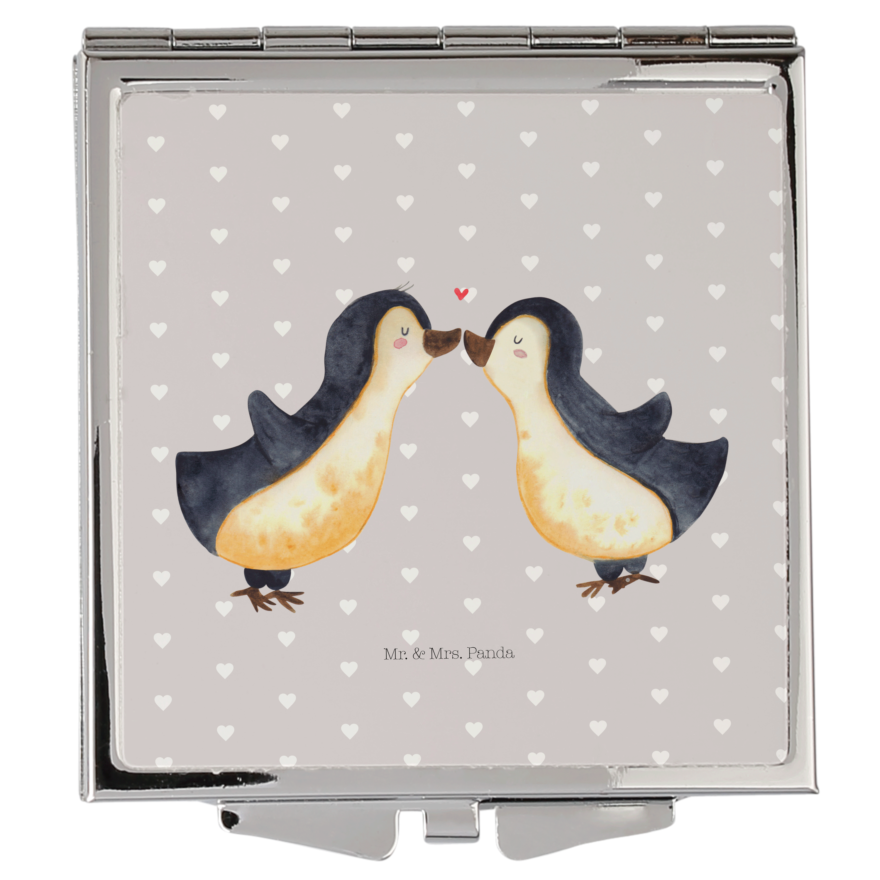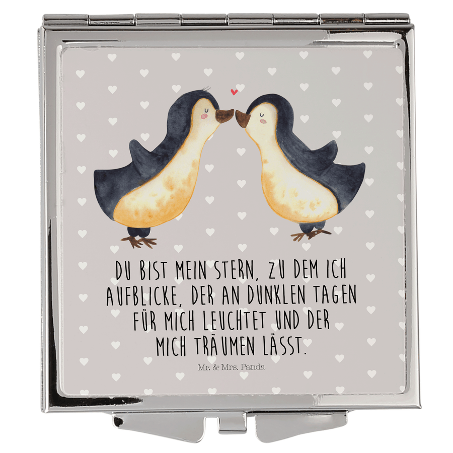 Handtaschenspiegel quadratisch Pinguin Liebe - mit Spruch - Grau Pastell