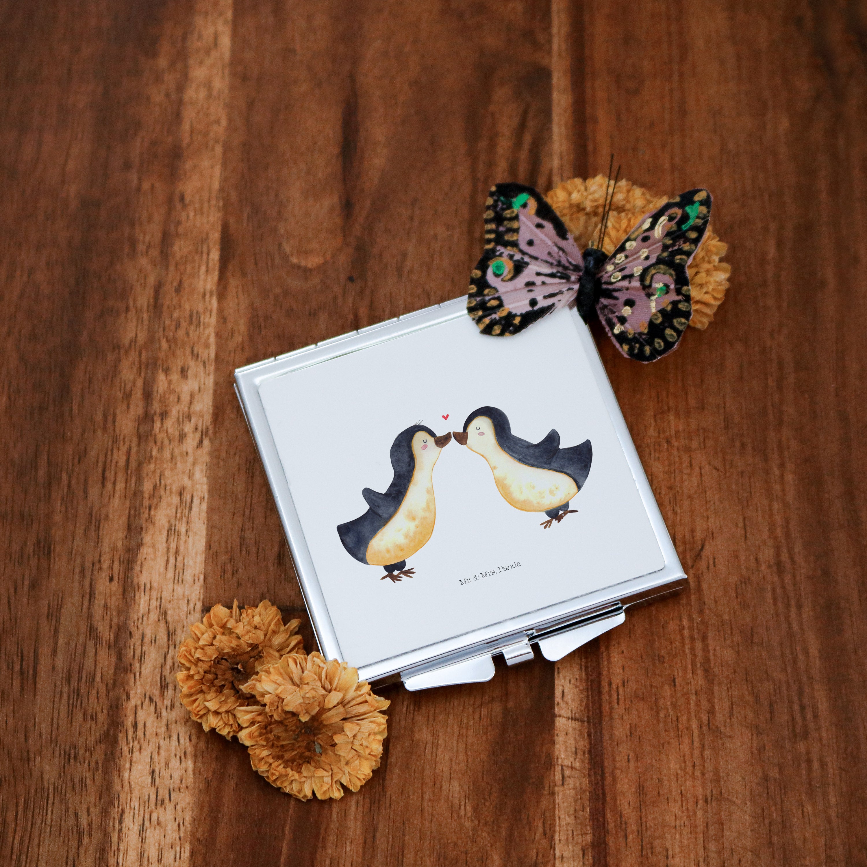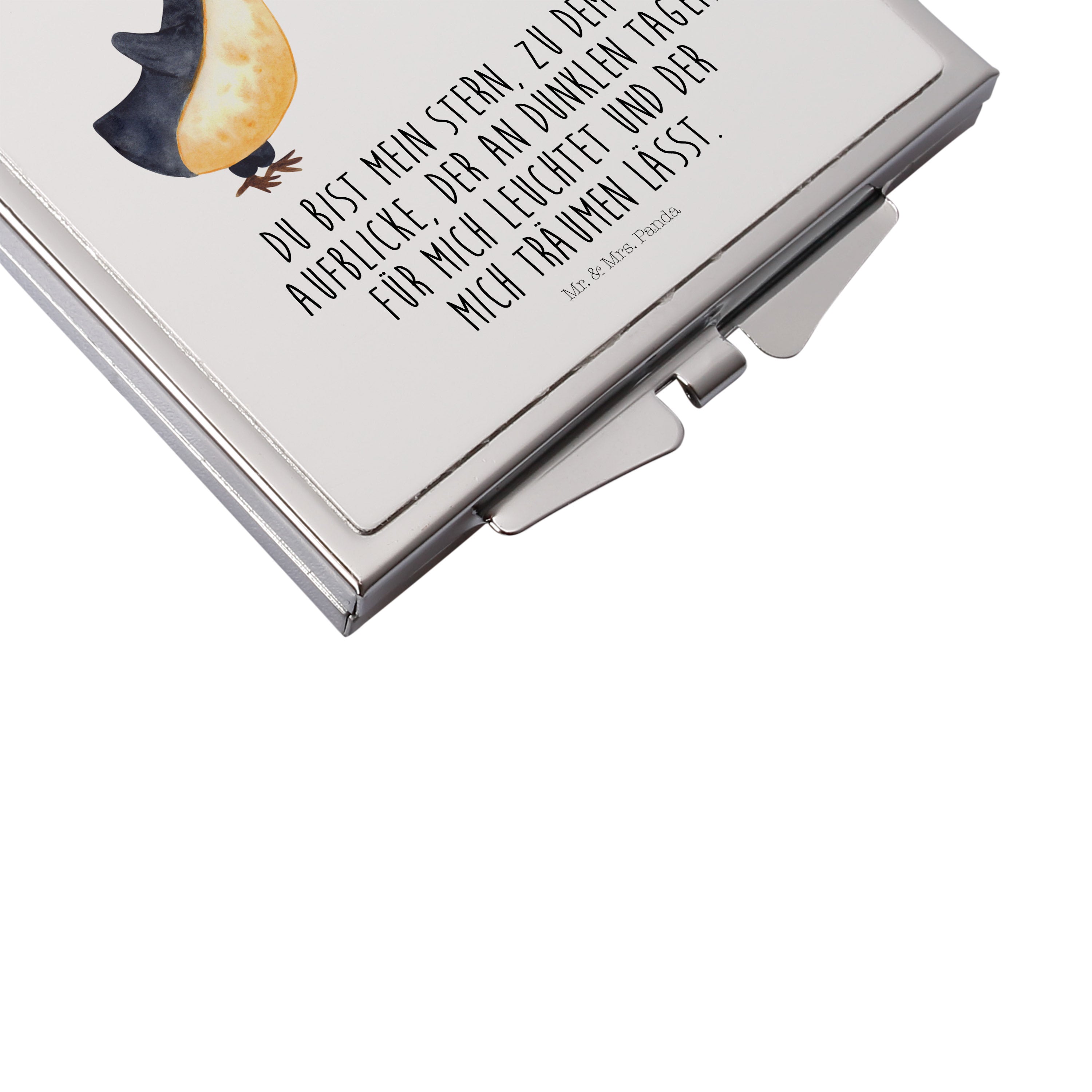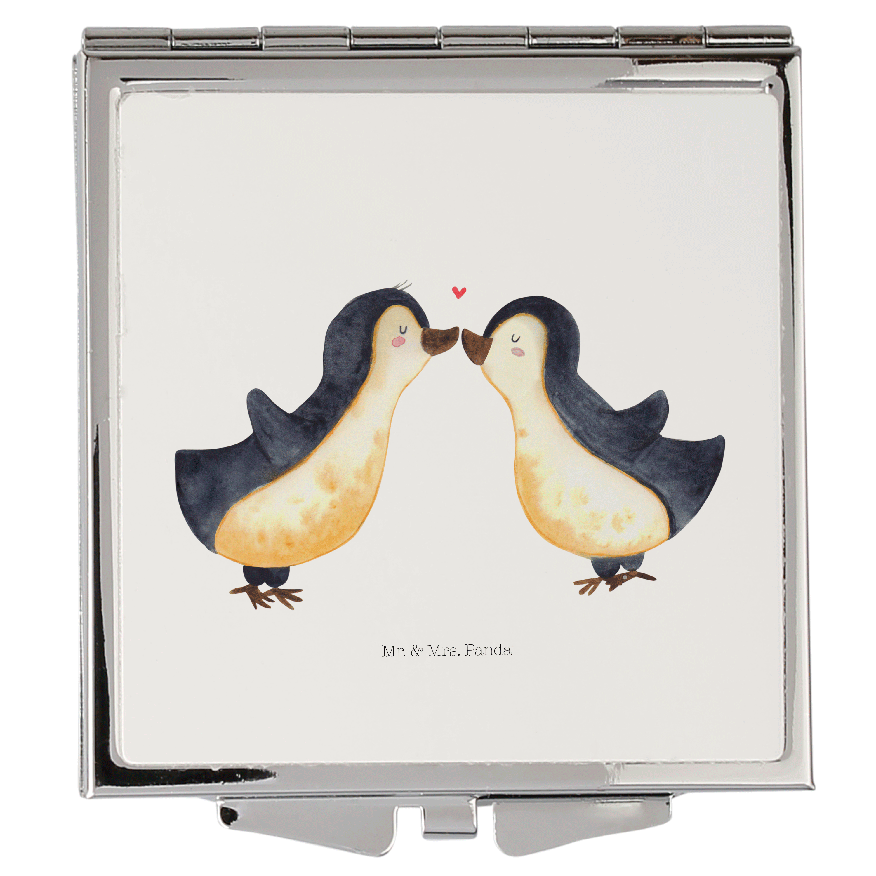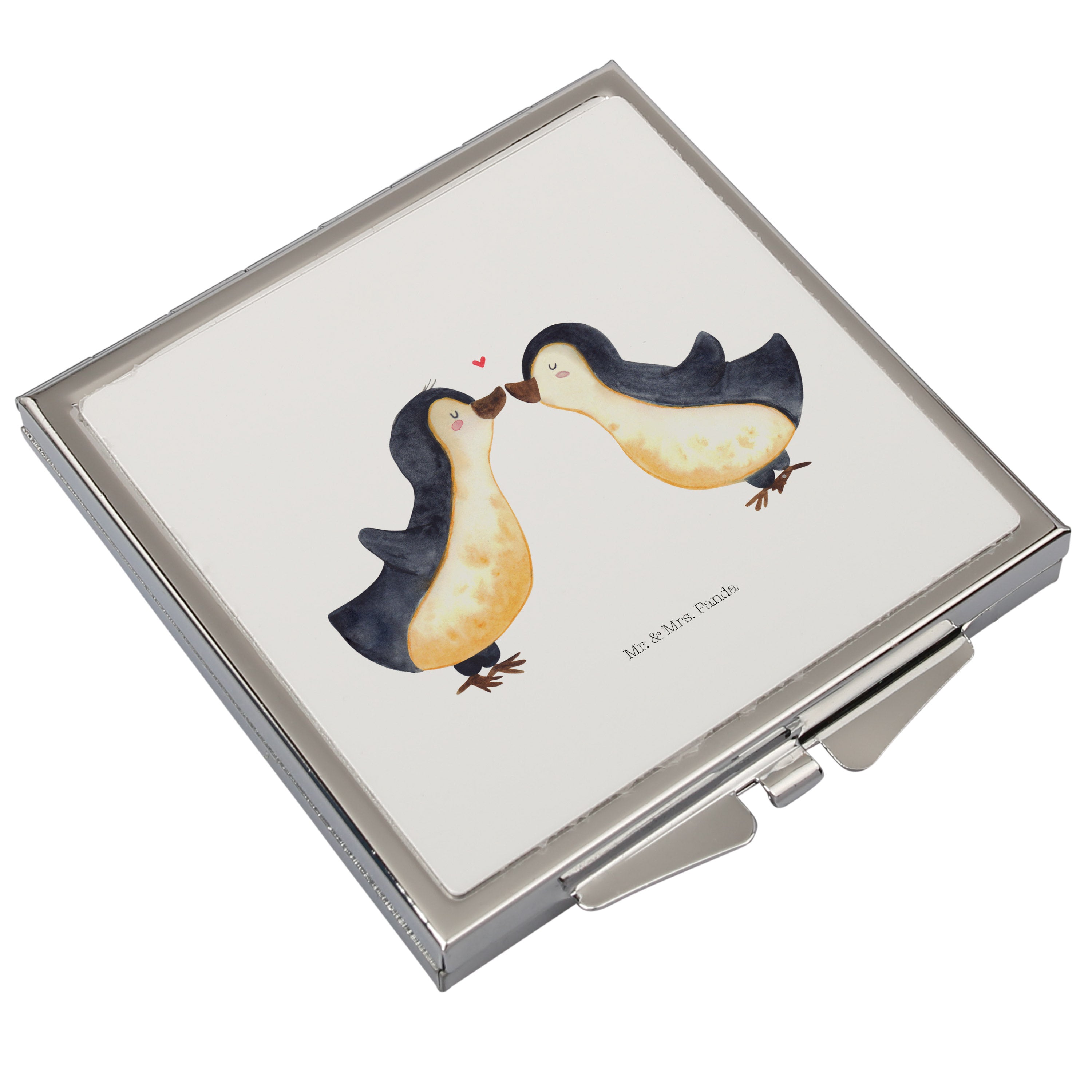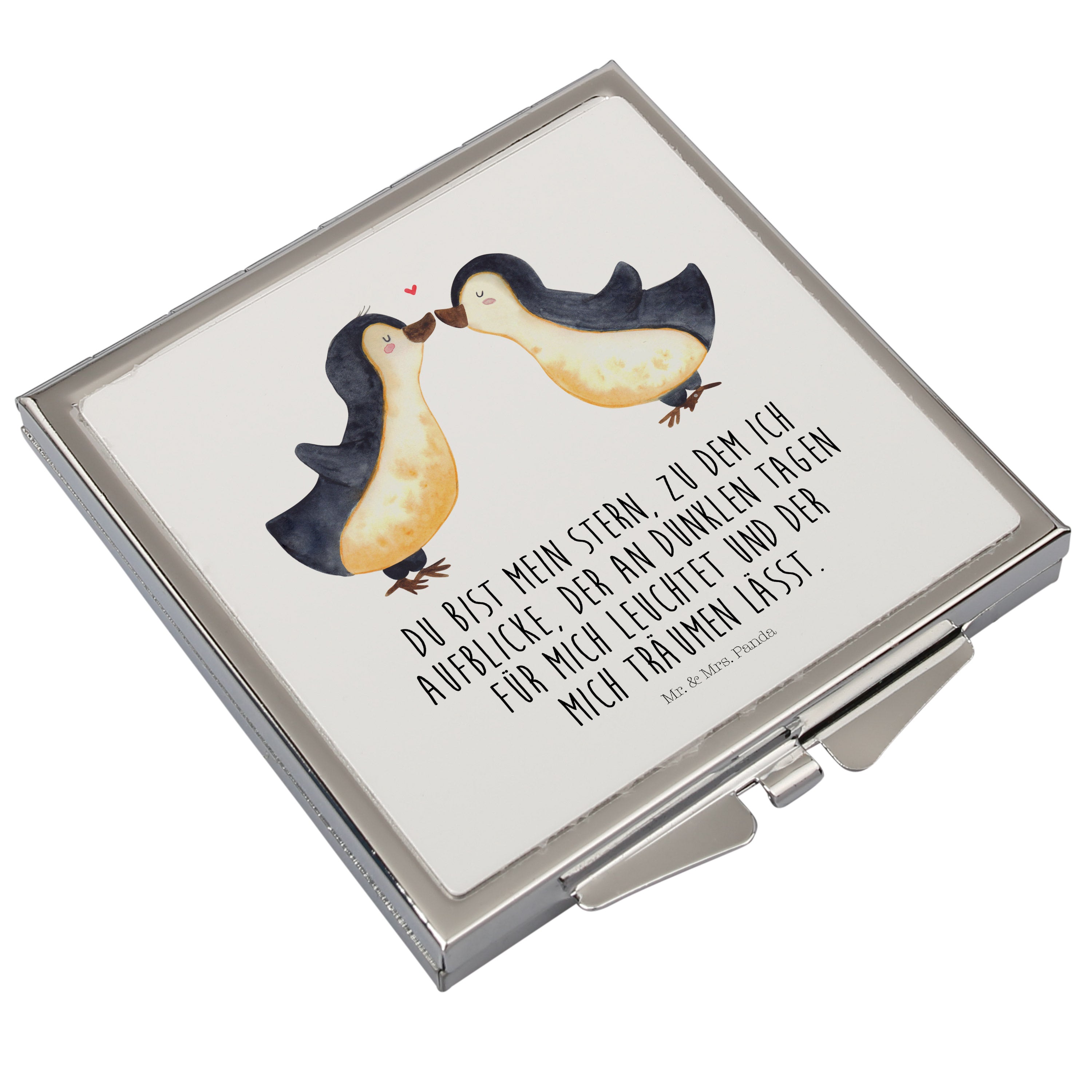Handtaschenspiegel quadratisch Pinguin Liebe - mit Spruch - Grau Pastell