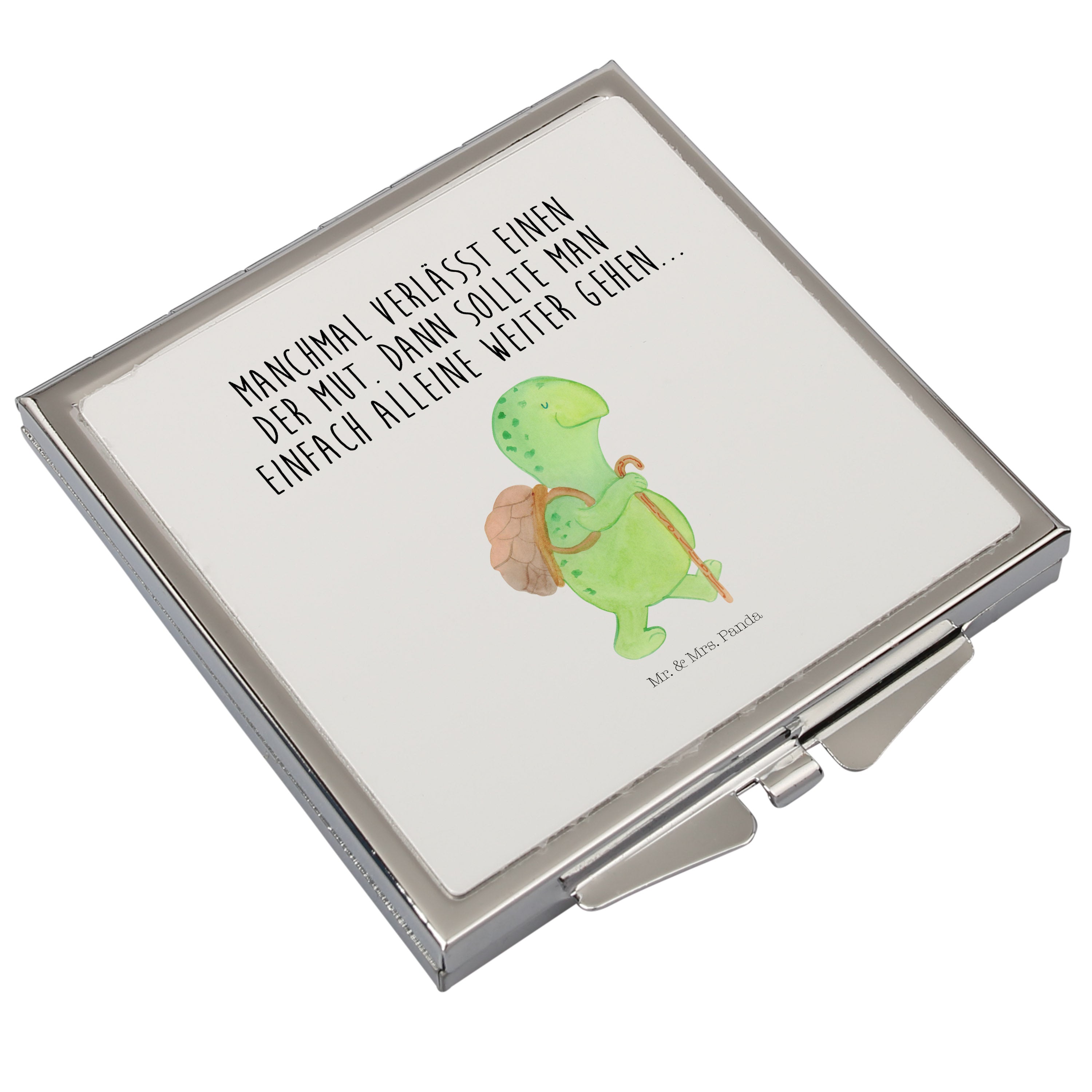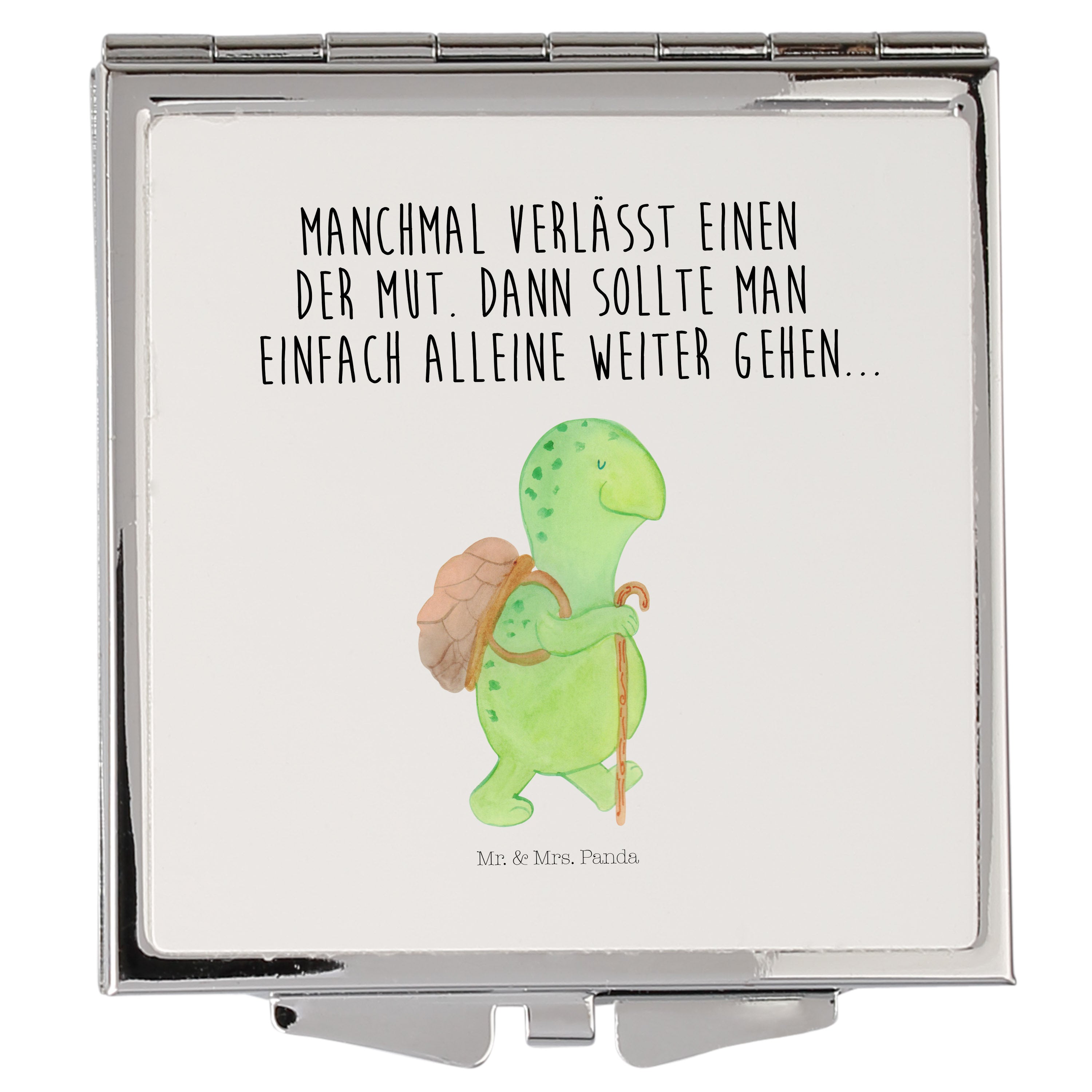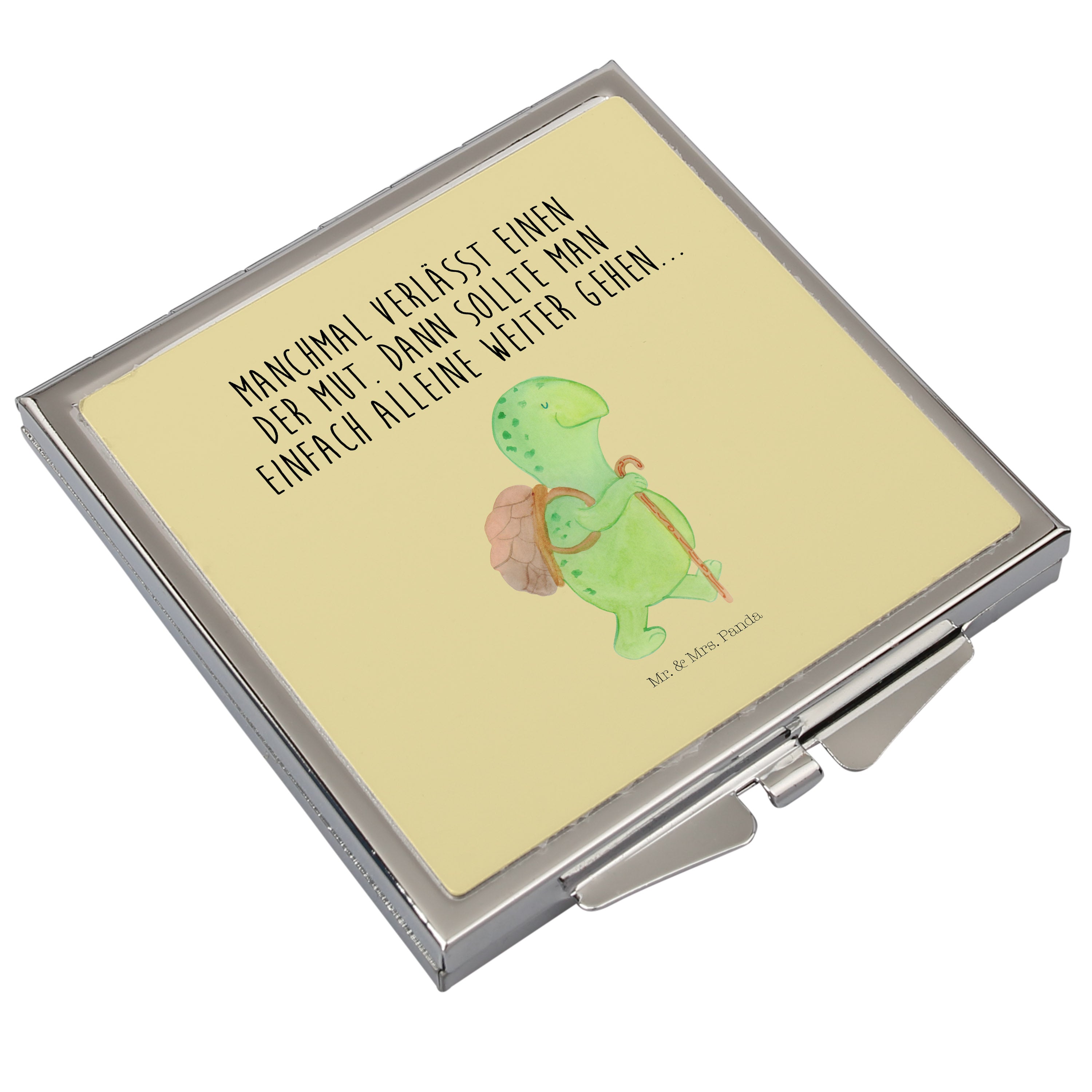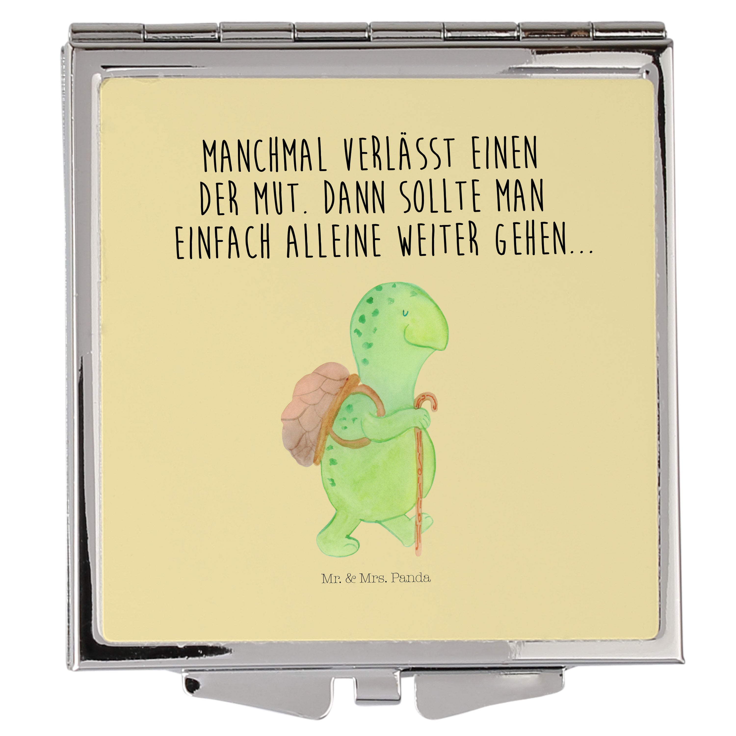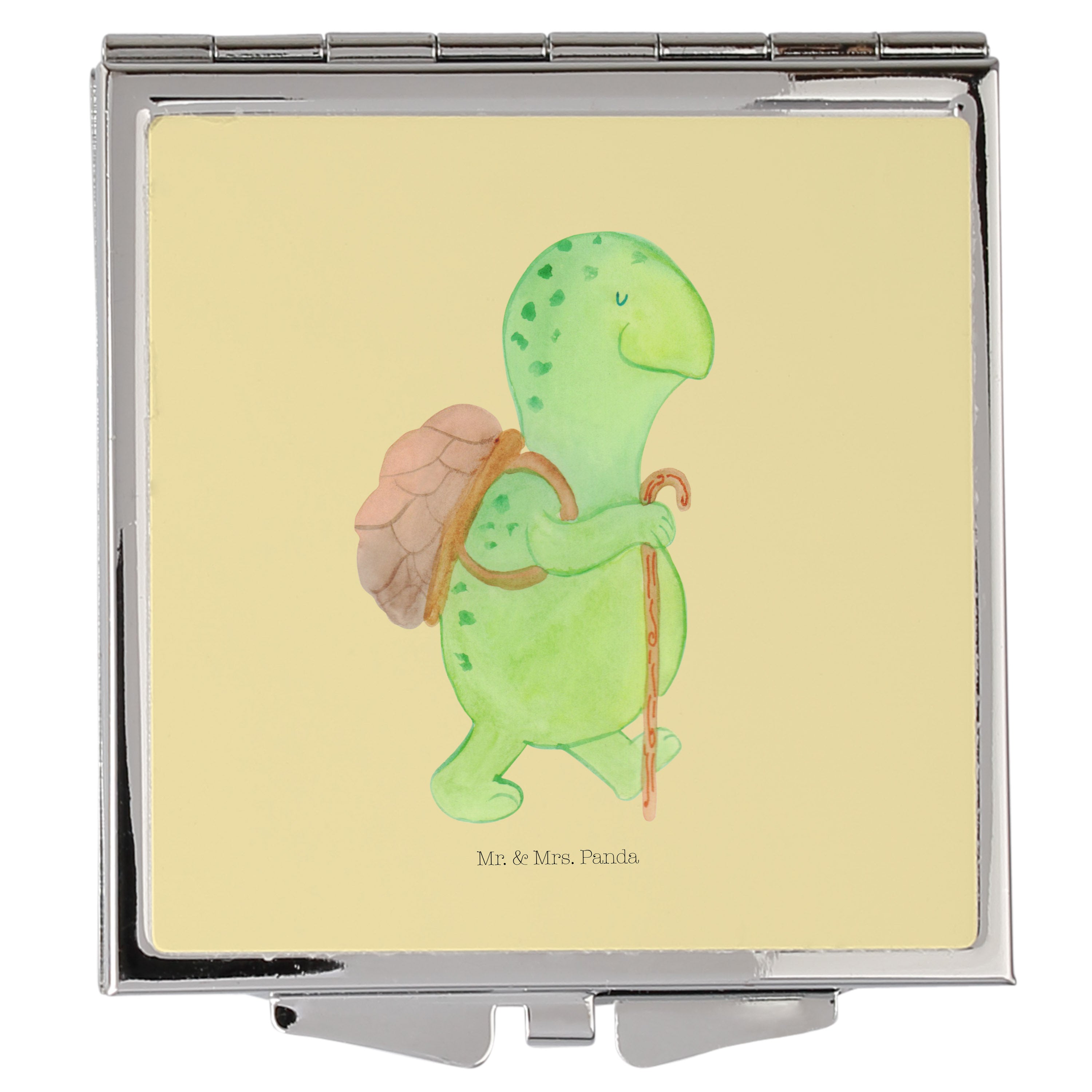 Handtaschenspiegel quadratisch Schildkröte Wanderer - mit Spruch - Gelb Pastell