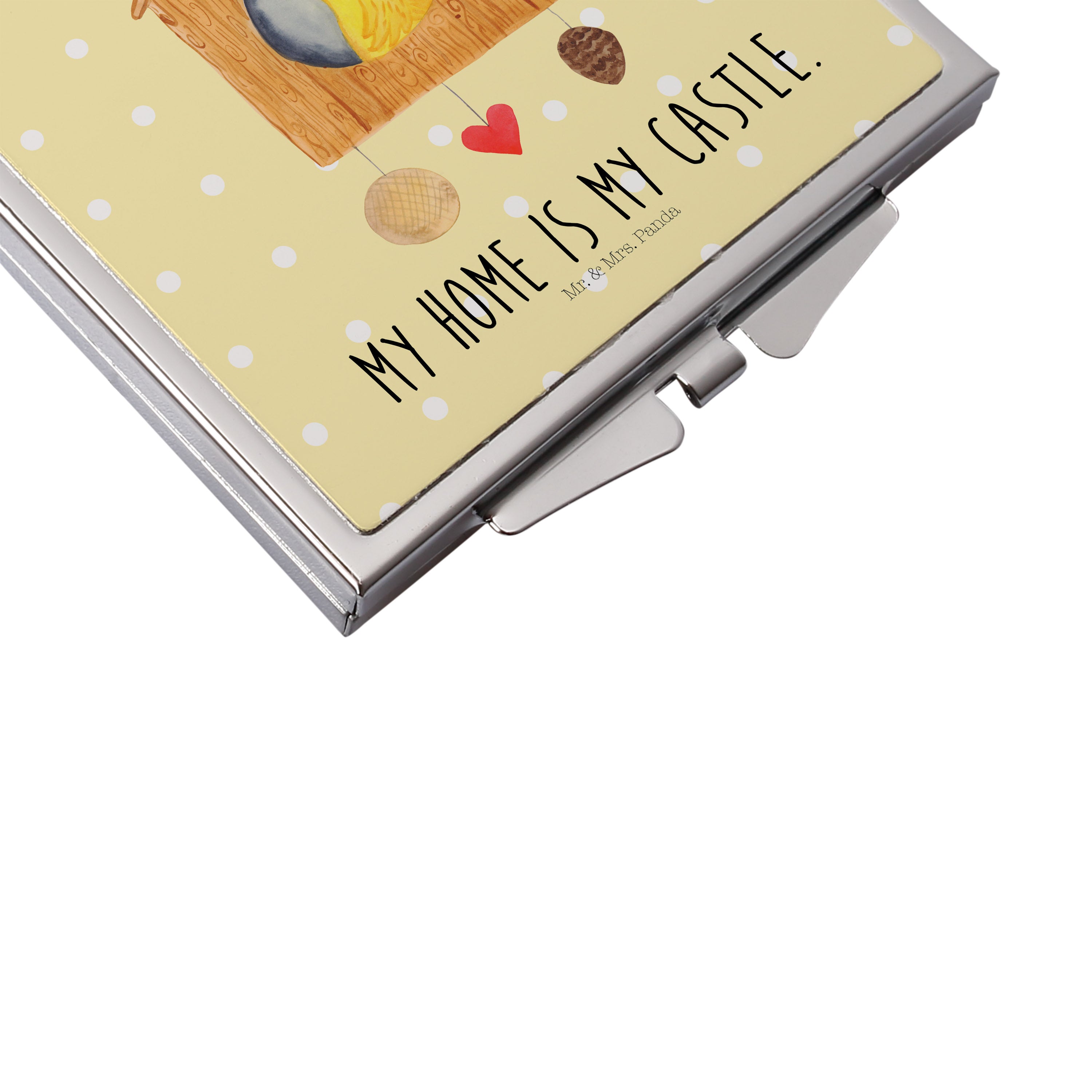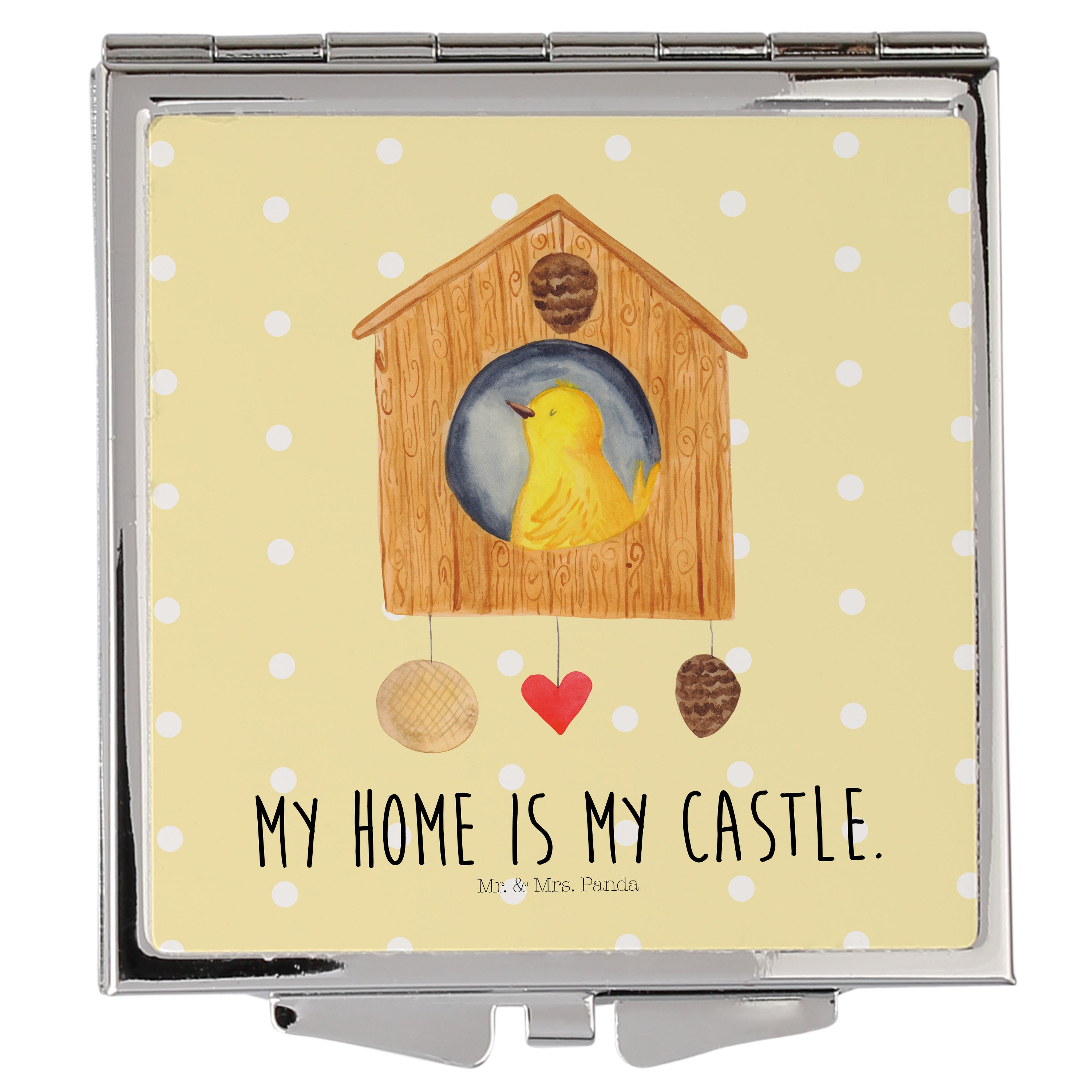 Handtaschenspiegel quadratisch Vogelhaus - mit Spruch - Gelb Pastell