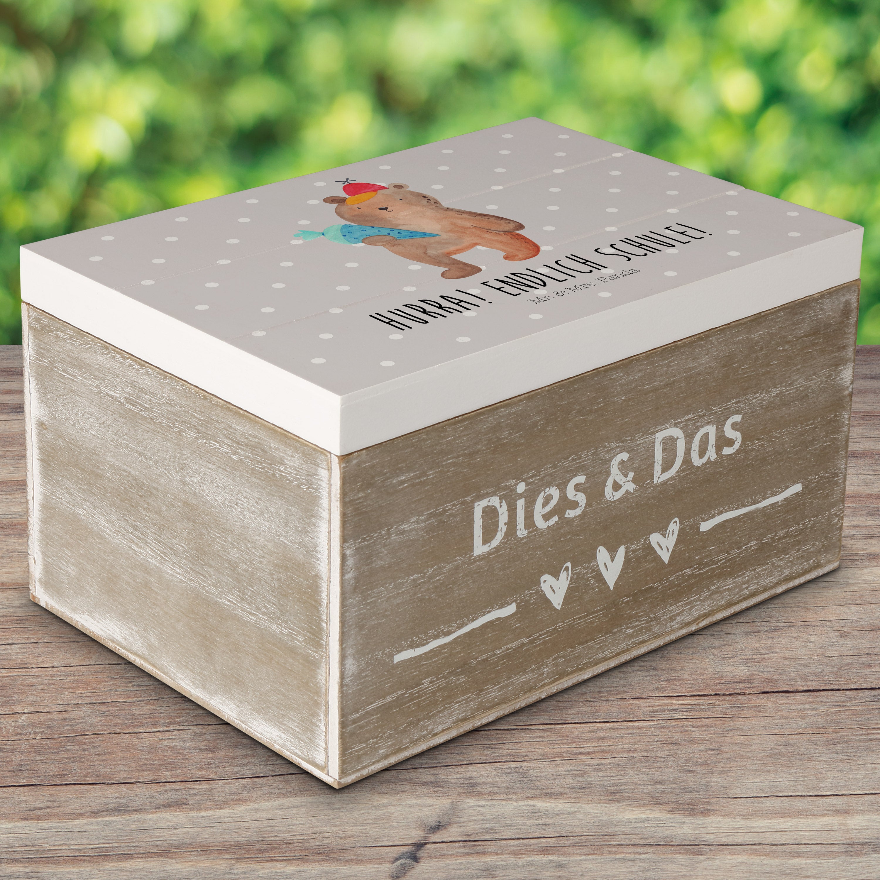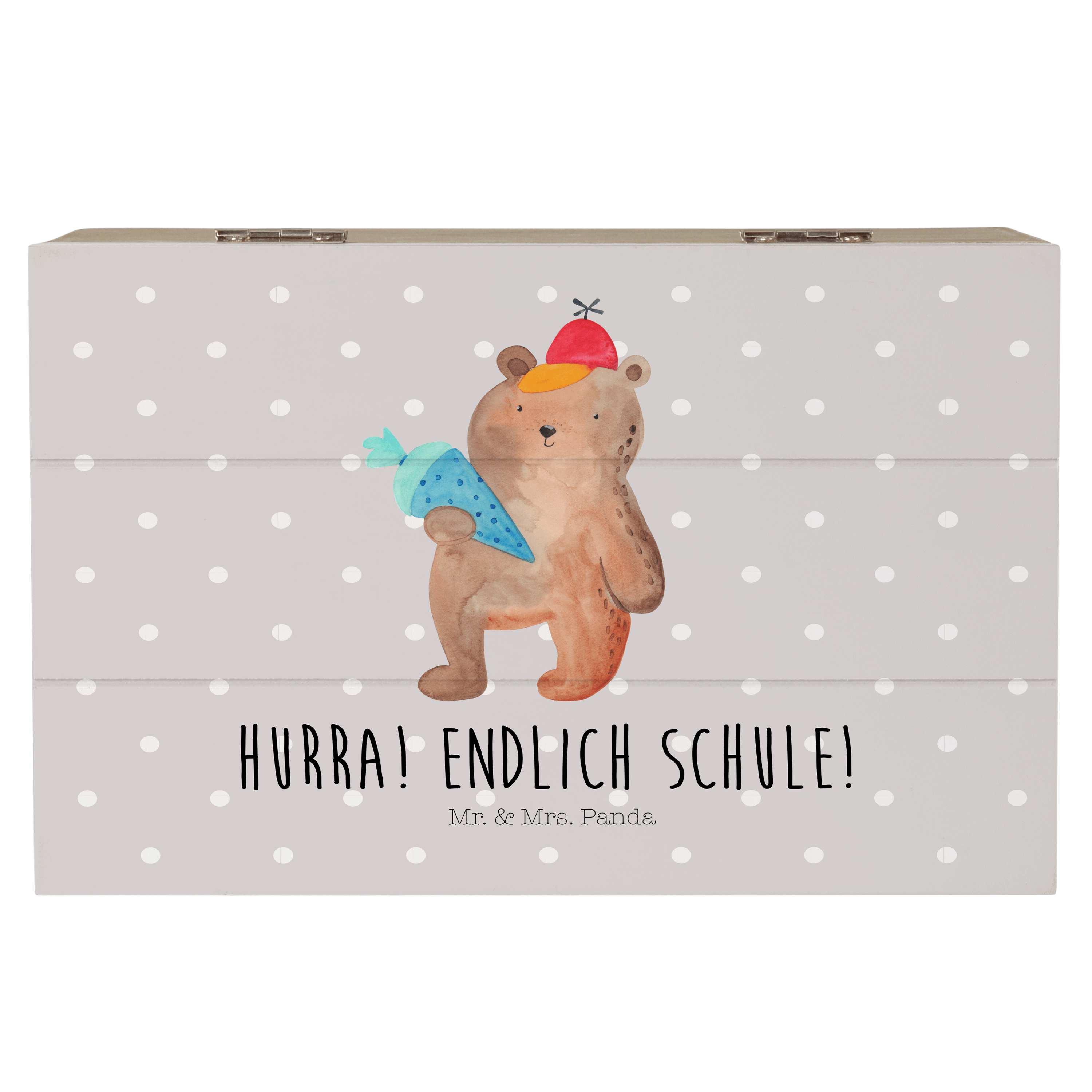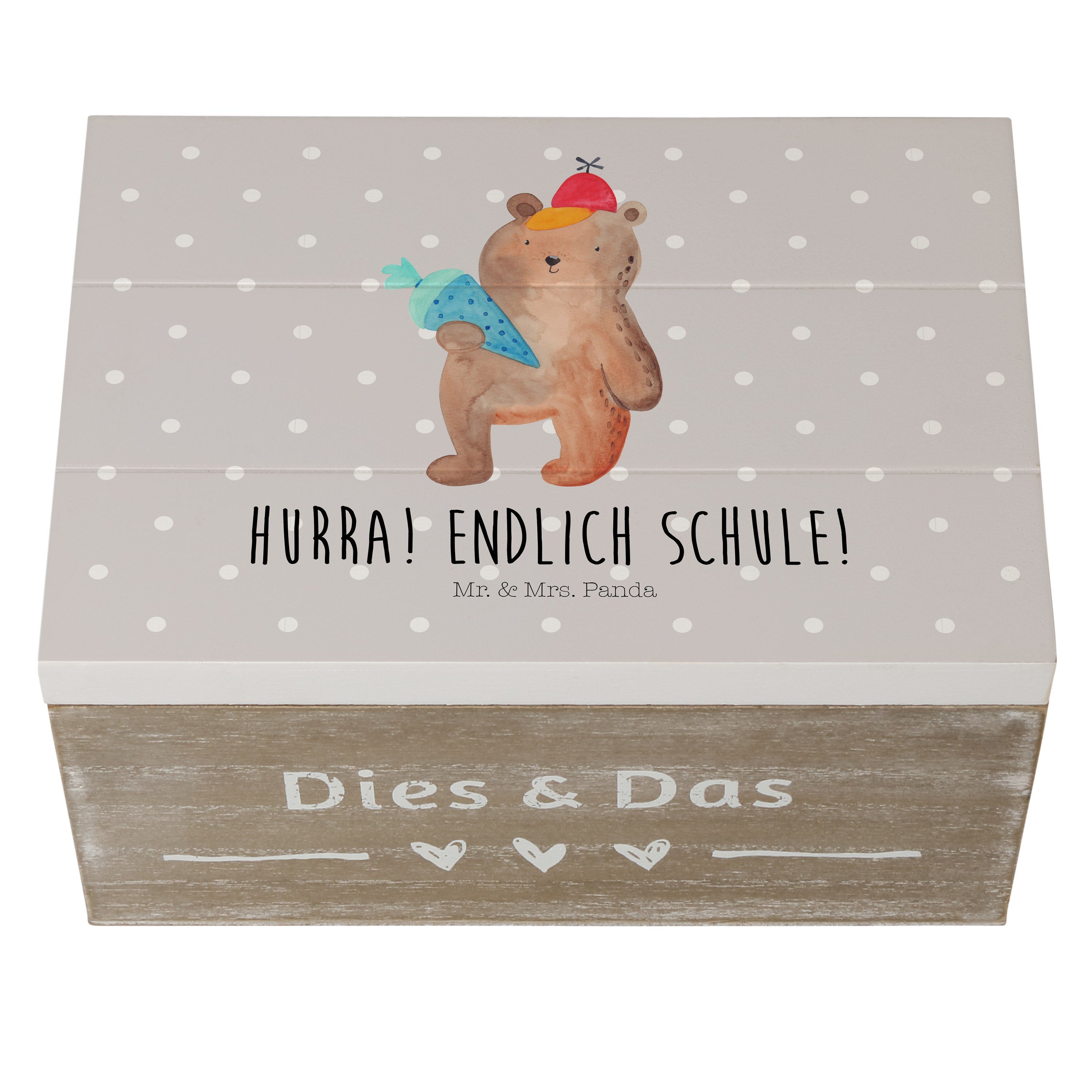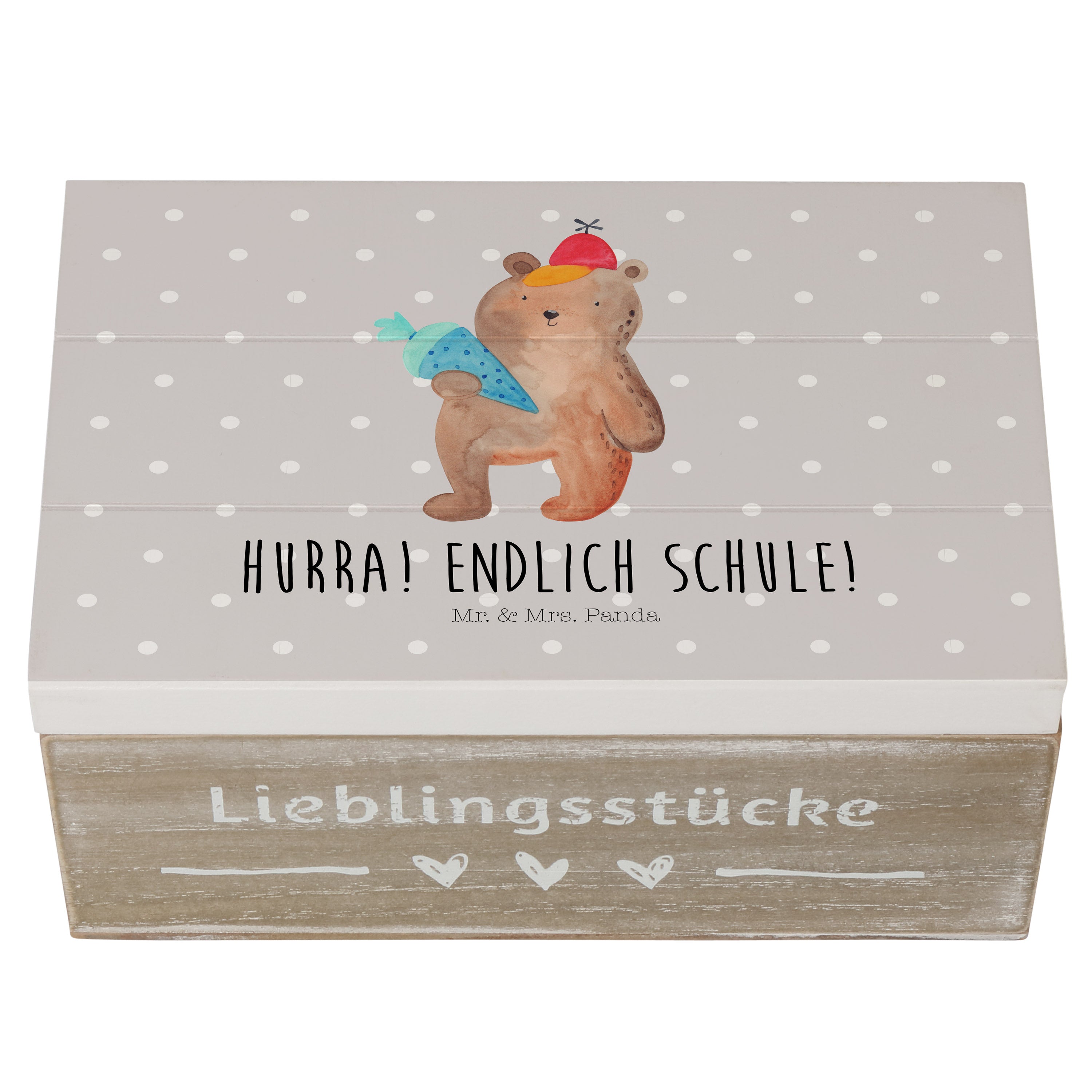 Holzkiste Bär mit Schultüte - 25 x 18 cm - mit Spruch - Grau Pastell